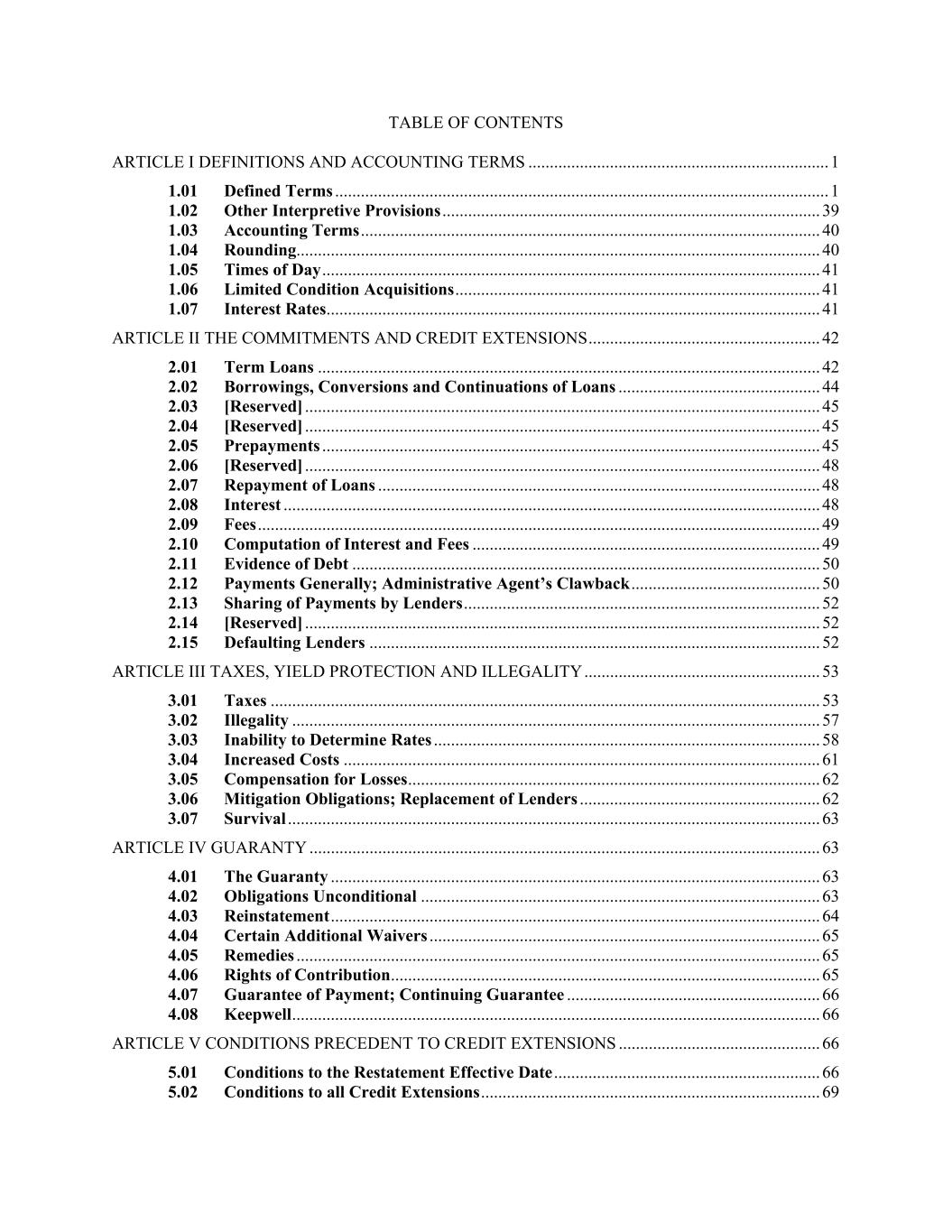 TABLE OF CONTENTS ARTICLE I DEFINITIONS AND ACCOUNTING TERMS ...................................................................... 1 1.01 Defined Terms ................................................................................................................... 1 1.02 Other Interpretive Provisions ........................................................................................ 39 1.03 Accounting Terms ........................................................................................................... 40 1.04 Rounding.......................................................................................................................... 40 1.05 Times of Day .................................................................................................................... 41 1.06 Limited Condition Acquisitions ..................................................................................... 41 1.07 Interest Rates ................................................................................................................... 41 ARTICLE II THE COMMITMENTS AND CREDIT EXTENSIONS ...................................................... 42 2.01 Term Loans ..................................................................................................................... 42 2.02 Borrowings, Conversions and Continuations of Loans ............................................... 44 2.03 [Reserved] ........................................................................................................................ 45 2.04 [Reserved] ........................................................................................................................ 45 2.05 Prepayments .................................................................................................................... 45 2.06 [Reserved] ........................................................................................................................ 48 2.07 Repayment of Loans ....................................................................................................... 48 2.08 Interest ............................................................................................................................. 48 2.09 Fees ................................................................................................................................... 49 2.10 Computation of Interest and Fees ................................................................................. 49 2.11 Evidence of Debt ............................................................................................................. 50 2.12 Payments Generally; Administrative Agent’s Clawback ............................................ 50 2.13 Sharing of Payments by Lenders ................................................................................... 52 2.14 [Reserved] ........................................................................................................................ 52 2.15 Defaulting Lenders ......................................................................................................... 52 ARTICLE III TAXES, YIELD PROTECTION AND ILLEGALITY ....................................................... 53 3.01 Taxes ................................................................................................................................ 53 3.02 Illegality ........................................................................................................................... 57 3.03 Inability to Determine Rates .......................................................................................... 58 3.04 Increased Costs ............................................................................................................... 61 3.05 Compensation for Losses ................................................................................................ 62 3.06 Mitigation Obligations; Replacement of Lenders ........................................................ 62 3.07 Survival ............................................................................................................................ 63 ARTICLE IV GUARANTY ....................................................................................................................... 63 4.01 The Guaranty .................................................................................................................. 63 4.02 Obligations Unconditional ............................................................................................. 63 4.03 Reinstatement .................................................................................................................. 64 4.04 Certain Additional Waivers ........................................................................................... 65 4.05 Remedies .......................................................................................................................... 65 4.06 Rights of Contribution .................................................................................................... 65 4.07 Guarantee of Payment; Continuing Guarantee ........................................................... 66 4.08 Keepwell ........................................................................................................................... 66 ARTICLE V CONDITIONS PRECEDENT TO CREDIT EXTENSIONS ............................................... 66 5.01 Conditions to the Restatement Effective Date .............................................................. 66 5.02 Conditions to all Credit Extensions ............................................................................... 69