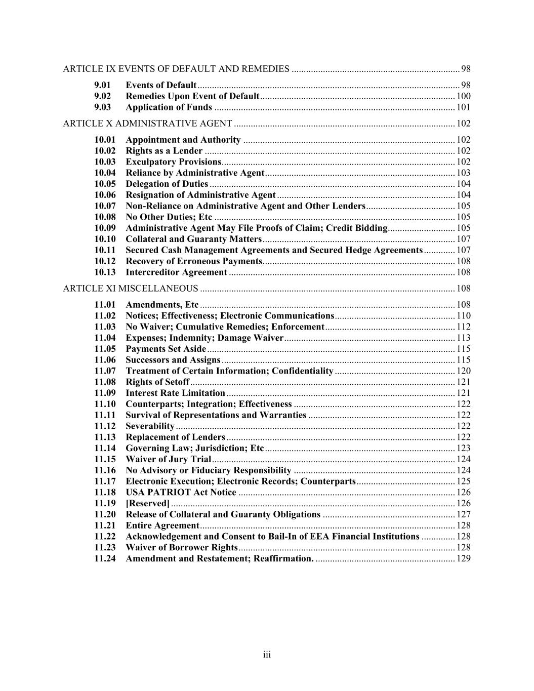 iii ARTICLE IX EVENTS OF DEFAULT AND REMEDIES ...................................................................... 98 9.01 Events of Default ............................................................................................................. 98 9.02 Remedies Upon Event of Default ................................................................................. 100 9.03 Application of Funds .................................................................................................... 101 ARTICLE X ADMINISTRATIVE AGENT ............................................................................................ 102 10.01 Appointment and Authority ........................................................................................ 102 10.02 Rights as a Lender ........................................................................................................ 102 10.03 Exculpatory Provisions ................................................................................................. 102 10.04 Reliance by Administrative Agent ............................................................................... 103 10.05 Delegation of Duties ...................................................................................................... 104 10.06 Resignation of Administrative Agent .......................................................................... 104 10.07 Non-Reliance on Administrative Agent and Other Lenders ..................................... 105 10.08 No Other Duties; Etc .................................................................................................... 105 10.09 Administrative Agent May File Proofs of Claim; Credit Bidding ............................ 105 10.10 Collateral and Guaranty Matters ................................................................................ 107 10.11 Secured Cash Management Agreements and Secured Hedge Agreements ............. 107 10.12 Recovery of Erroneous Payments ................................................................................ 108 10.13 Intercreditor Agreement .............................................................................................. 108 ARTICLE XI MISCELLANEOUS .......................................................................................................... 108 11.01 Amendments, Etc .......................................................................................................... 108 11.02 Notices; Effectiveness; Electronic Communications .................................................. 110 11.03 No Waiver; Cumulative Remedies; Enforcement ...................................................... 112 11.04 Expenses; Indemnity; Damage Waiver ....................................................................... 113 11.05 Payments Set Aside ....................................................................................................... 115 11.06 Successors and Assigns ................................................................................................. 115 11.07 Treatment of Certain Information; Confidentiality .................................................. 120 11.08 Rights of Setoff .............................................................................................................. 121 11.09 Interest Rate Limitation ............................................................................................... 121 11.10 Counterparts; Integration; Effectiveness ................................................................... 122 11.11 Survival of Representations and Warranties ............................................................. 122 11.12 Severability .................................................................................................................... 122 11.13 Replacement of Lenders ............................................................................................... 122 11.14 Governing Law; Jurisdiction; Etc ............................................................................... 123 11.15 Waiver of Jury Trial ..................................................................................................... 124 11.16 No Advisory or Fiduciary Responsibility ................................................................... 124 11.17 Electronic Execution; Electronic Records; Counterparts ......................................... 125 11.18 USA PATRIOT Act Notice .......................................................................................... 126 11.19 [Reserved] ...................................................................................................................... 126 11.20 Release of Collateral and Guaranty Obligations ....................................................... 127 11.21 Entire Agreement .......................................................................................................... 128 11.22 Acknowledgement and Consent to Bail-In of EEA Financial Institutions .............. 128 11.23 Waiver of Borrower Rights .......................................................................................... 128 11.24 Amendment and Restatement; Reaffirmation. .......................................................... 129