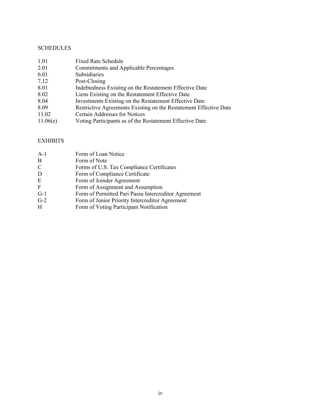 iv SCHEDULES 1.01 Fixed Rate Schedule 2.01 Commitments and Applicable Percentages 6.01 Subsidiaries 7.12 Post-Closing 8.01 Indebtedness Existing on the Restatement Effective Date 8.02 Liens Existing on the Restatement Effective Date 8.04 Investments Existing on the Restatement Effective Date 8.09 Restrictive Agreements Existing on the Restatement Effective Date 11.02 Certain Addresses for Notices 11.06(e) Voting Participants as of the Restatement Effective Date EXHIBITS A-1 Form of Loan Notice B Form of Note C Forms of U.S. Tax Compliance Certificates D Form of Compliance Certificate E Form of Joinder Agreement F Form of Assignment and Assumption G-1 Form of Permitted Pari Passu Intercreditor Agreement G-2 Form of Junior Priority Intercreditor Agreement H Form of Voting Participant Notification