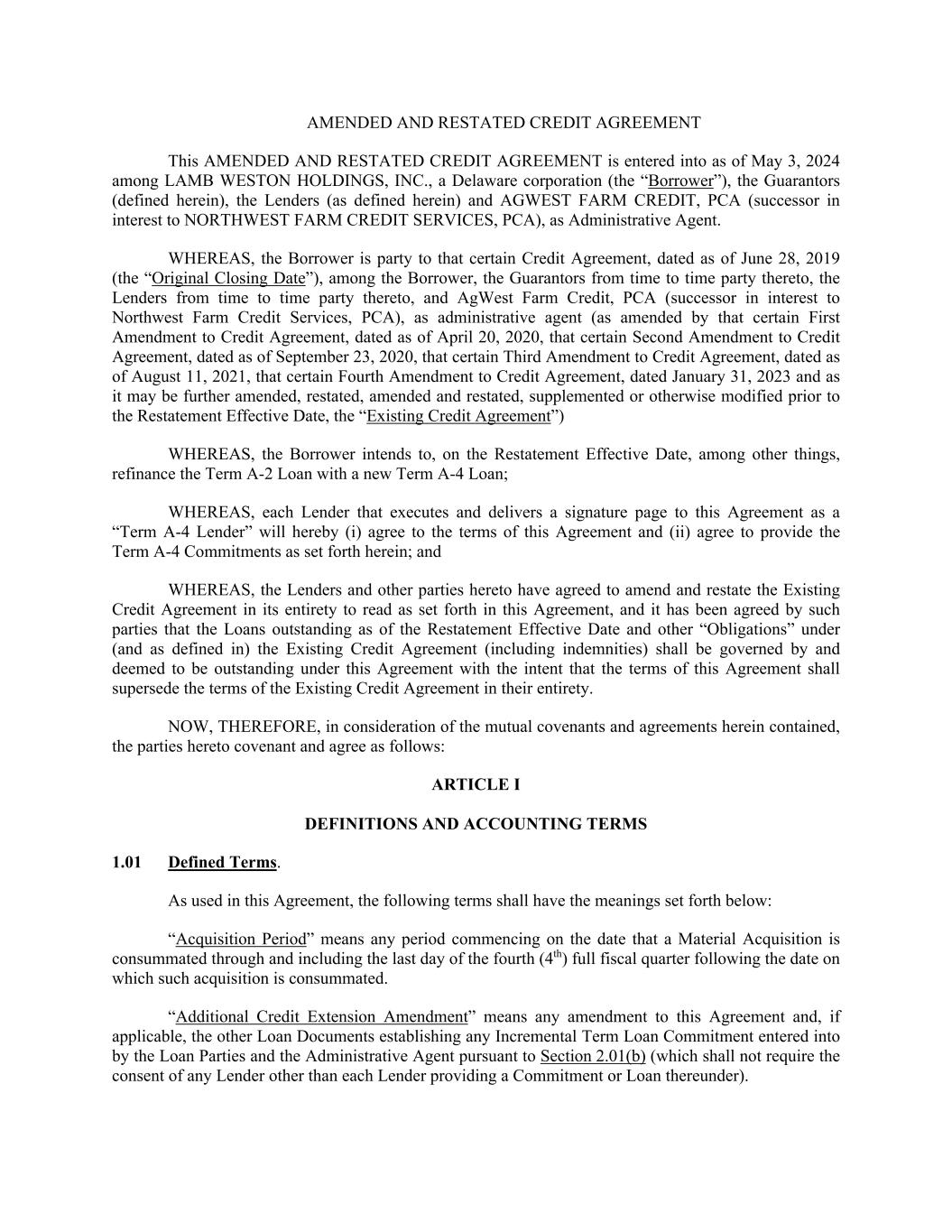 AMENDED AND RESTATED CREDIT AGREEMENT This AMENDED AND RESTATED CREDIT AGREEMENT is entered into as of May 3, 2024 among LAMB WESTON HOLDINGS, INC., a Delaware corporation (the “Borrower”), the Guarantors (defined herein), the Lenders (as defined herein) and AGWEST FARM CREDIT, PCA (successor in interest to NORTHWEST FARM CREDIT SERVICES, PCA), as Administrative Agent. WHEREAS, the Borrower is party to that certain Credit Agreement, dated as of June 28, 2019 (the “Original Closing Date”), among the Borrower, the Guarantors from time to time party thereto, the Lenders from time to time party thereto, and AgWest Farm Credit, PCA (successor in interest to Northwest Farm Credit Services, PCA), as administrative agent (as amended by that certain First Amendment to Credit Agreement, dated as of April 20, 2020, that certain Second Amendment to Credit Agreement, dated as of September 23, 2020, that certain Third Amendment to Credit Agreement, dated as of August 11, 2021, that certain Fourth Amendment to Credit Agreement, dated January 31, 2023 and as it may be further amended, restated, amended and restated, supplemented or otherwise modified prior to the Restatement Effective Date, the “Existing Credit Agreement”) WHEREAS, the Borrower intends to, on the Restatement Effective Date, among other things, refinance the Term A-2 Loan with a new Term A-4 Loan; WHEREAS, each Lender that executes and delivers a signature page to this Agreement as a “Term A-4 Lender” will hereby (i) agree to the terms of this Agreement and (ii) agree to provide the Term A-4 Commitments as set forth herein; and WHEREAS, the Lenders and other parties hereto have agreed to amend and restate the Existing Credit Agreement in its entirety to read as set forth in this Agreement, and it has been agreed by such parties that the Loans outstanding as of the Restatement Effective Date and other “Obligations” under (and as defined in) the Existing Credit Agreement (including indemnities) shall be governed by and deemed to be outstanding under this Agreement with the intent that the terms of this Agreement shall supersede the terms of the Existing Credit Agreement in their entirety. NOW, THEREFORE, in consideration of the mutual covenants and agreements herein contained, the parties hereto covenant and agree as follows: ARTICLE I DEFINITIONS AND ACCOUNTING TERMS 1.01 Defined Terms. As used in this Agreement, the following terms shall have the meanings set forth below: “Acquisition Period” means any period commencing on the date that a Material Acquisition is consummated through and including the last day of the fourth (4th) full fiscal quarter following the date on which such acquisition is consummated. “Additional Credit Extension Amendment” means any amendment to this Agreement and, if applicable, the other Loan Documents establishing any Incremental Term Loan Commitment entered into by the Loan Parties and the Administrative Agent pursuant to Section 2.01(b) (which shall not require the consent of any Lender other than each Lender providing a Commitment or Loan thereunder).