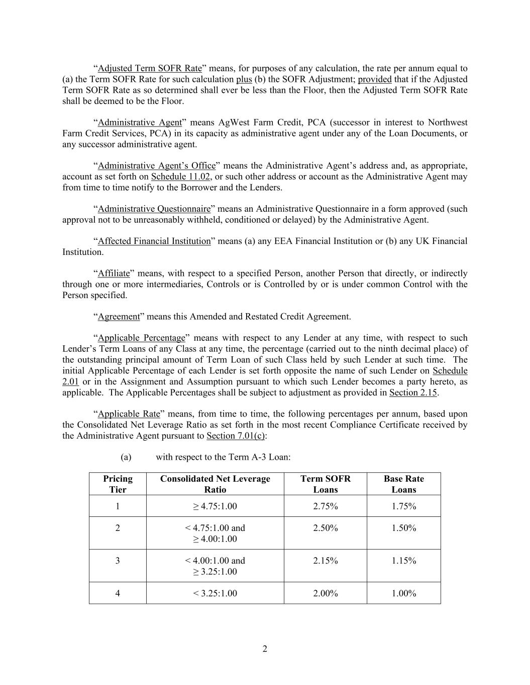 2 “Adjusted Term SOFR Rate” means, for purposes of any calculation, the rate per annum equal to (a) the Term SOFR Rate for such calculation plus (b) the SOFR Adjustment; provided that if the Adjusted Term SOFR Rate as so determined shall ever be less than the Floor, then the Adjusted Term SOFR Rate shall be deemed to be the Floor. “Administrative Agent” means AgWest Farm Credit, PCA (successor in interest to Northwest Farm Credit Services, PCA) in its capacity as administrative agent under any of the Loan Documents, or any successor administrative agent. “Administrative Agent’s Office” means the Administrative Agent’s address and, as appropriate, account as set forth on Schedule 11.02, or such other address or account as the Administrative Agent may from time to time notify to the Borrower and the Lenders. “Administrative Questionnaire” means an Administrative Questionnaire in a form approved (such approval not to be unreasonably withheld, conditioned or delayed) by the Administrative Agent. “Affected Financial Institution” means (a) any EEA Financial Institution or (b) any UK Financial Institution. “Affiliate” means, with respect to a specified Person, another Person that directly, or indirectly through one or more intermediaries, Controls or is Controlled by or is under common Control with the Person specified. “Agreement” means this Amended and Restated Credit Agreement. “Applicable Percentage” means with respect to any Lender at any time, with respect to such Lender’s Term Loans of any Class at any time, the percentage (carried out to the ninth decimal place) of the outstanding principal amount of Term Loan of such Class held by such Lender at such time. The initial Applicable Percentage of each Lender is set forth opposite the name of such Lender on Schedule 2.01 or in the Assignment and Assumption pursuant to which such Lender becomes a party hereto, as applicable. The Applicable Percentages shall be subject to adjustment as provided in Section 2.15. “Applicable Rate” means, from time to time, the following percentages per annum, based upon the Consolidated Net Leverage Ratio as set forth in the most recent Compliance Certificate received by the Administrative Agent pursuant to Section 7.01(c): (a) with respect to the Term A-3 Loan: Pricing Tier Consolidated Net Leverage Ratio Term SOFR Loans Base Rate Loans 1 ≥ 4.75:1.00 2.75% 1.75% 2 < 4.75:1.00 and ≥ 4.00:1.00 2.50% 1.50% 3 < 4.00:1.00 and ≥ 3.25:1.00 2.15% 1.15% 4 < 3.25:1.00 2.00% 1.00%