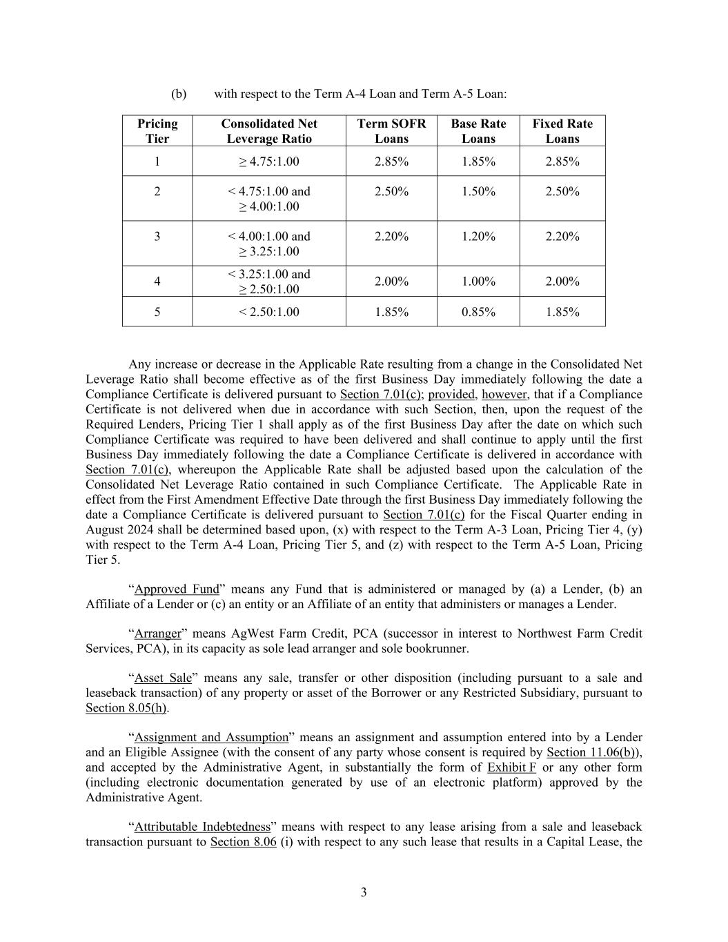 3 (b) with respect to the Term A-4 Loan and Term A-5 Loan: Pricing Tier Consolidated Net Leverage Ratio Term SOFR Loans Base Rate Loans Fixed Rate Loans 1 ≥ 4.75:1.00 2.85% 1.85% 2.85% 2 < 4.75:1.00 and ≥ 4.00:1.00 2.50% 1.50% 2.50% 3 < 4.00:1.00 and ≥ 3.25:1.00 2.20% 1.20% 2.20% 4 < 3.25:1.00 and ≥ 2.50:1.00 2.00% 1.00% 2.00% 5 < 2.50:1.00 1.85% 0.85% 1.85% Any increase or decrease in the Applicable Rate resulting from a change in the Consolidated Net Leverage Ratio shall become effective as of the first Business Day immediately following the date a Compliance Certificate is delivered pursuant to Section 7.01(c); provided, however, that if a Compliance Certificate is not delivered when due in accordance with such Section, then, upon the request of the Required Lenders, Pricing Tier 1 shall apply as of the first Business Day after the date on which such Compliance Certificate was required to have been delivered and shall continue to apply until the first Business Day immediately following the date a Compliance Certificate is delivered in accordance with Section 7.01(c), whereupon the Applicable Rate shall be adjusted based upon the calculation of the Consolidated Net Leverage Ratio contained in such Compliance Certificate. The Applicable Rate in effect from the First Amendment Effective Date through the first Business Day immediately following the date a Compliance Certificate is delivered pursuant to Section 7.01(c) for the Fiscal Quarter ending in August 2024 shall be determined based upon, (x) with respect to the Term A-3 Loan, Pricing Tier 4, (y) with respect to the Term A-4 Loan, Pricing Tier 5, and (z) with respect to the Term A-5 Loan, Pricing Tier 5. “Approved Fund” means any Fund that is administered or managed by (a) a Lender, (b) an Affiliate of a Lender or (c) an entity or an Affiliate of an entity that administers or manages a Lender. “Arranger” means AgWest Farm Credit, PCA (successor in interest to Northwest Farm Credit Services, PCA), in its capacity as sole lead arranger and sole bookrunner. “Asset Sale” means any sale, transfer or other disposition (including pursuant to a sale and leaseback transaction) of any property or asset of the Borrower or any Restricted Subsidiary, pursuant to Section 8.05(h). “Assignment and Assumption” means an assignment and assumption entered into by a Lender and an Eligible Assignee (with the consent of any party whose consent is required by Section 11.06(b)), and accepted by the Administrative Agent, in substantially the form of Exhibit F or any other form (including electronic documentation generated by use of an electronic platform) approved by the Administrative Agent. “Attributable Indebtedness” means with respect to any lease arising from a sale and leaseback transaction pursuant to Section 8.06 (i) with respect to any such lease that results in a Capital Lease, the