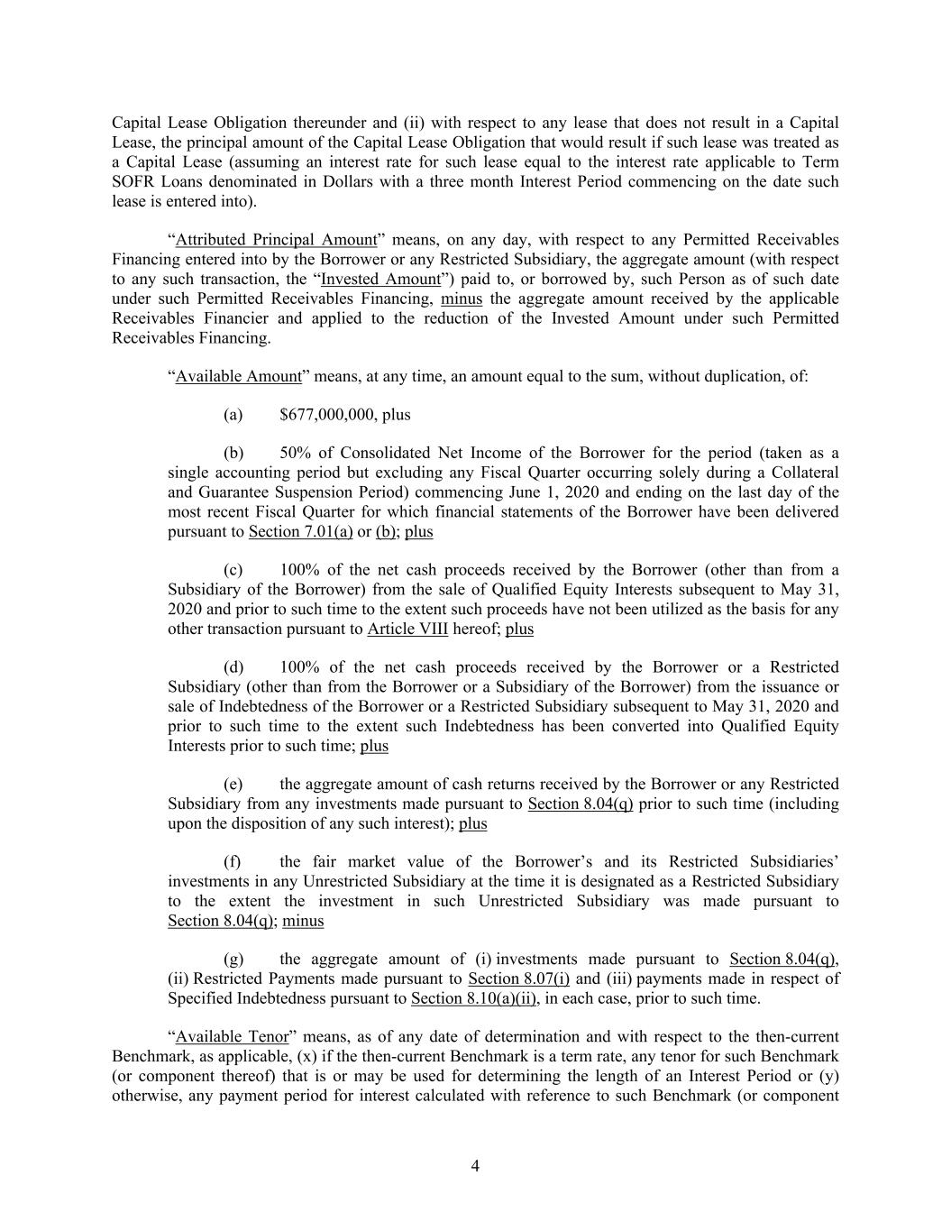 4 Capital Lease Obligation thereunder and (ii) with respect to any lease that does not result in a Capital Lease, the principal amount of the Capital Lease Obligation that would result if such lease was treated as a Capital Lease (assuming an interest rate for such lease equal to the interest rate applicable to Term SOFR Loans denominated in Dollars with a three month Interest Period commencing on the date such lease is entered into). “Attributed Principal Amount” means, on any day, with respect to any Permitted Receivables Financing entered into by the Borrower or any Restricted Subsidiary, the aggregate amount (with respect to any such transaction, the “Invested Amount”) paid to, or borrowed by, such Person as of such date under such Permitted Receivables Financing, minus the aggregate amount received by the applicable Receivables Financier and applied to the reduction of the Invested Amount under such Permitted Receivables Financing. “Available Amount” means, at any time, an amount equal to the sum, without duplication, of: (a) $677,000,000, plus (b) 50% of Consolidated Net Income of the Borrower for the period (taken as a single accounting period but excluding any Fiscal Quarter occurring solely during a Collateral and Guarantee Suspension Period) commencing June 1, 2020 and ending on the last day of the most recent Fiscal Quarter for which financial statements of the Borrower have been delivered pursuant to Section 7.01(a) or (b); plus (c) 100% of the net cash proceeds received by the Borrower (other than from a Subsidiary of the Borrower) from the sale of Qualified Equity Interests subsequent to May 31, 2020 and prior to such time to the extent such proceeds have not been utilized as the basis for any other transaction pursuant to Article VIII hereof; plus (d) 100% of the net cash proceeds received by the Borrower or a Restricted Subsidiary (other than from the Borrower or a Subsidiary of the Borrower) from the issuance or sale of Indebtedness of the Borrower or a Restricted Subsidiary subsequent to May 31, 2020 and prior to such time to the extent such Indebtedness has been converted into Qualified Equity Interests prior to such time; plus (e) the aggregate amount of cash returns received by the Borrower or any Restricted Subsidiary from any investments made pursuant to Section 8.04(q) prior to such time (including upon the disposition of any such interest); plus (f) the fair market value of the Borrower’s and its Restricted Subsidiaries’ investments in any Unrestricted Subsidiary at the time it is designated as a Restricted Subsidiary to the extent the investment in such Unrestricted Subsidiary was made pursuant to Section 8.04(q); minus (g) the aggregate amount of (i) investments made pursuant to Section 8.04(q), (ii) Restricted Payments made pursuant to Section 8.07(i) and (iii) payments made in respect of Specified Indebtedness pursuant to Section 8.10(a)(ii), in each case, prior to such time. “Available Tenor” means, as of any date of determination and with respect to the then-current Benchmark, as applicable, (x) if the then-current Benchmark is a term rate, any tenor for such Benchmark (or component thereof) that is or may be used for determining the length of an Interest Period or (y) otherwise, any payment period for interest calculated with reference to such Benchmark (or component