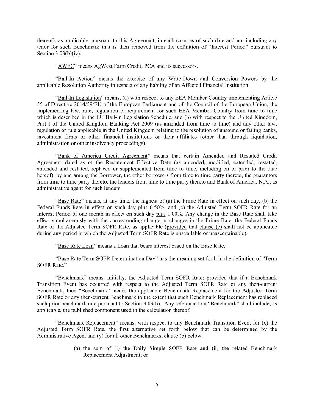 5 thereof), as applicable, pursuant to this Agreement, in each case, as of such date and not including any tenor for such Benchmark that is then removed from the definition of “Interest Period” pursuant to Section 3.03(b)(iv). “AWFC” means AgWest Farm Credit, PCA and its successors. “Bail-In Action” means the exercise of any Write-Down and Conversion Powers by the applicable Resolution Authority in respect of any liability of an Affected Financial Institution. “Bail-In Legislation” means, (a) with respect to any EEA Member Country implementing Article 55 of Directive 2014/59/EU of the European Parliament and of the Council of the European Union, the implementing law, rule, regulation or requirement for such EEA Member Country from time to time which is described in the EU Bail-In Legislation Schedule, and (b) with respect to the United Kingdom, Part I of the United Kingdom Banking Act 2009 (as amended from time to time) and any other law, regulation or rule applicable in the United Kingdom relating to the resolution of unsound or failing banks, investment firms or other financial institutions or their affiliates (other than through liquidation, administration or other insolvency proceedings). “Bank of America Credit Agreement” means that certain Amended and Restated Credit Agreement dated as of the Restatement Effective Date (as amended, modified, extended, restated, amended and restated, replaced or supplemented from time to time, including on or prior to the date hereof), by and among the Borrower, the other borrowers from time to time party thereto, the guarantors from time to time party thereto, the lenders from time to time party thereto and Bank of America, N.A., as administrative agent for such lenders. “Base Rate” means, at any time, the highest of (a) the Prime Rate in effect on such day, (b) the Federal Funds Rate in effect on such day plus 0.50%, and (c) the Adjusted Term SOFR Rate for an Interest Period of one month in effect on such day plus 1.00%. Any change in the Base Rate shall take effect simultaneously with the corresponding change or changes in the Prime Rate, the Federal Funds Rate or the Adjusted Term SOFR Rate, as applicable (provided that clause (c) shall not be applicable during any period in which the Adjusted Term SOFR Rate is unavailable or unascertainable). “Base Rate Loan” means a Loan that bears interest based on the Base Rate. “Base Rate Term SOFR Determination Day” has the meaning set forth in the definition of “Term SOFR Rate.” “Benchmark” means, initially, the Adjusted Term SOFR Rate; provided that if a Benchmark Transition Event has occurred with respect to the Adjusted Term SOFR Rate or any then-current Benchmark, then “Benchmark” means the applicable Benchmark Replacement for the Adjusted Term SOFR Rate or any then-current Benchmark to the extent that such Benchmark Replacement has replaced such prior benchmark rate pursuant to Section 3.03(b). Any reference to a “Benchmark” shall include, as applicable, the published component used in the calculation thereof. “Benchmark Replacement” means, with respect to any Benchmark Transition Event for (x) the Adjusted Term SOFR Rate, the first alternative set forth below that can be determined by the Administrative Agent and (y) for all other Benchmarks, clause (b) below: (a) the sum of (i) the Daily Simple SOFR Rate and (ii) the related Benchmark Replacement Adjustment; or