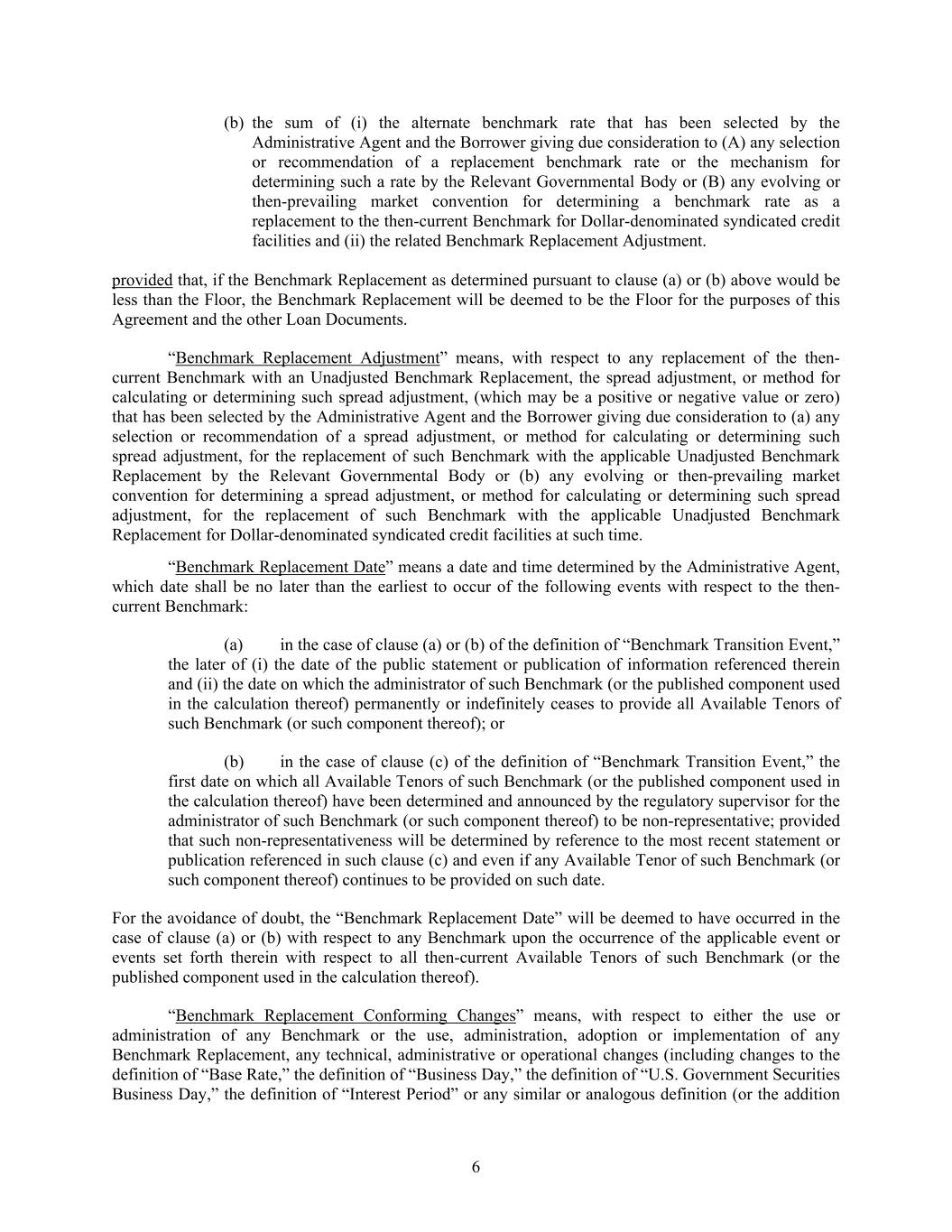6 (b) the sum of (i) the alternate benchmark rate that has been selected by the Administrative Agent and the Borrower giving due consideration to (A) any selection or recommendation of a replacement benchmark rate or the mechanism for determining such a rate by the Relevant Governmental Body or (B) any evolving or then-prevailing market convention for determining a benchmark rate as a replacement to the then-current Benchmark for Dollar-denominated syndicated credit facilities and (ii) the related Benchmark Replacement Adjustment. provided that, if the Benchmark Replacement as determined pursuant to clause (a) or (b) above would be less than the Floor, the Benchmark Replacement will be deemed to be the Floor for the purposes of this Agreement and the other Loan Documents. “Benchmark Replacement Adjustment” means, with respect to any replacement of the then- current Benchmark with an Unadjusted Benchmark Replacement, the spread adjustment, or method for calculating or determining such spread adjustment, (which may be a positive or negative value or zero) that has been selected by the Administrative Agent and the Borrower giving due consideration to (a) any selection or recommendation of a spread adjustment, or method for calculating or determining such spread adjustment, for the replacement of such Benchmark with the applicable Unadjusted Benchmark Replacement by the Relevant Governmental Body or (b) any evolving or then-prevailing market convention for determining a spread adjustment, or method for calculating or determining such spread adjustment, for the replacement of such Benchmark with the applicable Unadjusted Benchmark Replacement for Dollar-denominated syndicated credit facilities at such time. “Benchmark Replacement Date” means a date and time determined by the Administrative Agent, which date shall be no later than the earliest to occur of the following events with respect to the then- current Benchmark: (a) in the case of clause (a) or (b) of the definition of “Benchmark Transition Event,” the later of (i) the date of the public statement or publication of information referenced therein and (ii) the date on which the administrator of such Benchmark (or the published component used in the calculation thereof) permanently or indefinitely ceases to provide all Available Tenors of such Benchmark (or such component thereof); or (b) in the case of clause (c) of the definition of “Benchmark Transition Event,” the first date on which all Available Tenors of such Benchmark (or the published component used in the calculation thereof) have been determined and announced by the regulatory supervisor for the administrator of such Benchmark (or such component thereof) to be non-representative; provided that such non-representativeness will be determined by reference to the most recent statement or publication referenced in such clause (c) and even if any Available Tenor of such Benchmark (or such component thereof) continues to be provided on such date. For the avoidance of doubt, the “Benchmark Replacement Date” will be deemed to have occurred in the case of clause (a) or (b) with respect to any Benchmark upon the occurrence of the applicable event or events set forth therein with respect to all then-current Available Tenors of such Benchmark (or the published component used in the calculation thereof). “Benchmark Replacement Conforming Changes” means, with respect to either the use or administration of any Benchmark or the use, administration, adoption or implementation of any Benchmark Replacement, any technical, administrative or operational changes (including changes to the definition of “Base Rate,” the definition of “Business Day,” the definition of “U.S. Government Securities Business Day,” the definition of “Interest Period” or any similar or analogous definition (or the addition