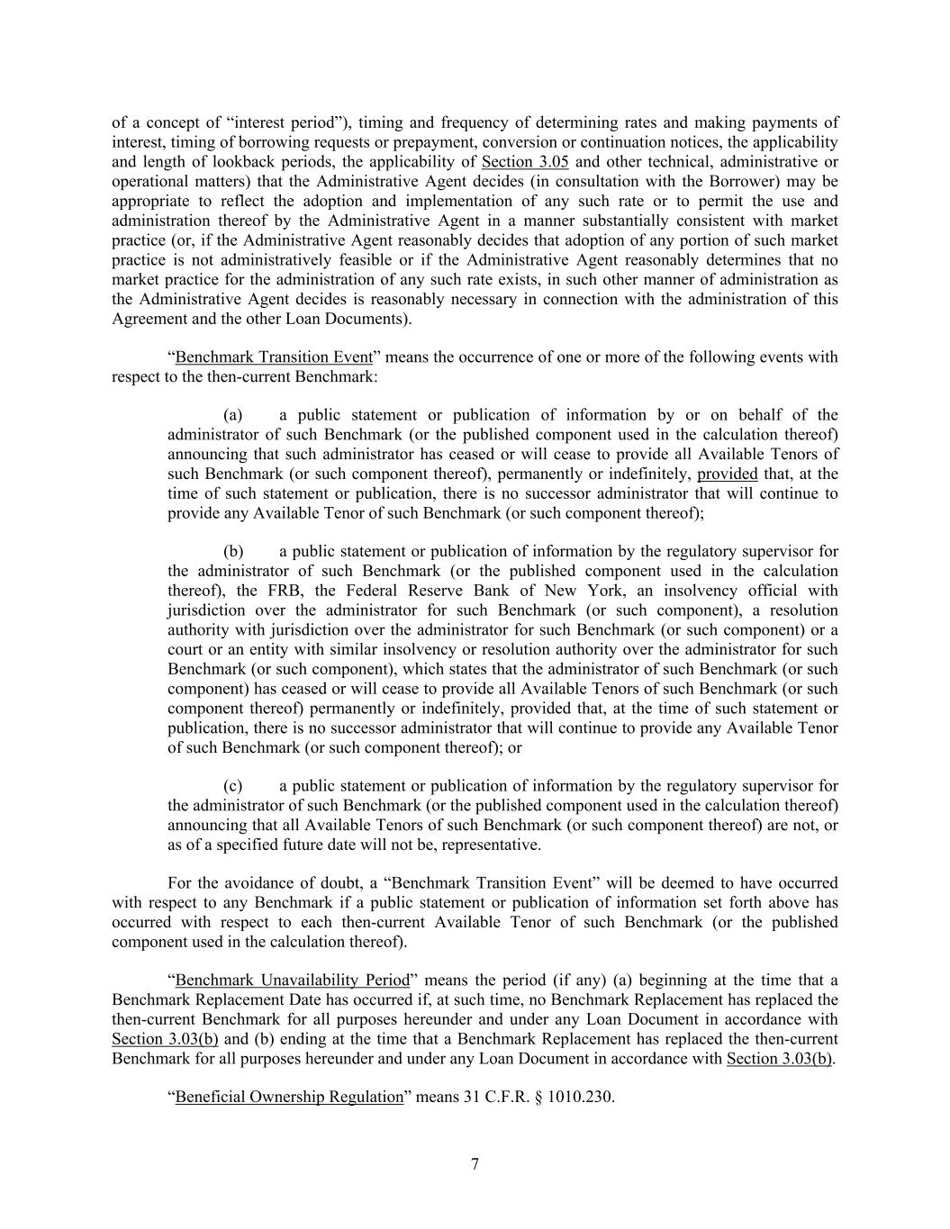 7 of a concept of “interest period”), timing and frequency of determining rates and making payments of interest, timing of borrowing requests or prepayment, conversion or continuation notices, the applicability and length of lookback periods, the applicability of Section 3.05 and other technical, administrative or operational matters) that the Administrative Agent decides (in consultation with the Borrower) may be appropriate to reflect the adoption and implementation of any such rate or to permit the use and administration thereof by the Administrative Agent in a manner substantially consistent with market practice (or, if the Administrative Agent reasonably decides that adoption of any portion of such market practice is not administratively feasible or if the Administrative Agent reasonably determines that no market practice for the administration of any such rate exists, in such other manner of administration as the Administrative Agent decides is reasonably necessary in connection with the administration of this Agreement and the other Loan Documents). “Benchmark Transition Event” means the occurrence of one or more of the following events with respect to the then-current Benchmark: (a) a public statement or publication of information by or on behalf of the administrator of such Benchmark (or the published component used in the calculation thereof) announcing that such administrator has ceased or will cease to provide all Available Tenors of such Benchmark (or such component thereof), permanently or indefinitely, provided that, at the time of such statement or publication, there is no successor administrator that will continue to provide any Available Tenor of such Benchmark (or such component thereof); (b) a public statement or publication of information by the regulatory supervisor for the administrator of such Benchmark (or the published component used in the calculation thereof), the FRB, the Federal Reserve Bank of New York, an insolvency official with jurisdiction over the administrator for such Benchmark (or such component), a resolution authority with jurisdiction over the administrator for such Benchmark (or such component) or a court or an entity with similar insolvency or resolution authority over the administrator for such Benchmark (or such component), which states that the administrator of such Benchmark (or such component) has ceased or will cease to provide all Available Tenors of such Benchmark (or such component thereof) permanently or indefinitely, provided that, at the time of such statement or publication, there is no successor administrator that will continue to provide any Available Tenor of such Benchmark (or such component thereof); or (c) a public statement or publication of information by the regulatory supervisor for the administrator of such Benchmark (or the published component used in the calculation thereof) announcing that all Available Tenors of such Benchmark (or such component thereof) are not, or as of a specified future date will not be, representative. For the avoidance of doubt, a “Benchmark Transition Event” will be deemed to have occurred with respect to any Benchmark if a public statement or publication of information set forth above has occurred with respect to each then-current Available Tenor of such Benchmark (or the published component used in the calculation thereof). “Benchmark Unavailability Period” means the period (if any) (a) beginning at the time that a Benchmark Replacement Date has occurred if, at such time, no Benchmark Replacement has replaced the then-current Benchmark for all purposes hereunder and under any Loan Document in accordance with Section 3.03(b) and (b) ending at the time that a Benchmark Replacement has replaced the then-current Benchmark for all purposes hereunder and under any Loan Document in accordance with Section 3.03(b). “Beneficial Ownership Regulation” means 31 C.F.R. § 1010.230.