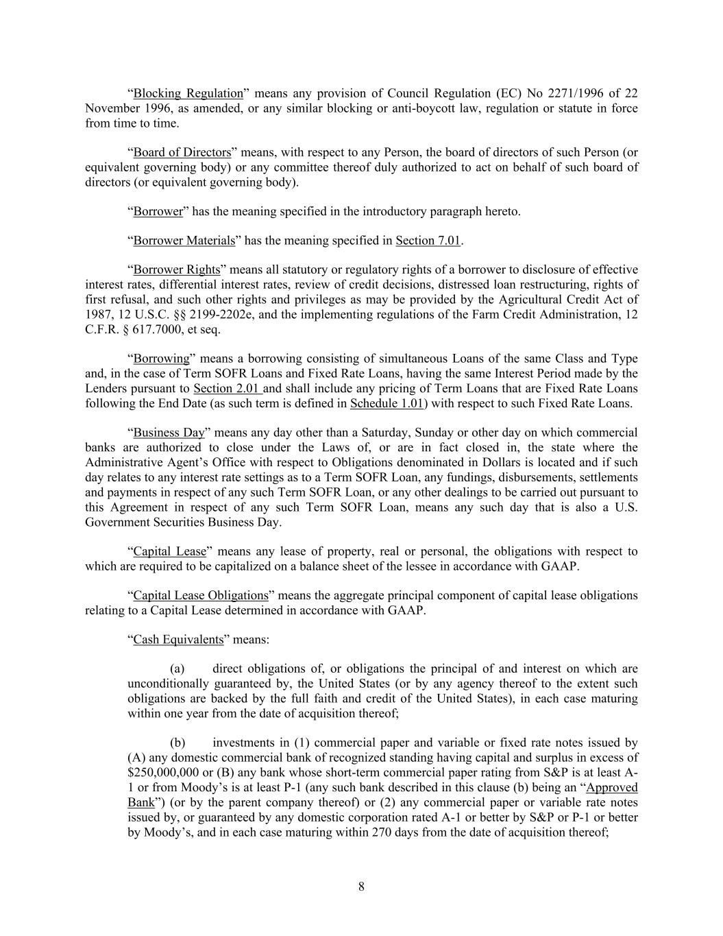 8 “Blocking Regulation” means any provision of Council Regulation (EC) No 2271/1996 of 22 November 1996, as amended, or any similar blocking or anti-boycott law, regulation or statute in force from time to time. “Board of Directors” means, with respect to any Person, the board of directors of such Person (or equivalent governing body) or any committee thereof duly authorized to act on behalf of such board of directors (or equivalent governing body). “Borrower” has the meaning specified in the introductory paragraph hereto. “Borrower Materials” has the meaning specified in Section 7.01. “Borrower Rights” means all statutory or regulatory rights of a borrower to disclosure of effective interest rates, differential interest rates, review of credit decisions, distressed loan restructuring, rights of first refusal, and such other rights and privileges as may be provided by the Agricultural Credit Act of 1987, 12 U.S.C. §§ 2199-2202e, and the implementing regulations of the Farm Credit Administration, 12 C.F.R. § 617.7000, et seq. “Borrowing” means a borrowing consisting of simultaneous Loans of the same Class and Type and, in the case of Term SOFR Loans and Fixed Rate Loans, having the same Interest Period made by the Lenders pursuant to Section 2.01 and shall include any pricing of Term Loans that are Fixed Rate Loans following the End Date (as such term is defined in Schedule 1.01) with respect to such Fixed Rate Loans. “Business Day” means any day other than a Saturday, Sunday or other day on which commercial banks are authorized to close under the Laws of, or are in fact closed in, the state where the Administrative Agent’s Office with respect to Obligations denominated in Dollars is located and if such day relates to any interest rate settings as to a Term SOFR Loan, any fundings, disbursements, settlements and payments in respect of any such Term SOFR Loan, or any other dealings to be carried out pursuant to this Agreement in respect of any such Term SOFR Loan, means any such day that is also a U.S. Government Securities Business Day. “Capital Lease” means any lease of property, real or personal, the obligations with respect to which are required to be capitalized on a balance sheet of the lessee in accordance with GAAP. “Capital Lease Obligations” means the aggregate principal component of capital lease obligations relating to a Capital Lease determined in accordance with GAAP. “Cash Equivalents” means: (a) direct obligations of, or obligations the principal of and interest on which are unconditionally guaranteed by, the United States (or by any agency thereof to the extent such obligations are backed by the full faith and credit of the United States), in each case maturing within one year from the date of acquisition thereof; (b) investments in (1) commercial paper and variable or fixed rate notes issued by (A) any domestic commercial bank of recognized standing having capital and surplus in excess of $250,000,000 or (B) any bank whose short-term commercial paper rating from S&P is at least A- 1 or from Moody’s is at least P-1 (any such bank described in this clause (b) being an “Approved Bank”) (or by the parent company thereof) or (2) any commercial paper or variable rate notes issued by, or guaranteed by any domestic corporation rated A-1 or better by S&P or P-1 or better by Moody’s, and in each case maturing within 270 days from the date of acquisition thereof;