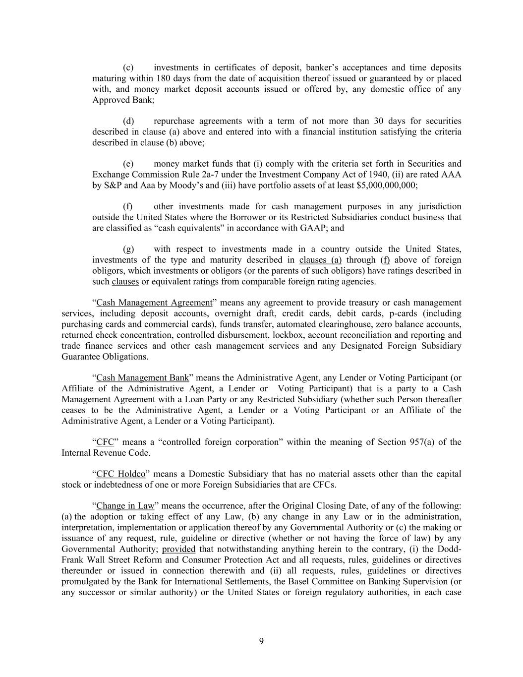 9 (c) investments in certificates of deposit, banker’s acceptances and time deposits maturing within 180 days from the date of acquisition thereof issued or guaranteed by or placed with, and money market deposit accounts issued or offered by, any domestic office of any Approved Bank; (d) repurchase agreements with a term of not more than 30 days for securities described in clause (a) above and entered into with a financial institution satisfying the criteria described in clause (b) above; (e) money market funds that (i) comply with the criteria set forth in Securities and Exchange Commission Rule 2a-7 under the Investment Company Act of 1940, (ii) are rated AAA by S&P and Aaa by Moody’s and (iii) have portfolio assets of at least $5,000,000,000; (f) other investments made for cash management purposes in any jurisdiction outside the United States where the Borrower or its Restricted Subsidiaries conduct business that are classified as “cash equivalents” in accordance with GAAP; and (g) with respect to investments made in a country outside the United States, investments of the type and maturity described in clauses (a) through (f) above of foreign obligors, which investments or obligors (or the parents of such obligors) have ratings described in such clauses or equivalent ratings from comparable foreign rating agencies. “Cash Management Agreement” means any agreement to provide treasury or cash management services, including deposit accounts, overnight draft, credit cards, debit cards, p-cards (including purchasing cards and commercial cards), funds transfer, automated clearinghouse, zero balance accounts, returned check concentration, controlled disbursement, lockbox, account reconciliation and reporting and trade finance services and other cash management services and any Designated Foreign Subsidiary Guarantee Obligations. “Cash Management Bank” means the Administrative Agent, any Lender or Voting Participant (or Affiliate of the Administrative Agent, a Lender or Voting Participant) that is a party to a Cash Management Agreement with a Loan Party or any Restricted Subsidiary (whether such Person thereafter ceases to be the Administrative Agent, a Lender or a Voting Participant or an Affiliate of the Administrative Agent, a Lender or a Voting Participant). “CFC” means a “controlled foreign corporation” within the meaning of Section 957(a) of the Internal Revenue Code. “CFC Holdco” means a Domestic Subsidiary that has no material assets other than the capital stock or indebtedness of one or more Foreign Subsidiaries that are CFCs. “Change in Law” means the occurrence, after the Original Closing Date, of any of the following: (a) the adoption or taking effect of any Law, (b) any change in any Law or in the administration, interpretation, implementation or application thereof by any Governmental Authority or (c) the making or issuance of any request, rule, guideline or directive (whether or not having the force of law) by any Governmental Authority; provided that notwithstanding anything herein to the contrary, (i) the Dodd- Frank Wall Street Reform and Consumer Protection Act and all requests, rules, guidelines or directives thereunder or issued in connection therewith and (ii) all requests, rules, guidelines or directives promulgated by the Bank for International Settlements, the Basel Committee on Banking Supervision (or any successor or similar authority) or the United States or foreign regulatory authorities, in each case