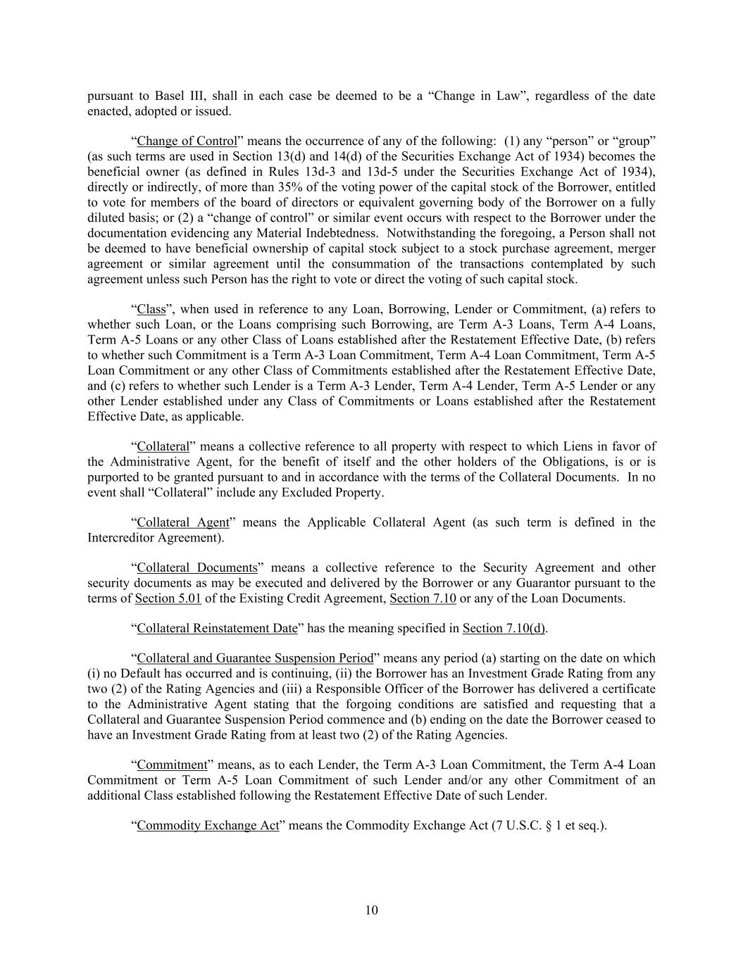10 pursuant to Basel III, shall in each case be deemed to be a “Change in Law”, regardless of the date enacted, adopted or issued. “Change of Control” means the occurrence of any of the following: (1) any “person” or “group” (as such terms are used in Section 13(d) and 14(d) of the Securities Exchange Act of 1934) becomes the beneficial owner (as defined in Rules 13d-3 and 13d-5 under the Securities Exchange Act of 1934), directly or indirectly, of more than 35% of the voting power of the capital stock of the Borrower, entitled to vote for members of the board of directors or equivalent governing body of the Borrower on a fully diluted basis; or (2) a “change of control” or similar event occurs with respect to the Borrower under the documentation evidencing any Material Indebtedness. Notwithstanding the foregoing, a Person shall not be deemed to have beneficial ownership of capital stock subject to a stock purchase agreement, merger agreement or similar agreement until the consummation of the transactions contemplated by such agreement unless such Person has the right to vote or direct the voting of such capital stock. “Class”, when used in reference to any Loan, Borrowing, Lender or Commitment, (a) refers to whether such Loan, or the Loans comprising such Borrowing, are Term A-3 Loans, Term A-4 Loans, Term A-5 Loans or any other Class of Loans established after the Restatement Effective Date, (b) refers to whether such Commitment is a Term A-3 Loan Commitment, Term A-4 Loan Commitment, Term A-5 Loan Commitment or any other Class of Commitments established after the Restatement Effective Date, and (c) refers to whether such Lender is a Term A-3 Lender, Term A-4 Lender, Term A-5 Lender or any other Lender established under any Class of Commitments or Loans established after the Restatement Effective Date, as applicable. “Collateral” means a collective reference to all property with respect to which Liens in favor of the Administrative Agent, for the benefit of itself and the other holders of the Obligations, is or is purported to be granted pursuant to and in accordance with the terms of the Collateral Documents. In no event shall “Collateral” include any Excluded Property. “Collateral Agent” means the Applicable Collateral Agent (as such term is defined in the Intercreditor Agreement). “Collateral Documents” means a collective reference to the Security Agreement and other security documents as may be executed and delivered by the Borrower or any Guarantor pursuant to the terms of Section 5.01 of the Existing Credit Agreement, Section 7.10 or any of the Loan Documents. “Collateral Reinstatement Date” has the meaning specified in Section 7.10(d). “Collateral and Guarantee Suspension Period” means any period (a) starting on the date on which (i) no Default has occurred and is continuing, (ii) the Borrower has an Investment Grade Rating from any two (2) of the Rating Agencies and (iii) a Responsible Officer of the Borrower has delivered a certificate to the Administrative Agent stating that the forgoing conditions are satisfied and requesting that a Collateral and Guarantee Suspension Period commence and (b) ending on the date the Borrower ceased to have an Investment Grade Rating from at least two (2) of the Rating Agencies. “Commitment” means, as to each Lender, the Term A-3 Loan Commitment, the Term A-4 Loan Commitment or Term A-5 Loan Commitment of such Lender and/or any other Commitment of an additional Class established following the Restatement Effective Date of such Lender. “Commodity Exchange Act” means the Commodity Exchange Act (7 U.S.C. § 1 et seq.).