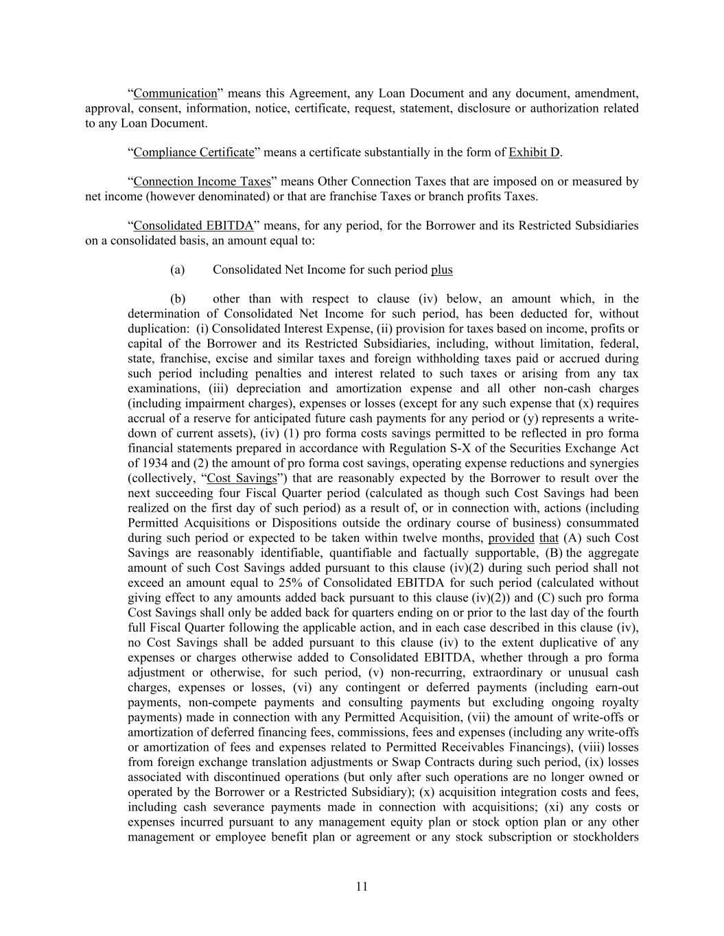 11 “Communication” means this Agreement, any Loan Document and any document, amendment, approval, consent, information, notice, certificate, request, statement, disclosure or authorization related to any Loan Document. “Compliance Certificate” means a certificate substantially in the form of Exhibit D. “Connection Income Taxes” means Other Connection Taxes that are imposed on or measured by net income (however denominated) or that are franchise Taxes or branch profits Taxes. “Consolidated EBITDA” means, for any period, for the Borrower and its Restricted Subsidiaries on a consolidated basis, an amount equal to: (a) Consolidated Net Income for such period plus (b) other than with respect to clause (iv) below, an amount which, in the determination of Consolidated Net Income for such period, has been deducted for, without duplication: (i) Consolidated Interest Expense, (ii) provision for taxes based on income, profits or capital of the Borrower and its Restricted Subsidiaries, including, without limitation, federal, state, franchise, excise and similar taxes and foreign withholding taxes paid or accrued during such period including penalties and interest related to such taxes or arising from any tax examinations, (iii) depreciation and amortization expense and all other non-cash charges (including impairment charges), expenses or losses (except for any such expense that (x) requires accrual of a reserve for anticipated future cash payments for any period or (y) represents a write- down of current assets), (iv) (1) pro forma costs savings permitted to be reflected in pro forma financial statements prepared in accordance with Regulation S-X of the Securities Exchange Act of 1934 and (2) the amount of pro forma cost savings, operating expense reductions and synergies (collectively, “Cost Savings”) that are reasonably expected by the Borrower to result over the next succeeding four Fiscal Quarter period (calculated as though such Cost Savings had been realized on the first day of such period) as a result of, or in connection with, actions (including Permitted Acquisitions or Dispositions outside the ordinary course of business) consummated during such period or expected to be taken within twelve months, provided that (A) such Cost Savings are reasonably identifiable, quantifiable and factually supportable, (B) the aggregate amount of such Cost Savings added pursuant to this clause (iv)(2) during such period shall not exceed an amount equal to 25% of Consolidated EBITDA for such period (calculated without giving effect to any amounts added back pursuant to this clause (iv)(2)) and (C) such pro forma Cost Savings shall only be added back for quarters ending on or prior to the last day of the fourth full Fiscal Quarter following the applicable action, and in each case described in this clause (iv), no Cost Savings shall be added pursuant to this clause (iv) to the extent duplicative of any expenses or charges otherwise added to Consolidated EBITDA, whether through a pro forma adjustment or otherwise, for such period, (v) non-recurring, extraordinary or unusual cash charges, expenses or losses, (vi) any contingent or deferred payments (including earn-out payments, non-compete payments and consulting payments but excluding ongoing royalty payments) made in connection with any Permitted Acquisition, (vii) the amount of write-offs or amortization of deferred financing fees, commissions, fees and expenses (including any write-offs or amortization of fees and expenses related to Permitted Receivables Financings), (viii) losses from foreign exchange translation adjustments or Swap Contracts during such period, (ix) losses associated with discontinued operations (but only after such operations are no longer owned or operated by the Borrower or a Restricted Subsidiary); (x) acquisition integration costs and fees, including cash severance payments made in connection with acquisitions; (xi) any costs or expenses incurred pursuant to any management equity plan or stock option plan or any other management or employee benefit plan or agreement or any stock subscription or stockholders