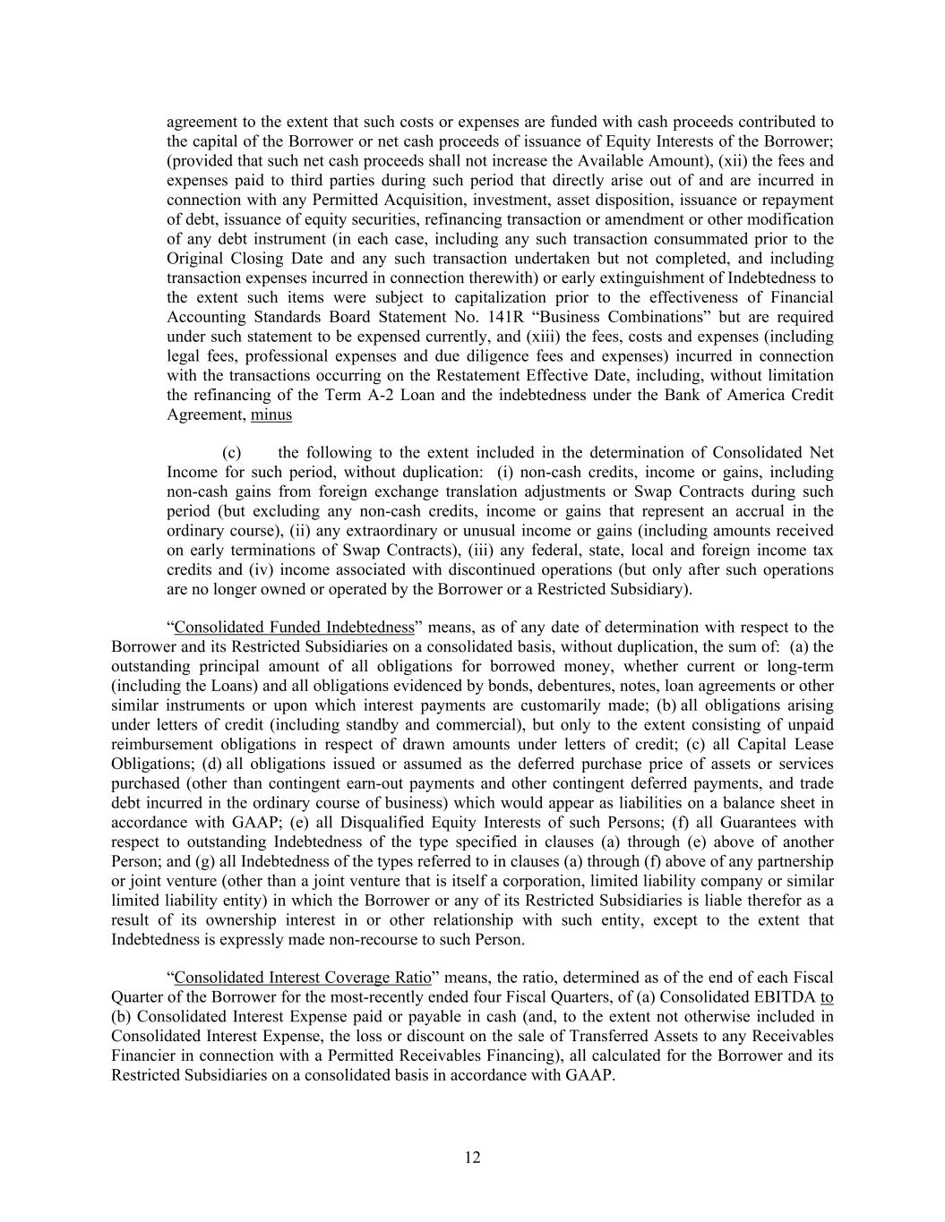 12 agreement to the extent that such costs or expenses are funded with cash proceeds contributed to the capital of the Borrower or net cash proceeds of issuance of Equity Interests of the Borrower; (provided that such net cash proceeds shall not increase the Available Amount), (xii) the fees and expenses paid to third parties during such period that directly arise out of and are incurred in connection with any Permitted Acquisition, investment, asset disposition, issuance or repayment of debt, issuance of equity securities, refinancing transaction or amendment or other modification of any debt instrument (in each case, including any such transaction consummated prior to the Original Closing Date and any such transaction undertaken but not completed, and including transaction expenses incurred in connection therewith) or early extinguishment of Indebtedness to the extent such items were subject to capitalization prior to the effectiveness of Financial Accounting Standards Board Statement No. 141R “Business Combinations” but are required under such statement to be expensed currently, and (xiii) the fees, costs and expenses (including legal fees, professional expenses and due diligence fees and expenses) incurred in connection with the transactions occurring on the Restatement Effective Date, including, without limitation the refinancing of the Term A-2 Loan and the indebtedness under the Bank of America Credit Agreement, minus (c) the following to the extent included in the determination of Consolidated Net Income for such period, without duplication: (i) non-cash credits, income or gains, including non-cash gains from foreign exchange translation adjustments or Swap Contracts during such period (but excluding any non-cash credits, income or gains that represent an accrual in the ordinary course), (ii) any extraordinary or unusual income or gains (including amounts received on early terminations of Swap Contracts), (iii) any federal, state, local and foreign income tax credits and (iv) income associated with discontinued operations (but only after such operations are no longer owned or operated by the Borrower or a Restricted Subsidiary). “Consolidated Funded Indebtedness” means, as of any date of determination with respect to the Borrower and its Restricted Subsidiaries on a consolidated basis, without duplication, the sum of: (a) the outstanding principal amount of all obligations for borrowed money, whether current or long-term (including the Loans) and all obligations evidenced by bonds, debentures, notes, loan agreements or other similar instruments or upon which interest payments are customarily made; (b) all obligations arising under letters of credit (including standby and commercial), but only to the extent consisting of unpaid reimbursement obligations in respect of drawn amounts under letters of credit; (c) all Capital Lease Obligations; (d) all obligations issued or assumed as the deferred purchase price of assets or services purchased (other than contingent earn-out payments and other contingent deferred payments, and trade debt incurred in the ordinary course of business) which would appear as liabilities on a balance sheet in accordance with GAAP; (e) all Disqualified Equity Interests of such Persons; (f) all Guarantees with respect to outstanding Indebtedness of the type specified in clauses (a) through (e) above of another Person; and (g) all Indebtedness of the types referred to in clauses (a) through (f) above of any partnership or joint venture (other than a joint venture that is itself a corporation, limited liability company or similar limited liability entity) in which the Borrower or any of its Restricted Subsidiaries is liable therefor as a result of its ownership interest in or other relationship with such entity, except to the extent that Indebtedness is expressly made non-recourse to such Person. “Consolidated Interest Coverage Ratio” means, the ratio, determined as of the end of each Fiscal Quarter of the Borrower for the most-recently ended four Fiscal Quarters, of (a) Consolidated EBITDA to (b) Consolidated Interest Expense paid or payable in cash (and, to the extent not otherwise included in Consolidated Interest Expense, the loss or discount on the sale of Transferred Assets to any Receivables Financier in connection with a Permitted Receivables Financing), all calculated for the Borrower and its Restricted Subsidiaries on a consolidated basis in accordance with GAAP.