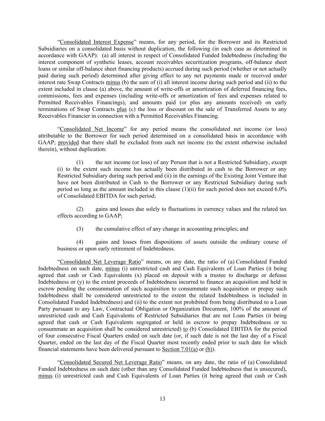 13 “Consolidated Interest Expense” means, for any period, for the Borrower and its Restricted Subsidiaries on a consolidated basis without duplication, the following (in each case as determined in accordance with GAAP): (a) all interest in respect of Consolidated Funded Indebtedness (including the interest component of synthetic leases, account receivables securitization programs, off-balance sheet loans or similar off-balance sheet financing products) accrued during such period (whether or not actually paid during such period) determined after giving effect to any net payments made or received under interest rate Swap Contracts minus (b) the sum of (i) all interest income during such period and (ii) to the extent included in clause (a) above, the amount of write-offs or amortization of deferred financing fees, commissions, fees and expenses (including write-offs or amortization of fees and expenses related to Permitted Receivables Financings), and amounts paid (or plus any amounts received) on early terminations of Swap Contracts plus (c) the loss or discount on the sale of Transferred Assets to any Receivables Financier in connection with a Permitted Receivables Financing. “Consolidated Net Income” for any period means the consolidated net income (or loss) attributable to the Borrower for such period determined on a consolidated basis in accordance with GAAP; provided that there shall be excluded from such net income (to the extent otherwise included therein), without duplication: (1) the net income (or loss) of any Person that is not a Restricted Subsidiary, except (i) to the extent such income has actually been distributed in cash to the Borrower or any Restricted Subsidiary during such period and (ii) in the earnings of the Existing Joint Venture that have not been distributed in Cash to the Borrower or any Restricted Subsidiary during such period so long as the amount included in this clause (1)(ii) for such period does not exceed 6.0% of Consolidated EBITDA for such period; (2) gains and losses due solely to fluctuations in currency values and the related tax effects according to GAAP; (3) the cumulative effect of any change in accounting principles; and (4) gains and losses from dispositions of assets outside the ordinary course of business or upon early retirement of Indebtedness. “Consolidated Net Leverage Ratio” means, on any date, the ratio of (a) Consolidated Funded Indebtedness on such date, minus (i) unrestricted cash and Cash Equivalents of Loan Parties (it being agreed that cash or Cash Equivalents (x) placed on deposit with a trustee to discharge or defease Indebtedness or (y) to the extent proceeds of Indebtedness incurred to finance an acquisition and held in escrow pending the consummation of such acquisition to consummate such acquisition or prepay such Indebtedness shall be considered unrestricted to the extent the related Indebtedness is included in Consolidated Funded Indebtedness) and (ii) to the extent not prohibited from being distributed to a Loan Party pursuant to any Law, Contractual Obligation or Organization Document, 100% of the amount of unrestricted cash and Cash Equivalents of Restricted Subsidiaries that are not Loan Parties (it being agreed that cash or Cash Equivalents segregated or held in escrow to prepay Indebtedness or to consummate an acquisition shall be considered unrestricted) to (b) Consolidated EBITDA for the period of four consecutive Fiscal Quarters ended on such date (or, if such date is not the last day of a Fiscal Quarter, ended on the last day of the Fiscal Quarter most recently ended prior to such date for which financial statements have been delivered pursuant to Section 7.01(a) or (b)). “Consolidated Secured Net Leverage Ratio” means, on any date, the ratio of (a) Consolidated Funded Indebtedness on such date (other than any Consolidated Funded Indebtedness that is unsecured), minus (i) unrestricted cash and Cash Equivalents of Loan Parties (it being agreed that cash or Cash