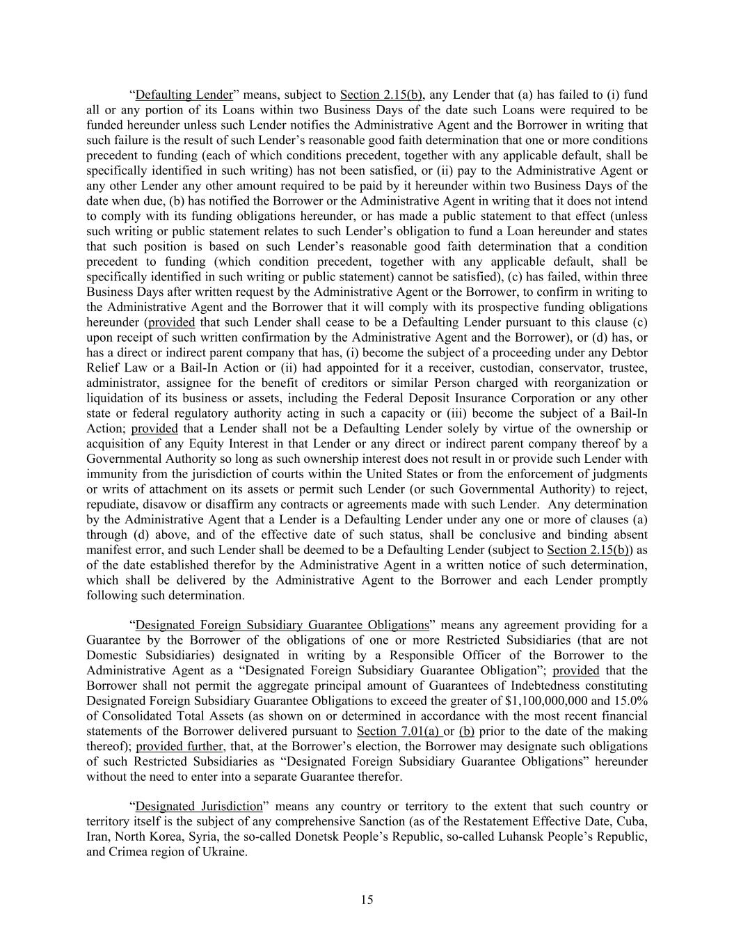15 “Defaulting Lender” means, subject to Section 2.15(b), any Lender that (a) has failed to (i) fund all or any portion of its Loans within two Business Days of the date such Loans were required to be funded hereunder unless such Lender notifies the Administrative Agent and the Borrower in writing that such failure is the result of such Lender’s reasonable good faith determination that one or more conditions precedent to funding (each of which conditions precedent, together with any applicable default, shall be specifically identified in such writing) has not been satisfied, or (ii) pay to the Administrative Agent or any other Lender any other amount required to be paid by it hereunder within two Business Days of the date when due, (b) has notified the Borrower or the Administrative Agent in writing that it does not intend to comply with its funding obligations hereunder, or has made a public statement to that effect (unless such writing or public statement relates to such Lender’s obligation to fund a Loan hereunder and states that such position is based on such Lender’s reasonable good faith determination that a condition precedent to funding (which condition precedent, together with any applicable default, shall be specifically identified in such writing or public statement) cannot be satisfied), (c) has failed, within three Business Days after written request by the Administrative Agent or the Borrower, to confirm in writing to the Administrative Agent and the Borrower that it will comply with its prospective funding obligations hereunder (provided that such Lender shall cease to be a Defaulting Lender pursuant to this clause (c) upon receipt of such written confirmation by the Administrative Agent and the Borrower), or (d) has, or has a direct or indirect parent company that has, (i) become the subject of a proceeding under any Debtor Relief Law or a Bail-In Action or (ii) had appointed for it a receiver, custodian, conservator, trustee, administrator, assignee for the benefit of creditors or similar Person charged with reorganization or liquidation of its business or assets, including the Federal Deposit Insurance Corporation or any other state or federal regulatory authority acting in such a capacity or (iii) become the subject of a Bail-In Action; provided that a Lender shall not be a Defaulting Lender solely by virtue of the ownership or acquisition of any Equity Interest in that Lender or any direct or indirect parent company thereof by a Governmental Authority so long as such ownership interest does not result in or provide such Lender with immunity from the jurisdiction of courts within the United States or from the enforcement of judgments or writs of attachment on its assets or permit such Lender (or such Governmental Authority) to reject, repudiate, disavow or disaffirm any contracts or agreements made with such Lender. Any determination by the Administrative Agent that a Lender is a Defaulting Lender under any one or more of clauses (a) through (d) above, and of the effective date of such status, shall be conclusive and binding absent manifest error, and such Lender shall be deemed to be a Defaulting Lender (subject to Section 2.15(b)) as of the date established therefor by the Administrative Agent in a written notice of such determination, which shall be delivered by the Administrative Agent to the Borrower and each Lender promptly following such determination. “Designated Foreign Subsidiary Guarantee Obligations” means any agreement providing for a Guarantee by the Borrower of the obligations of one or more Restricted Subsidiaries (that are not Domestic Subsidiaries) designated in writing by a Responsible Officer of the Borrower to the Administrative Agent as a “Designated Foreign Subsidiary Guarantee Obligation”; provided that the Borrower shall not permit the aggregate principal amount of Guarantees of Indebtedness constituting Designated Foreign Subsidiary Guarantee Obligations to exceed the greater of $1,100,000,000 and 15.0% of Consolidated Total Assets (as shown on or determined in accordance with the most recent financial statements of the Borrower delivered pursuant to Section 7.01(a) or (b) prior to the date of the making thereof); provided further, that, at the Borrower’s election, the Borrower may designate such obligations of such Restricted Subsidiaries as “Designated Foreign Subsidiary Guarantee Obligations” hereunder without the need to enter into a separate Guarantee therefor. “Designated Jurisdiction” means any country or territory to the extent that such country or territory itself is the subject of any comprehensive Sanction (as of the Restatement Effective Date, Cuba, Iran, North Korea, Syria, the so-called Donetsk People’s Republic, so-called Luhansk People’s Republic, and Crimea region of Ukraine.