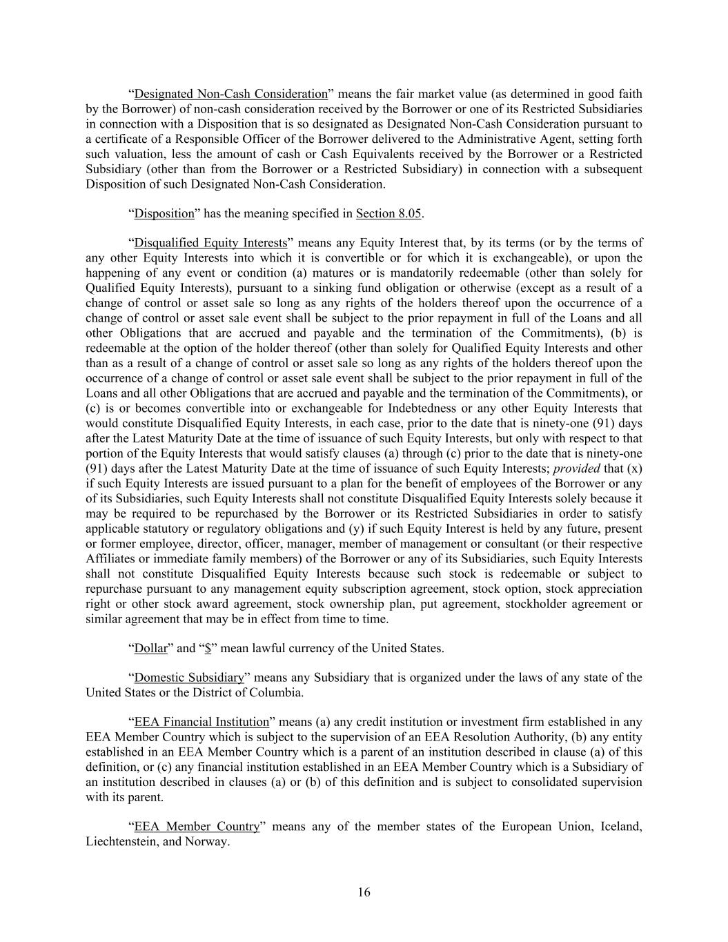16 “Designated Non-Cash Consideration” means the fair market value (as determined in good faith by the Borrower) of non-cash consideration received by the Borrower or one of its Restricted Subsidiaries in connection with a Disposition that is so designated as Designated Non-Cash Consideration pursuant to a certificate of a Responsible Officer of the Borrower delivered to the Administrative Agent, setting forth such valuation, less the amount of cash or Cash Equivalents received by the Borrower or a Restricted Subsidiary (other than from the Borrower or a Restricted Subsidiary) in connection with a subsequent Disposition of such Designated Non-Cash Consideration. “Disposition” has the meaning specified in Section 8.05. “Disqualified Equity Interests” means any Equity Interest that, by its terms (or by the terms of any other Equity Interests into which it is convertible or for which it is exchangeable), or upon the happening of any event or condition (a) matures or is mandatorily redeemable (other than solely for Qualified Equity Interests), pursuant to a sinking fund obligation or otherwise (except as a result of a change of control or asset sale so long as any rights of the holders thereof upon the occurrence of a change of control or asset sale event shall be subject to the prior repayment in full of the Loans and all other Obligations that are accrued and payable and the termination of the Commitments), (b) is redeemable at the option of the holder thereof (other than solely for Qualified Equity Interests and other than as a result of a change of control or asset sale so long as any rights of the holders thereof upon the occurrence of a change of control or asset sale event shall be subject to the prior repayment in full of the Loans and all other Obligations that are accrued and payable and the termination of the Commitments), or (c) is or becomes convertible into or exchangeable for Indebtedness or any other Equity Interests that would constitute Disqualified Equity Interests, in each case, prior to the date that is ninety-one (91) days after the Latest Maturity Date at the time of issuance of such Equity Interests, but only with respect to that portion of the Equity Interests that would satisfy clauses (a) through (c) prior to the date that is ninety-one (91) days after the Latest Maturity Date at the time of issuance of such Equity Interests; provided that (x) if such Equity Interests are issued pursuant to a plan for the benefit of employees of the Borrower or any of its Subsidiaries, such Equity Interests shall not constitute Disqualified Equity Interests solely because it may be required to be repurchased by the Borrower or its Restricted Subsidiaries in order to satisfy applicable statutory or regulatory obligations and (y) if such Equity Interest is held by any future, present or former employee, director, officer, manager, member of management or consultant (or their respective Affiliates or immediate family members) of the Borrower or any of its Subsidiaries, such Equity Interests shall not constitute Disqualified Equity Interests because such stock is redeemable or subject to repurchase pursuant to any management equity subscription agreement, stock option, stock appreciation right or other stock award agreement, stock ownership plan, put agreement, stockholder agreement or similar agreement that may be in effect from time to time. “Dollar” and “$” mean lawful currency of the United States. “Domestic Subsidiary” means any Subsidiary that is organized under the laws of any state of the United States or the District of Columbia. “EEA Financial Institution” means (a) any credit institution or investment firm established in any EEA Member Country which is subject to the supervision of an EEA Resolution Authority, (b) any entity established in an EEA Member Country which is a parent of an institution described in clause (a) of this definition, or (c) any financial institution established in an EEA Member Country which is a Subsidiary of an institution described in clauses (a) or (b) of this definition and is subject to consolidated supervision with its parent. “EEA Member Country” means any of the member states of the European Union, Iceland, Liechtenstein, and Norway.