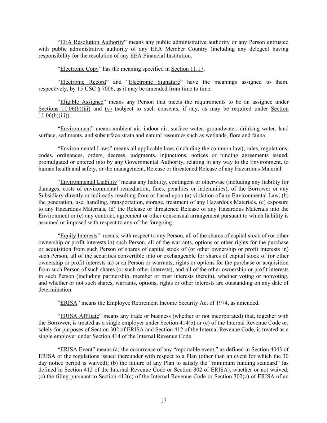 17 “EEA Resolution Authority” means any public administrative authority or any Person entrusted with public administrative authority of any EEA Member Country (including any delegee) having responsibility for the resolution of any EEA Financial Institution. “Electronic Copy” has the meaning specified in Section 11.17. “Electronic Record” and “Electronic Signature” have the meanings assigned to them. respectively, by 15 USC § 7006, as it may be amended from time to time. “Eligible Assignee” means any Person that meets the requirements to be an assignee under Sections 11.06(b)(iii) and (v) (subject to such consents, if any, as may be required under Section 11.06(b)(iii)). “Environment” means ambient air, indoor air, surface water, groundwater, drinking water, land surface, sediments, and subsurface strata and natural resources such as wetlands, flora and fauna. “Environmental Laws” means all applicable laws (including the common law), rules, regulations, codes, ordinances, orders, decrees, judgments, injunctions, notices or binding agreements issued, promulgated or entered into by any Governmental Authority, relating in any way to the Environment, to human health and safety, or the management, Release or threatened Release of any Hazardous Material. “Environmental Liability” means any liability, contingent or otherwise (including any liability for damages, costs of environmental remediation, fines, penalties or indemnities), of the Borrower or any Subsidiary directly or indirectly resulting from or based upon (a) violation of any Environmental Law, (b) the generation, use, handling, transportation, storage, treatment of any Hazardous Materials, (c) exposure to any Hazardous Materials, (d) the Release or threatened Release of any Hazardous Materials into the Environment or (e) any contract, agreement or other consensual arrangement pursuant to which liability is assumed or imposed with respect to any of the foregoing. “Equity Interests” means, with respect to any Person, all of the shares of capital stock of (or other ownership or profit interests in) such Person, all of the warrants, options or other rights for the purchase or acquisition from such Person of shares of capital stock of (or other ownership or profit interests in) such Person, all of the securities convertible into or exchangeable for shares of capital stock of (or other ownership or profit interests in) such Person or warrants, rights or options for the purchase or acquisition from such Person of such shares (or such other interests), and all of the other ownership or profit interests in such Person (including partnership, member or trust interests therein), whether voting or nonvoting, and whether or not such shares, warrants, options, rights or other interests are outstanding on any date of determination. “ERISA” means the Employee Retirement Income Security Act of 1974, as amended. “ERISA Affiliate” means any trade or business (whether or not incorporated) that, together with the Borrower, is treated as a single employer under Section 414(b) or (c) of the Internal Revenue Code or, solely for purposes of Section 302 of ERISA and Section 412 of the Internal Revenue Code, is treated as a single employer under Section 414 of the Internal Revenue Code. “ERISA Event” means (a) the occurrence of any “reportable event,” as defined in Section 4043 of ERISA or the regulations issued thereunder with respect to a Plan (other than an event for which the 30 day notice period is waived); (b) the failure of any Plan to satisfy the “minimum funding standard” (as defined in Section 412 of the Internal Revenue Code or Section 302 of ERISA), whether or not waived; (c) the filing pursuant to Section 412(c) of the Internal Revenue Code or Section 302(c) of ERISA of an