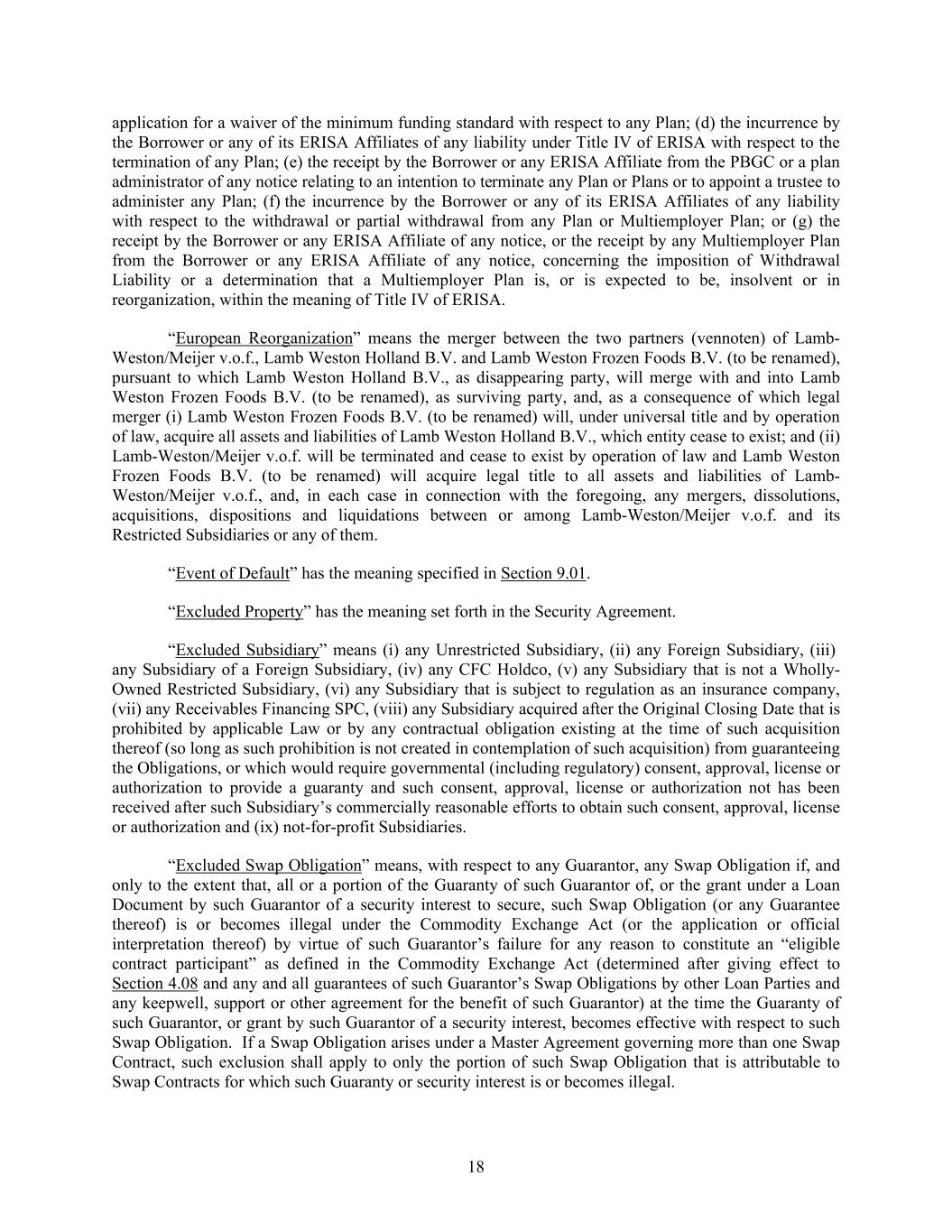 18 application for a waiver of the minimum funding standard with respect to any Plan; (d) the incurrence by the Borrower or any of its ERISA Affiliates of any liability under Title IV of ERISA with respect to the termination of any Plan; (e) the receipt by the Borrower or any ERISA Affiliate from the PBGC or a plan administrator of any notice relating to an intention to terminate any Plan or Plans or to appoint a trustee to administer any Plan; (f) the incurrence by the Borrower or any of its ERISA Affiliates of any liability with respect to the withdrawal or partial withdrawal from any Plan or Multiemployer Plan; or (g) the receipt by the Borrower or any ERISA Affiliate of any notice, or the receipt by any Multiemployer Plan from the Borrower or any ERISA Affiliate of any notice, concerning the imposition of Withdrawal Liability or a determination that a Multiemployer Plan is, or is expected to be, insolvent or in reorganization, within the meaning of Title IV of ERISA. “European Reorganization” means the merger between the two partners (vennoten) of Lamb- Weston/Meijer v.o.f., Lamb Weston Holland B.V. and Lamb Weston Frozen Foods B.V. (to be renamed), pursuant to which Lamb Weston Holland B.V., as disappearing party, will merge with and into Lamb Weston Frozen Foods B.V. (to be renamed), as surviving party, and, as a consequence of which legal merger (i) Lamb Weston Frozen Foods B.V. (to be renamed) will, under universal title and by operation of law, acquire all assets and liabilities of Lamb Weston Holland B.V., which entity cease to exist; and (ii) Lamb-Weston/Meijer v.o.f. will be terminated and cease to exist by operation of law and Lamb Weston Frozen Foods B.V. (to be renamed) will acquire legal title to all assets and liabilities of Lamb- Weston/Meijer v.o.f., and, in each case in connection with the foregoing, any mergers, dissolutions, acquisitions, dispositions and liquidations between or among Lamb-Weston/Meijer v.o.f. and its Restricted Subsidiaries or any of them. “Event of Default” has the meaning specified in Section 9.01. “Excluded Property” has the meaning set forth in the Security Agreement. “Excluded Subsidiary” means (i) any Unrestricted Subsidiary, (ii) any Foreign Subsidiary, (iii) any Subsidiary of a Foreign Subsidiary, (iv) any CFC Holdco, (v) any Subsidiary that is not a Wholly- Owned Restricted Subsidiary, (vi) any Subsidiary that is subject to regulation as an insurance company, (vii) any Receivables Financing SPC, (viii) any Subsidiary acquired after the Original Closing Date that is prohibited by applicable Law or by any contractual obligation existing at the time of such acquisition thereof (so long as such prohibition is not created in contemplation of such acquisition) from guaranteeing the Obligations, or which would require governmental (including regulatory) consent, approval, license or authorization to provide a guaranty and such consent, approval, license or authorization not has been received after such Subsidiary’s commercially reasonable efforts to obtain such consent, approval, license or authorization and (ix) not-for-profit Subsidiaries. “Excluded Swap Obligation” means, with respect to any Guarantor, any Swap Obligation if, and only to the extent that, all or a portion of the Guaranty of such Guarantor of, or the grant under a Loan Document by such Guarantor of a security interest to secure, such Swap Obligation (or any Guarantee thereof) is or becomes illegal under the Commodity Exchange Act (or the application or official interpretation thereof) by virtue of such Guarantor’s failure for any reason to constitute an “eligible contract participant” as defined in the Commodity Exchange Act (determined after giving effect to Section 4.08 and any and all guarantees of such Guarantor’s Swap Obligations by other Loan Parties and any keepwell, support or other agreement for the benefit of such Guarantor) at the time the Guaranty of such Guarantor, or grant by such Guarantor of a security interest, becomes effective with respect to such Swap Obligation. If a Swap Obligation arises under a Master Agreement governing more than one Swap Contract, such exclusion shall apply to only the portion of such Swap Obligation that is attributable to Swap Contracts for which such Guaranty or security interest is or becomes illegal.