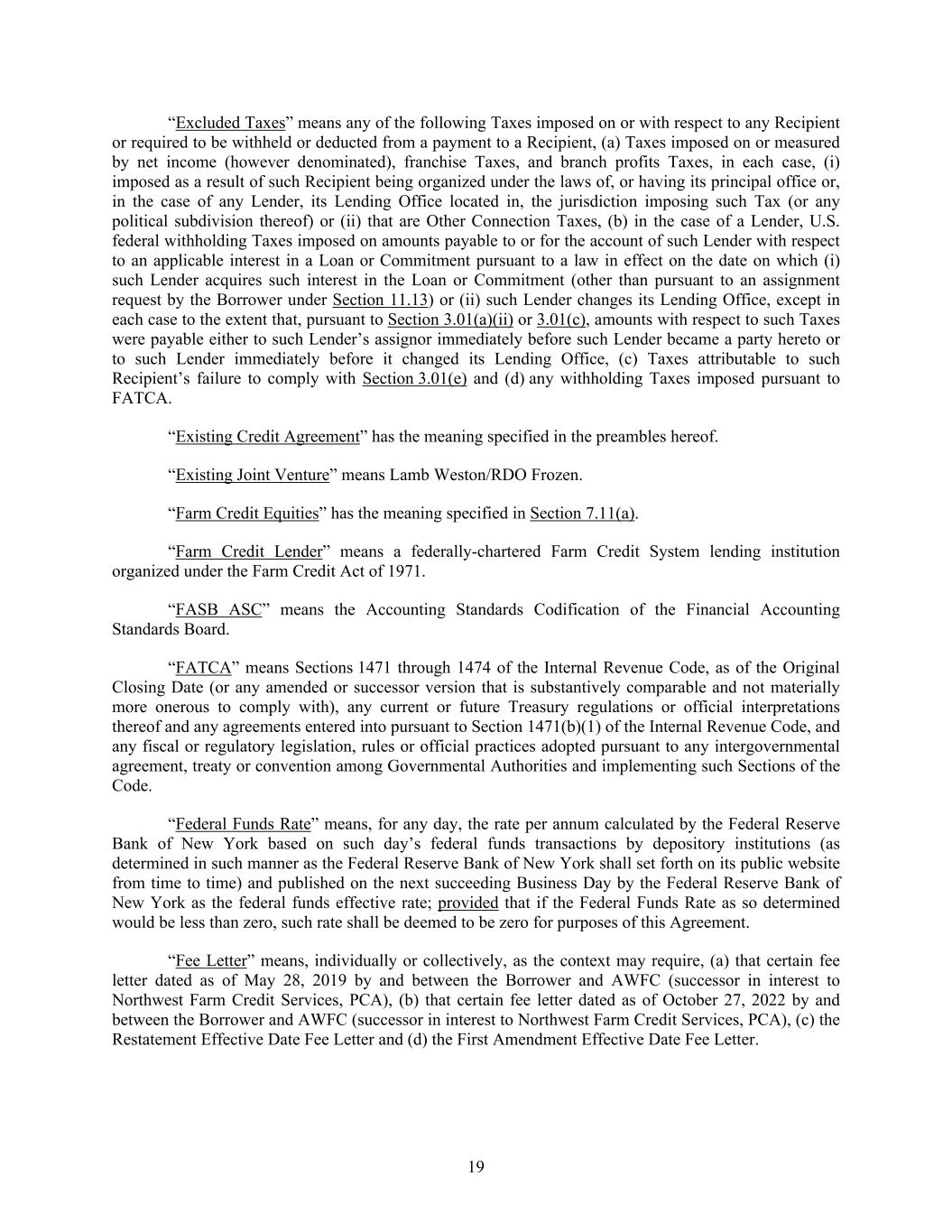 19 “Excluded Taxes” means any of the following Taxes imposed on or with respect to any Recipient or required to be withheld or deducted from a payment to a Recipient, (a) Taxes imposed on or measured by net income (however denominated), franchise Taxes, and branch profits Taxes, in each case, (i) imposed as a result of such Recipient being organized under the laws of, or having its principal office or, in the case of any Lender, its Lending Office located in, the jurisdiction imposing such Tax (or any political subdivision thereof) or (ii) that are Other Connection Taxes, (b) in the case of a Lender, U.S. federal withholding Taxes imposed on amounts payable to or for the account of such Lender with respect to an applicable interest in a Loan or Commitment pursuant to a law in effect on the date on which (i) such Lender acquires such interest in the Loan or Commitment (other than pursuant to an assignment request by the Borrower under Section 11.13) or (ii) such Lender changes its Lending Office, except in each case to the extent that, pursuant to Section 3.01(a)(ii) or 3.01(c), amounts with respect to such Taxes were payable either to such Lender’s assignor immediately before such Lender became a party hereto or to such Lender immediately before it changed its Lending Office, (c) Taxes attributable to such Recipient’s failure to comply with Section 3.01(e) and (d) any withholding Taxes imposed pursuant to FATCA. “Existing Credit Agreement” has the meaning specified in the preambles hereof. “Existing Joint Venture” means Lamb Weston/RDO Frozen. “Farm Credit Equities” has the meaning specified in Section 7.11(a). “Farm Credit Lender” means a federally-chartered Farm Credit System lending institution organized under the Farm Credit Act of 1971. “FASB ASC” means the Accounting Standards Codification of the Financial Accounting Standards Board. “FATCA” means Sections 1471 through 1474 of the Internal Revenue Code, as of the Original Closing Date (or any amended or successor version that is substantively comparable and not materially more onerous to comply with), any current or future Treasury regulations or official interpretations thereof and any agreements entered into pursuant to Section 1471(b)(1) of the Internal Revenue Code, and any fiscal or regulatory legislation, rules or official practices adopted pursuant to any intergovernmental agreement, treaty or convention among Governmental Authorities and implementing such Sections of the Code. “Federal Funds Rate” means, for any day, the rate per annum calculated by the Federal Reserve Bank of New York based on such day’s federal funds transactions by depository institutions (as determined in such manner as the Federal Reserve Bank of New York shall set forth on its public website from time to time) and published on the next succeeding Business Day by the Federal Reserve Bank of New York as the federal funds effective rate; provided that if the Federal Funds Rate as so determined would be less than zero, such rate shall be deemed to be zero for purposes of this Agreement. “Fee Letter” means, individually or collectively, as the context may require, (a) that certain fee letter dated as of May 28, 2019 by and between the Borrower and AWFC (successor in interest to Northwest Farm Credit Services, PCA), (b) that certain fee letter dated as of October 27, 2022 by and between the Borrower and AWFC (successor in interest to Northwest Farm Credit Services, PCA), (c) the Restatement Effective Date Fee Letter and (d) the First Amendment Effective Date Fee Letter.