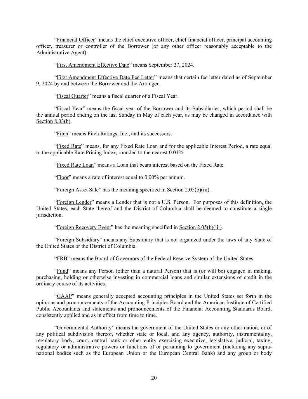 20 “Financial Officer” means the chief executive officer, chief financial officer, principal accounting officer, treasurer or controller of the Borrower (or any other officer reasonably acceptable to the Administrative Agent). “First Amendment Effective Date” means September 27, 2024. “First Amendment Effective Date Fee Letter” means that certain fee letter dated as of September 9, 2024 by and between the Borrower and the Arranger. “Fiscal Quarter” means a fiscal quarter of a Fiscal Year. “Fiscal Year” means the fiscal year of the Borrower and its Subsidiaries, which period shall be the annual period ending on the last Sunday in May of each year, as may be changed in accordance with Section 8.03(b). “Fitch” means Fitch Ratings, Inc., and its successors. “Fixed Rate” means, for any Fixed Rate Loan and for the applicable Interest Period, a rate equal to the applicable Rate Pricing Index, rounded to the nearest 0.01%. “Fixed Rate Loan” means a Loan that bears interest based on the Fixed Rate. “Floor” means a rate of interest equal to 0.00% per annum. “Foreign Asset Sale” has the meaning specified in Section 2.05(b)(iii). “Foreign Lender” means a Lender that is not a U.S. Person. For purposes of this definition, the United States, each State thereof and the District of Columbia shall be deemed to constitute a single jurisdiction. “Foreign Recovery Event” has the meaning specified in Section 2.05(b)(iii). “Foreign Subsidiary” means any Subsidiary that is not organized under the laws of any State of the United States or the District of Columbia. “FRB” means the Board of Governors of the Federal Reserve System of the United States. “Fund” means any Person (other than a natural Person) that is (or will be) engaged in making, purchasing, holding or otherwise investing in commercial loans and similar extensions of credit in the ordinary course of its activities. “GAAP” means generally accepted accounting principles in the United States set forth in the opinions and pronouncements of the Accounting Principles Board and the American Institute of Certified Public Accountants and statements and pronouncements of the Financial Accounting Standards Board, consistently applied and as in effect from time to time. “Governmental Authority” means the government of the United States or any other nation, or of any political subdivision thereof, whether state or local, and any agency, authority, instrumentality, regulatory body, court, central bank or other entity exercising executive, legislative, judicial, taxing, regulatory or administrative powers or functions of or pertaining to government (including any supra- national bodies such as the European Union or the European Central Bank) and any group or body