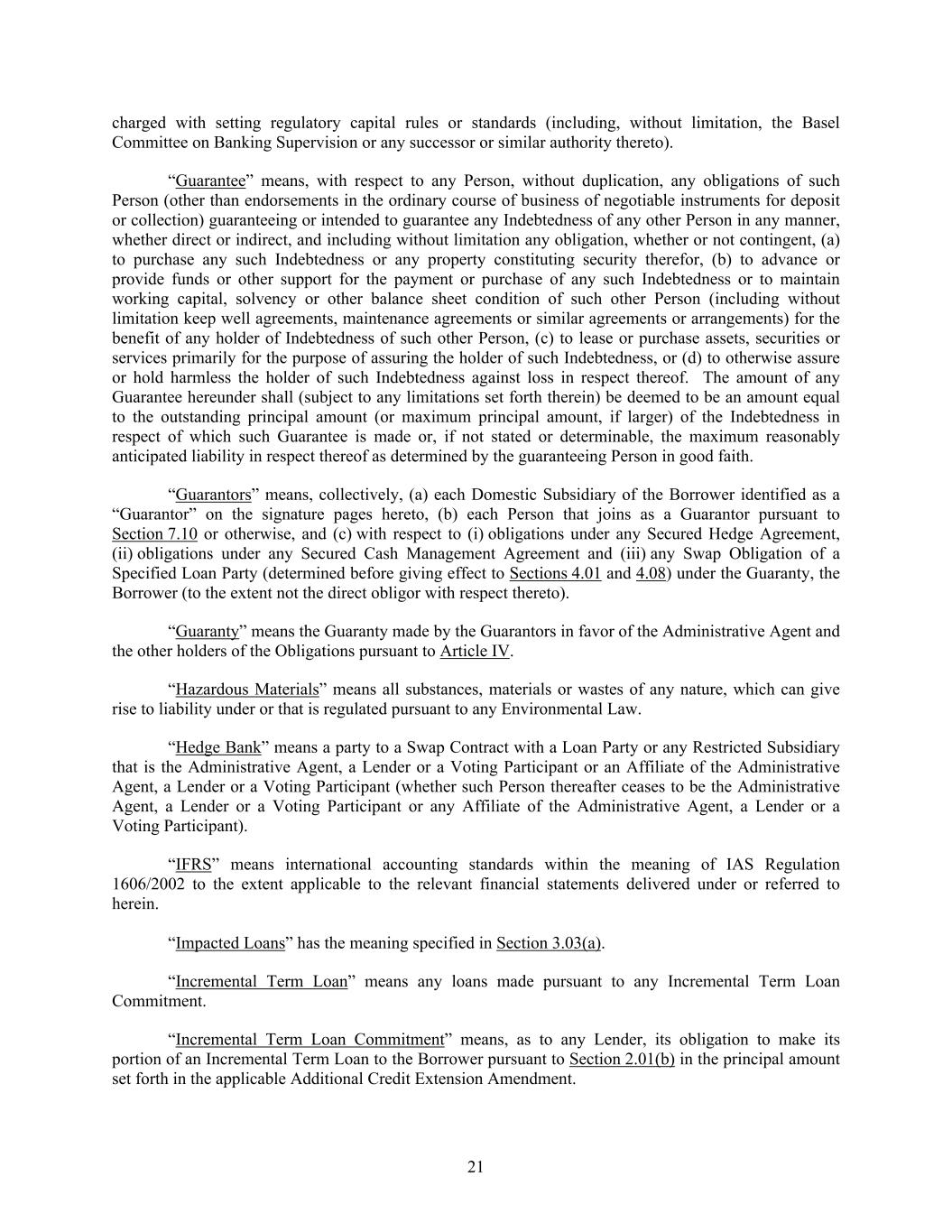 21 charged with setting regulatory capital rules or standards (including, without limitation, the Basel Committee on Banking Supervision or any successor or similar authority thereto). “Guarantee” means, with respect to any Person, without duplication, any obligations of such Person (other than endorsements in the ordinary course of business of negotiable instruments for deposit or collection) guaranteeing or intended to guarantee any Indebtedness of any other Person in any manner, whether direct or indirect, and including without limitation any obligation, whether or not contingent, (a) to purchase any such Indebtedness or any property constituting security therefor, (b) to advance or provide funds or other support for the payment or purchase of any such Indebtedness or to maintain working capital, solvency or other balance sheet condition of such other Person (including without limitation keep well agreements, maintenance agreements or similar agreements or arrangements) for the benefit of any holder of Indebtedness of such other Person, (c) to lease or purchase assets, securities or services primarily for the purpose of assuring the holder of such Indebtedness, or (d) to otherwise assure or hold harmless the holder of such Indebtedness against loss in respect thereof. The amount of any Guarantee hereunder shall (subject to any limitations set forth therein) be deemed to be an amount equal to the outstanding principal amount (or maximum principal amount, if larger) of the Indebtedness in respect of which such Guarantee is made or, if not stated or determinable, the maximum reasonably anticipated liability in respect thereof as determined by the guaranteeing Person in good faith. “Guarantors” means, collectively, (a) each Domestic Subsidiary of the Borrower identified as a “Guarantor” on the signature pages hereto, (b) each Person that joins as a Guarantor pursuant to Section 7.10 or otherwise, and (c) with respect to (i) obligations under any Secured Hedge Agreement, (ii) obligations under any Secured Cash Management Agreement and (iii) any Swap Obligation of a Specified Loan Party (determined before giving effect to Sections 4.01 and 4.08) under the Guaranty, the Borrower (to the extent not the direct obligor with respect thereto). “Guaranty” means the Guaranty made by the Guarantors in favor of the Administrative Agent and the other holders of the Obligations pursuant to Article IV. “Hazardous Materials” means all substances, materials or wastes of any nature, which can give rise to liability under or that is regulated pursuant to any Environmental Law. “Hedge Bank” means a party to a Swap Contract with a Loan Party or any Restricted Subsidiary that is the Administrative Agent, a Lender or a Voting Participant or an Affiliate of the Administrative Agent, a Lender or a Voting Participant (whether such Person thereafter ceases to be the Administrative Agent, a Lender or a Voting Participant or any Affiliate of the Administrative Agent, a Lender or a Voting Participant). “IFRS” means international accounting standards within the meaning of IAS Regulation 1606/2002 to the extent applicable to the relevant financial statements delivered under or referred to herein. “Impacted Loans” has the meaning specified in Section 3.03(a). “Incremental Term Loan” means any loans made pursuant to any Incremental Term Loan Commitment. “Incremental Term Loan Commitment” means, as to any Lender, its obligation to make its portion of an Incremental Term Loan to the Borrower pursuant to Section 2.01(b) in the principal amount set forth in the applicable Additional Credit Extension Amendment.