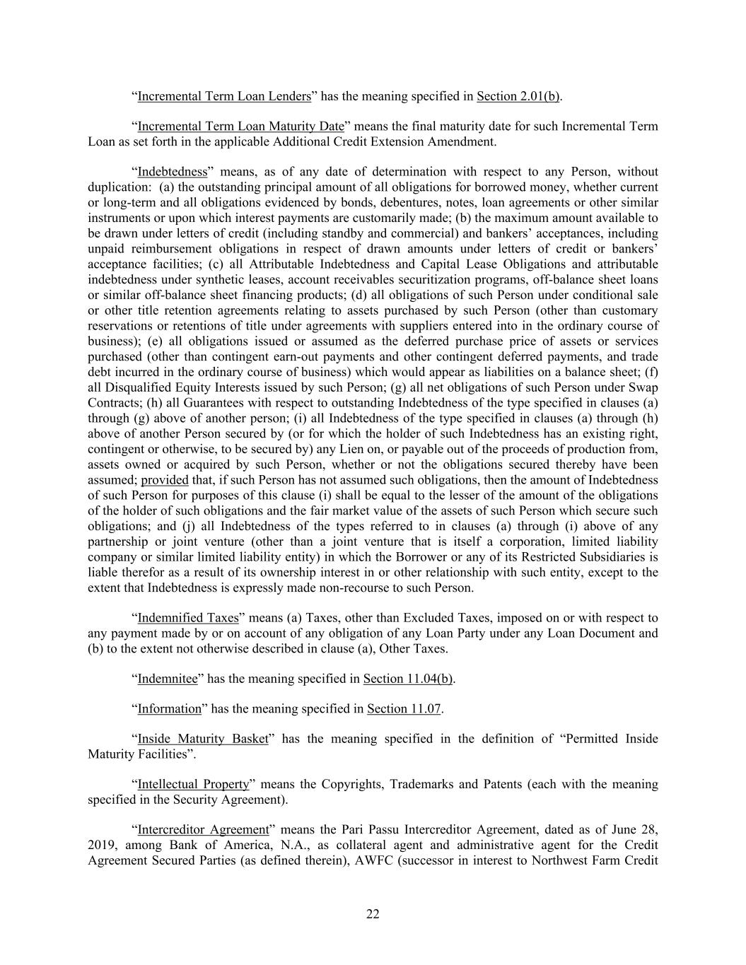 22 “Incremental Term Loan Lenders” has the meaning specified in Section 2.01(b). “Incremental Term Loan Maturity Date” means the final maturity date for such Incremental Term Loan as set forth in the applicable Additional Credit Extension Amendment. “Indebtedness” means, as of any date of determination with respect to any Person, without duplication: (a) the outstanding principal amount of all obligations for borrowed money, whether current or long-term and all obligations evidenced by bonds, debentures, notes, loan agreements or other similar instruments or upon which interest payments are customarily made; (b) the maximum amount available to be drawn under letters of credit (including standby and commercial) and bankers’ acceptances, including unpaid reimbursement obligations in respect of drawn amounts under letters of credit or bankers’ acceptance facilities; (c) all Attributable Indebtedness and Capital Lease Obligations and attributable indebtedness under synthetic leases, account receivables securitization programs, off-balance sheet loans or similar off-balance sheet financing products; (d) all obligations of such Person under conditional sale or other title retention agreements relating to assets purchased by such Person (other than customary reservations or retentions of title under agreements with suppliers entered into in the ordinary course of business); (e) all obligations issued or assumed as the deferred purchase price of assets or services purchased (other than contingent earn-out payments and other contingent deferred payments, and trade debt incurred in the ordinary course of business) which would appear as liabilities on a balance sheet; (f) all Disqualified Equity Interests issued by such Person; (g) all net obligations of such Person under Swap Contracts; (h) all Guarantees with respect to outstanding Indebtedness of the type specified in clauses (a) through (g) above of another person; (i) all Indebtedness of the type specified in clauses (a) through (h) above of another Person secured by (or for which the holder of such Indebtedness has an existing right, contingent or otherwise, to be secured by) any Lien on, or payable out of the proceeds of production from, assets owned or acquired by such Person, whether or not the obligations secured thereby have been assumed; provided that, if such Person has not assumed such obligations, then the amount of Indebtedness of such Person for purposes of this clause (i) shall be equal to the lesser of the amount of the obligations of the holder of such obligations and the fair market value of the assets of such Person which secure such obligations; and (j) all Indebtedness of the types referred to in clauses (a) through (i) above of any partnership or joint venture (other than a joint venture that is itself a corporation, limited liability company or similar limited liability entity) in which the Borrower or any of its Restricted Subsidiaries is liable therefor as a result of its ownership interest in or other relationship with such entity, except to the extent that Indebtedness is expressly made non-recourse to such Person. “Indemnified Taxes” means (a) Taxes, other than Excluded Taxes, imposed on or with respect to any payment made by or on account of any obligation of any Loan Party under any Loan Document and (b) to the extent not otherwise described in clause (a), Other Taxes. “Indemnitee” has the meaning specified in Section 11.04(b). “Information” has the meaning specified in Section 11.07. “Inside Maturity Basket” has the meaning specified in the definition of “Permitted Inside Maturity Facilities”. “Intellectual Property” means the Copyrights, Trademarks and Patents (each with the meaning specified in the Security Agreement). “Intercreditor Agreement” means the Pari Passu Intercreditor Agreement, dated as of June 28, 2019, among Bank of America, N.A., as collateral agent and administrative agent for the Credit Agreement Secured Parties (as defined therein), AWFC (successor in interest to Northwest Farm Credit
