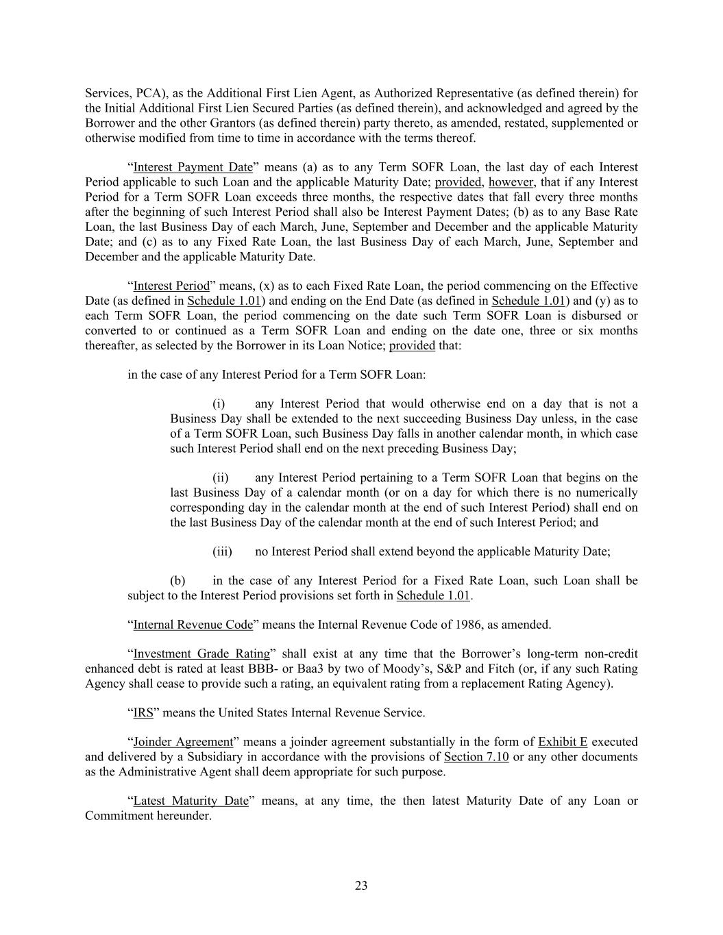 23 Services, PCA), as the Additional First Lien Agent, as Authorized Representative (as defined therein) for the Initial Additional First Lien Secured Parties (as defined therein), and acknowledged and agreed by the Borrower and the other Grantors (as defined therein) party thereto, as amended, restated, supplemented or otherwise modified from time to time in accordance with the terms thereof. “Interest Payment Date” means (a) as to any Term SOFR Loan, the last day of each Interest Period applicable to such Loan and the applicable Maturity Date; provided, however, that if any Interest Period for a Term SOFR Loan exceeds three months, the respective dates that fall every three months after the beginning of such Interest Period shall also be Interest Payment Dates; (b) as to any Base Rate Loan, the last Business Day of each March, June, September and December and the applicable Maturity Date; and (c) as to any Fixed Rate Loan, the last Business Day of each March, June, September and December and the applicable Maturity Date. “Interest Period” means, (x) as to each Fixed Rate Loan, the period commencing on the Effective Date (as defined in Schedule 1.01) and ending on the End Date (as defined in Schedule 1.01) and (y) as to each Term SOFR Loan, the period commencing on the date such Term SOFR Loan is disbursed or converted to or continued as a Term SOFR Loan and ending on the date one, three or six months thereafter, as selected by the Borrower in its Loan Notice; provided that: in the case of any Interest Period for a Term SOFR Loan: (i) any Interest Period that would otherwise end on a day that is not a Business Day shall be extended to the next succeeding Business Day unless, in the case of a Term SOFR Loan, such Business Day falls in another calendar month, in which case such Interest Period shall end on the next preceding Business Day; (ii) any Interest Period pertaining to a Term SOFR Loan that begins on the last Business Day of a calendar month (or on a day for which there is no numerically corresponding day in the calendar month at the end of such Interest Period) shall end on the last Business Day of the calendar month at the end of such Interest Period; and (iii) no Interest Period shall extend beyond the applicable Maturity Date; (b) in the case of any Interest Period for a Fixed Rate Loan, such Loan shall be subject to the Interest Period provisions set forth in Schedule 1.01. “Internal Revenue Code” means the Internal Revenue Code of 1986, as amended. “Investment Grade Rating” shall exist at any time that the Borrower’s long-term non-credit enhanced debt is rated at least BBB- or Baa3 by two of Moody’s, S&P and Fitch (or, if any such Rating Agency shall cease to provide such a rating, an equivalent rating from a replacement Rating Agency). “IRS” means the United States Internal Revenue Service. “Joinder Agreement” means a joinder agreement substantially in the form of Exhibit E executed and delivered by a Subsidiary in accordance with the provisions of Section 7.10 or any other documents as the Administrative Agent shall deem appropriate for such purpose. “Latest Maturity Date” means, at any time, the then latest Maturity Date of any Loan or Commitment hereunder.