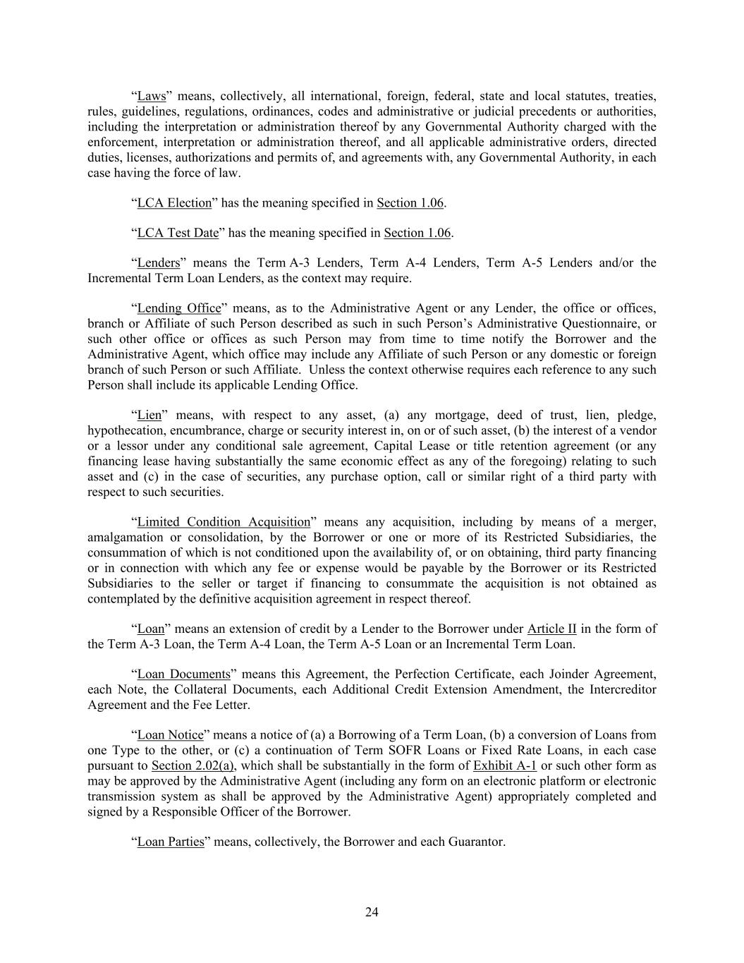 24 “Laws” means, collectively, all international, foreign, federal, state and local statutes, treaties, rules, guidelines, regulations, ordinances, codes and administrative or judicial precedents or authorities, including the interpretation or administration thereof by any Governmental Authority charged with the enforcement, interpretation or administration thereof, and all applicable administrative orders, directed duties, licenses, authorizations and permits of, and agreements with, any Governmental Authority, in each case having the force of law. “LCA Election” has the meaning specified in Section 1.06. “LCA Test Date” has the meaning specified in Section 1.06. “Lenders” means the Term A-3 Lenders, Term A-4 Lenders, Term A-5 Lenders and/or the Incremental Term Loan Lenders, as the context may require. “Lending Office” means, as to the Administrative Agent or any Lender, the office or offices, branch or Affiliate of such Person described as such in such Person’s Administrative Questionnaire, or such other office or offices as such Person may from time to time notify the Borrower and the Administrative Agent, which office may include any Affiliate of such Person or any domestic or foreign branch of such Person or such Affiliate. Unless the context otherwise requires each reference to any such Person shall include its applicable Lending Office. “Lien” means, with respect to any asset, (a) any mortgage, deed of trust, lien, pledge, hypothecation, encumbrance, charge or security interest in, on or of such asset, (b) the interest of a vendor or a lessor under any conditional sale agreement, Capital Lease or title retention agreement (or any financing lease having substantially the same economic effect as any of the foregoing) relating to such asset and (c) in the case of securities, any purchase option, call or similar right of a third party with respect to such securities. “Limited Condition Acquisition” means any acquisition, including by means of a merger, amalgamation or consolidation, by the Borrower or one or more of its Restricted Subsidiaries, the consummation of which is not conditioned upon the availability of, or on obtaining, third party financing or in connection with which any fee or expense would be payable by the Borrower or its Restricted Subsidiaries to the seller or target if financing to consummate the acquisition is not obtained as contemplated by the definitive acquisition agreement in respect thereof. “Loan” means an extension of credit by a Lender to the Borrower under Article II in the form of the Term A-3 Loan, the Term A-4 Loan, the Term A-5 Loan or an Incremental Term Loan. “Loan Documents” means this Agreement, the Perfection Certificate, each Joinder Agreement, each Note, the Collateral Documents, each Additional Credit Extension Amendment, the Intercreditor Agreement and the Fee Letter. “Loan Notice” means a notice of (a) a Borrowing of a Term Loan, (b) a conversion of Loans from one Type to the other, or (c) a continuation of Term SOFR Loans or Fixed Rate Loans, in each case pursuant to Section 2.02(a), which shall be substantially in the form of Exhibit A-1 or such other form as may be approved by the Administrative Agent (including any form on an electronic platform or electronic transmission system as shall be approved by the Administrative Agent) appropriately completed and signed by a Responsible Officer of the Borrower. “Loan Parties” means, collectively, the Borrower and each Guarantor.