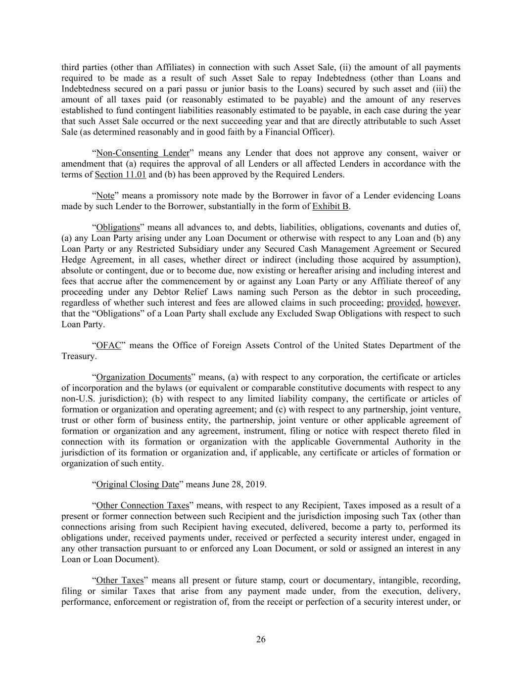 26 third parties (other than Affiliates) in connection with such Asset Sale, (ii) the amount of all payments required to be made as a result of such Asset Sale to repay Indebtedness (other than Loans and Indebtedness secured on a pari passu or junior basis to the Loans) secured by such asset and (iii) the amount of all taxes paid (or reasonably estimated to be payable) and the amount of any reserves established to fund contingent liabilities reasonably estimated to be payable, in each case during the year that such Asset Sale occurred or the next succeeding year and that are directly attributable to such Asset Sale (as determined reasonably and in good faith by a Financial Officer). “Non-Consenting Lender” means any Lender that does not approve any consent, waiver or amendment that (a) requires the approval of all Lenders or all affected Lenders in accordance with the terms of Section 11.01 and (b) has been approved by the Required Lenders. “Note” means a promissory note made by the Borrower in favor of a Lender evidencing Loans made by such Lender to the Borrower, substantially in the form of Exhibit B. “Obligations” means all advances to, and debts, liabilities, obligations, covenants and duties of, (a) any Loan Party arising under any Loan Document or otherwise with respect to any Loan and (b) any Loan Party or any Restricted Subsidiary under any Secured Cash Management Agreement or Secured Hedge Agreement, in all cases, whether direct or indirect (including those acquired by assumption), absolute or contingent, due or to become due, now existing or hereafter arising and including interest and fees that accrue after the commencement by or against any Loan Party or any Affiliate thereof of any proceeding under any Debtor Relief Laws naming such Person as the debtor in such proceeding, regardless of whether such interest and fees are allowed claims in such proceeding; provided, however, that the “Obligations” of a Loan Party shall exclude any Excluded Swap Obligations with respect to such Loan Party. “OFAC” means the Office of Foreign Assets Control of the United States Department of the Treasury. “Organization Documents” means, (a) with respect to any corporation, the certificate or articles of incorporation and the bylaws (or equivalent or comparable constitutive documents with respect to any non-U.S. jurisdiction); (b) with respect to any limited liability company, the certificate or articles of formation or organization and operating agreement; and (c) with respect to any partnership, joint venture, trust or other form of business entity, the partnership, joint venture or other applicable agreement of formation or organization and any agreement, instrument, filing or notice with respect thereto filed in connection with its formation or organization with the applicable Governmental Authority in the jurisdiction of its formation or organization and, if applicable, any certificate or articles of formation or organization of such entity. “Original Closing Date” means June 28, 2019. “Other Connection Taxes” means, with respect to any Recipient, Taxes imposed as a result of a present or former connection between such Recipient and the jurisdiction imposing such Tax (other than connections arising from such Recipient having executed, delivered, become a party to, performed its obligations under, received payments under, received or perfected a security interest under, engaged in any other transaction pursuant to or enforced any Loan Document, or sold or assigned an interest in any Loan or Loan Document). “Other Taxes” means all present or future stamp, court or documentary, intangible, recording, filing or similar Taxes that arise from any payment made under, from the execution, delivery, performance, enforcement or registration of, from the receipt or perfection of a security interest under, or