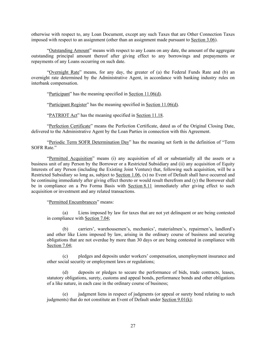 27 otherwise with respect to, any Loan Document, except any such Taxes that are Other Connection Taxes imposed with respect to an assignment (other than an assignment made pursuant to Section 3.06). “Outstanding Amount” means with respect to any Loans on any date, the amount of the aggregate outstanding principal amount thereof after giving effect to any borrowings and prepayments or repayments of any Loans occurring on such date. “Overnight Rate” means, for any day, the greater of (a) the Federal Funds Rate and (b) an overnight rate determined by the Administrative Agent, in accordance with banking industry rules on interbank compensation. “Participant” has the meaning specified in Section 11.06(d). “Participant Register” has the meaning specified in Section 11.06(d). “PATRIOT Act” has the meaning specified in Section 11.18. “Perfection Certificate” means the Perfection Certificate, dated as of the Original Closing Date, delivered to the Administrative Agent by the Loan Parties in connection with this Agreement. “Periodic Term SOFR Determination Day” has the meaning set forth in the definition of “Term SOFR Rate.” “Permitted Acquisition” means (i) any acquisition of all or substantially all the assets or a business unit of any Person by the Borrower or a Restricted Subsidiary and (ii) any acquisition of Equity Interests of any Person (including the Existing Joint Venture) that, following such acquisition, will be a Restricted Subsidiary so long as, subject to Section 1.06, (x) no Event of Default shall have occurred and be continuing immediately after giving effect thereto or would result therefrom and (y) the Borrower shall be in compliance on a Pro Forma Basis with Section 8.11 immediately after giving effect to such acquisition or investment and any related transactions. “Permitted Encumbrances” means: (a) Liens imposed by law for taxes that are not yet delinquent or are being contested in compliance with Section 7.04; (b) carriers’, warehousemen’s, mechanics’, materialmen’s, repairmen’s, landlord’s and other like Liens imposed by law, arising in the ordinary course of business and securing obligations that are not overdue by more than 30 days or are being contested in compliance with Section 7.04; (c) pledges and deposits under workers’ compensation, unemployment insurance and other social security or employment laws or regulations; (d) deposits or pledges to secure the performance of bids, trade contracts, leases, statutory obligations, surety, customs and appeal bonds, performance bonds and other obligations of a like nature, in each case in the ordinary course of business; (e) judgment liens in respect of judgments (or appeal or surety bond relating to such judgments) that do not constitute an Event of Default under Section 9.01(k);