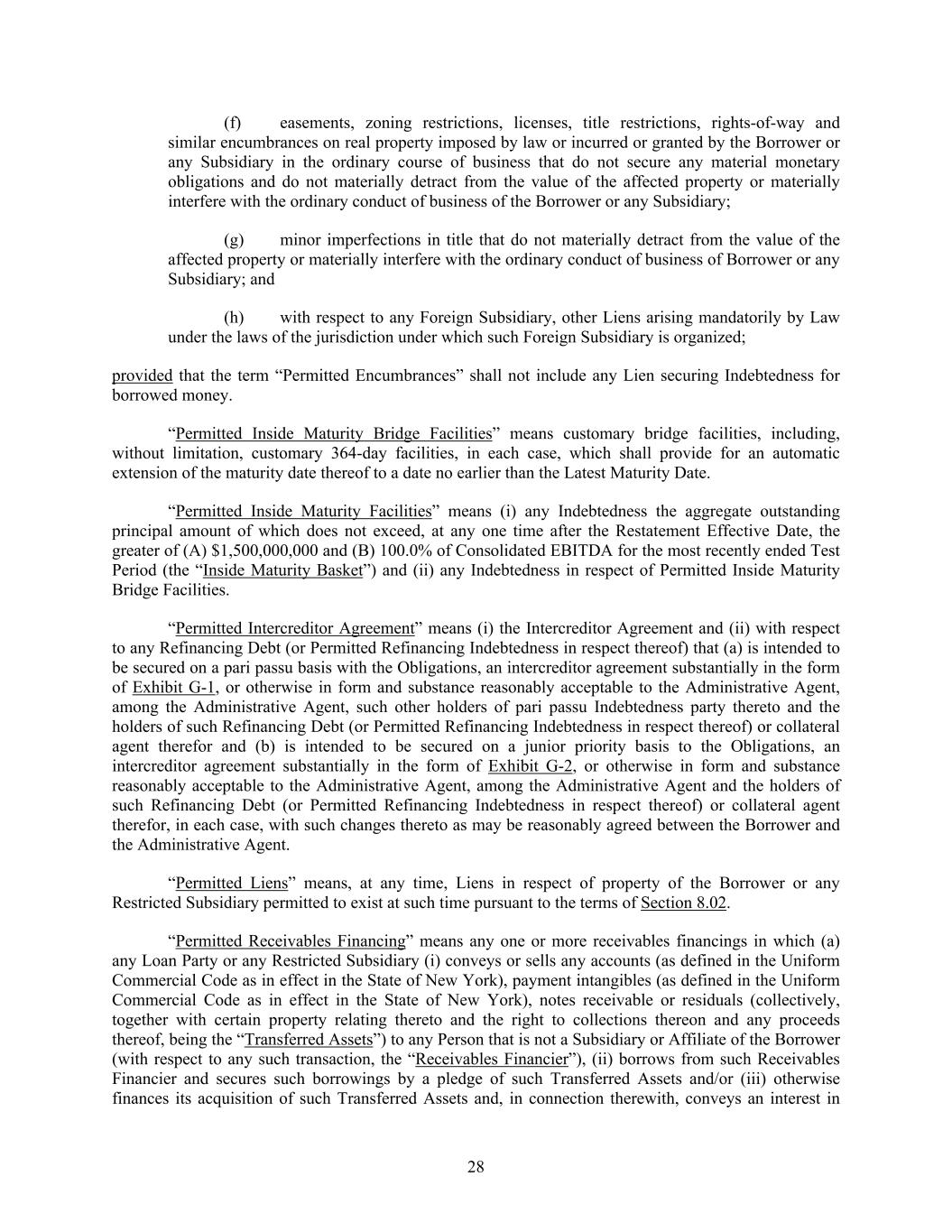 28 (f) easements, zoning restrictions, licenses, title restrictions, rights-of-way and similar encumbrances on real property imposed by law or incurred or granted by the Borrower or any Subsidiary in the ordinary course of business that do not secure any material monetary obligations and do not materially detract from the value of the affected property or materially interfere with the ordinary conduct of business of the Borrower or any Subsidiary; (g) minor imperfections in title that do not materially detract from the value of the affected property or materially interfere with the ordinary conduct of business of Borrower or any Subsidiary; and (h) with respect to any Foreign Subsidiary, other Liens arising mandatorily by Law under the laws of the jurisdiction under which such Foreign Subsidiary is organized; provided that the term “Permitted Encumbrances” shall not include any Lien securing Indebtedness for borrowed money. “Permitted Inside Maturity Bridge Facilities” means customary bridge facilities, including, without limitation, customary 364-day facilities, in each case, which shall provide for an automatic extension of the maturity date thereof to a date no earlier than the Latest Maturity Date. “Permitted Inside Maturity Facilities” means (i) any Indebtedness the aggregate outstanding principal amount of which does not exceed, at any one time after the Restatement Effective Date, the greater of (A) $1,500,000,000 and (B) 100.0% of Consolidated EBITDA for the most recently ended Test Period (the “Inside Maturity Basket”) and (ii) any Indebtedness in respect of Permitted Inside Maturity Bridge Facilities. “Permitted Intercreditor Agreement” means (i) the Intercreditor Agreement and (ii) with respect to any Refinancing Debt (or Permitted Refinancing Indebtedness in respect thereof) that (a) is intended to be secured on a pari passu basis with the Obligations, an intercreditor agreement substantially in the form of Exhibit G-1, or otherwise in form and substance reasonably acceptable to the Administrative Agent, among the Administrative Agent, such other holders of pari passu Indebtedness party thereto and the holders of such Refinancing Debt (or Permitted Refinancing Indebtedness in respect thereof) or collateral agent therefor and (b) is intended to be secured on a junior priority basis to the Obligations, an intercreditor agreement substantially in the form of Exhibit G-2, or otherwise in form and substance reasonably acceptable to the Administrative Agent, among the Administrative Agent and the holders of such Refinancing Debt (or Permitted Refinancing Indebtedness in respect thereof) or collateral agent therefor, in each case, with such changes thereto as may be reasonably agreed between the Borrower and the Administrative Agent. “Permitted Liens” means, at any time, Liens in respect of property of the Borrower or any Restricted Subsidiary permitted to exist at such time pursuant to the terms of Section 8.02. “Permitted Receivables Financing” means any one or more receivables financings in which (a) any Loan Party or any Restricted Subsidiary (i) conveys or sells any accounts (as defined in the Uniform Commercial Code as in effect in the State of New York), payment intangibles (as defined in the Uniform Commercial Code as in effect in the State of New York), notes receivable or residuals (collectively, together with certain property relating thereto and the right to collections thereon and any proceeds thereof, being the “Transferred Assets”) to any Person that is not a Subsidiary or Affiliate of the Borrower (with respect to any such transaction, the “Receivables Financier”), (ii) borrows from such Receivables Financier and secures such borrowings by a pledge of such Transferred Assets and/or (iii) otherwise finances its acquisition of such Transferred Assets and, in connection therewith, conveys an interest in