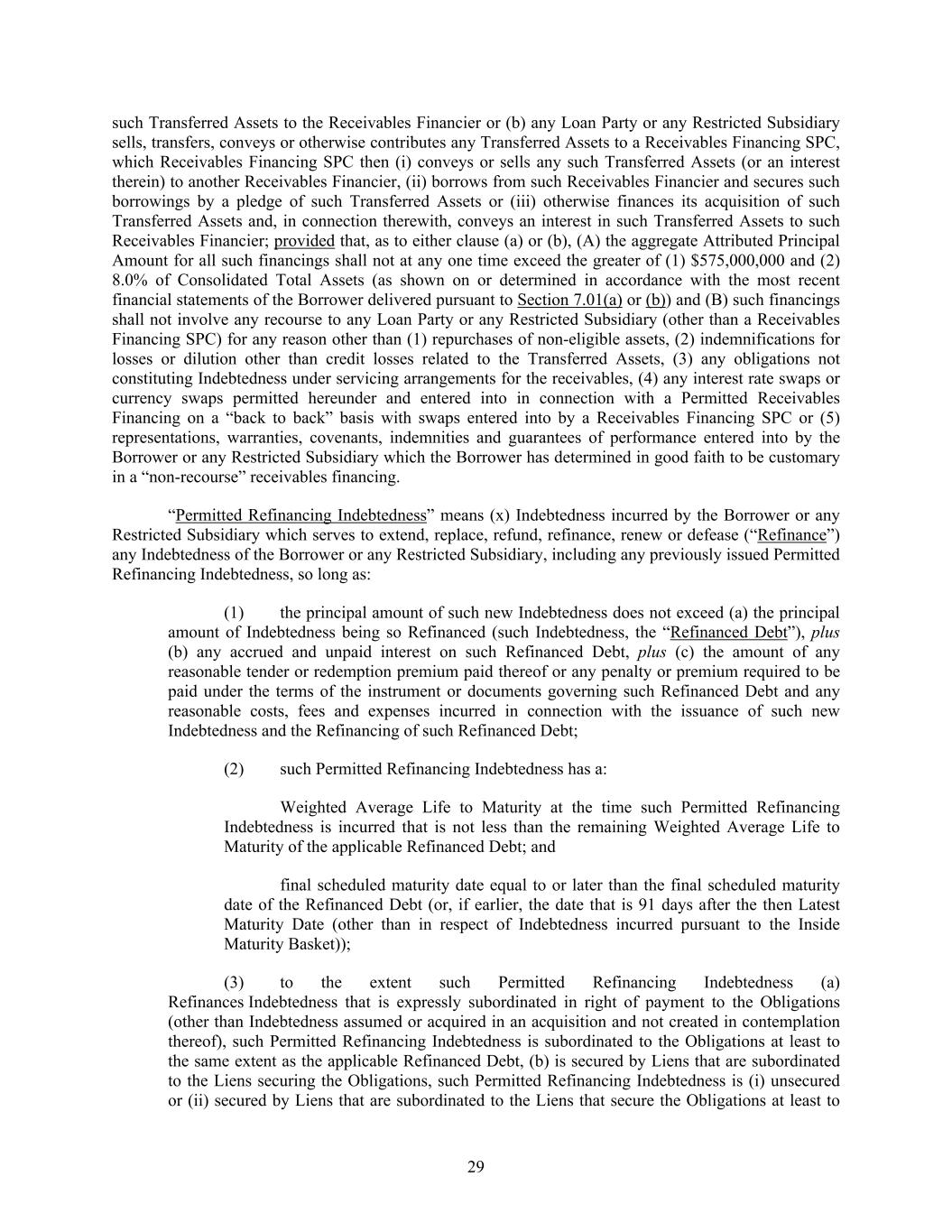 29 such Transferred Assets to the Receivables Financier or (b) any Loan Party or any Restricted Subsidiary sells, transfers, conveys or otherwise contributes any Transferred Assets to a Receivables Financing SPC, which Receivables Financing SPC then (i) conveys or sells any such Transferred Assets (or an interest therein) to another Receivables Financier, (ii) borrows from such Receivables Financier and secures such borrowings by a pledge of such Transferred Assets or (iii) otherwise finances its acquisition of such Transferred Assets and, in connection therewith, conveys an interest in such Transferred Assets to such Receivables Financier; provided that, as to either clause (a) or (b), (A) the aggregate Attributed Principal Amount for all such financings shall not at any one time exceed the greater of (1) $575,000,000 and (2) 8.0% of Consolidated Total Assets (as shown on or determined in accordance with the most recent financial statements of the Borrower delivered pursuant to Section 7.01(a) or (b)) and (B) such financings shall not involve any recourse to any Loan Party or any Restricted Subsidiary (other than a Receivables Financing SPC) for any reason other than (1) repurchases of non-eligible assets, (2) indemnifications for losses or dilution other than credit losses related to the Transferred Assets, (3) any obligations not constituting Indebtedness under servicing arrangements for the receivables, (4) any interest rate swaps or currency swaps permitted hereunder and entered into in connection with a Permitted Receivables Financing on a “back to back” basis with swaps entered into by a Receivables Financing SPC or (5) representations, warranties, covenants, indemnities and guarantees of performance entered into by the Borrower or any Restricted Subsidiary which the Borrower has determined in good faith to be customary in a “non-recourse” receivables financing. “Permitted Refinancing Indebtedness” means (x) Indebtedness incurred by the Borrower or any Restricted Subsidiary which serves to extend, replace, refund, refinance, renew or defease (“Refinance”) any Indebtedness of the Borrower or any Restricted Subsidiary, including any previously issued Permitted Refinancing Indebtedness, so long as: (1) the principal amount of such new Indebtedness does not exceed (a) the principal amount of Indebtedness being so Refinanced (such Indebtedness, the “Refinanced Debt”), plus (b) any accrued and unpaid interest on such Refinanced Debt, plus (c) the amount of any reasonable tender or redemption premium paid thereof or any penalty or premium required to be paid under the terms of the instrument or documents governing such Refinanced Debt and any reasonable costs, fees and expenses incurred in connection with the issuance of such new Indebtedness and the Refinancing of such Refinanced Debt; (2) such Permitted Refinancing Indebtedness has a: Weighted Average Life to Maturity at the time such Permitted Refinancing Indebtedness is incurred that is not less than the remaining Weighted Average Life to Maturity of the applicable Refinanced Debt; and final scheduled maturity date equal to or later than the final scheduled maturity date of the Refinanced Debt (or, if earlier, the date that is 91 days after the then Latest Maturity Date (other than in respect of Indebtedness incurred pursuant to the Inside Maturity Basket)); (3) to the extent such Permitted Refinancing Indebtedness (a) Refinances Indebtedness that is expressly subordinated in right of payment to the Obligations (other than Indebtedness assumed or acquired in an acquisition and not created in contemplation thereof), such Permitted Refinancing Indebtedness is subordinated to the Obligations at least to the same extent as the applicable Refinanced Debt, (b) is secured by Liens that are subordinated to the Liens securing the Obligations, such Permitted Refinancing Indebtedness is (i) unsecured or (ii) secured by Liens that are subordinated to the Liens that secure the Obligations at least to