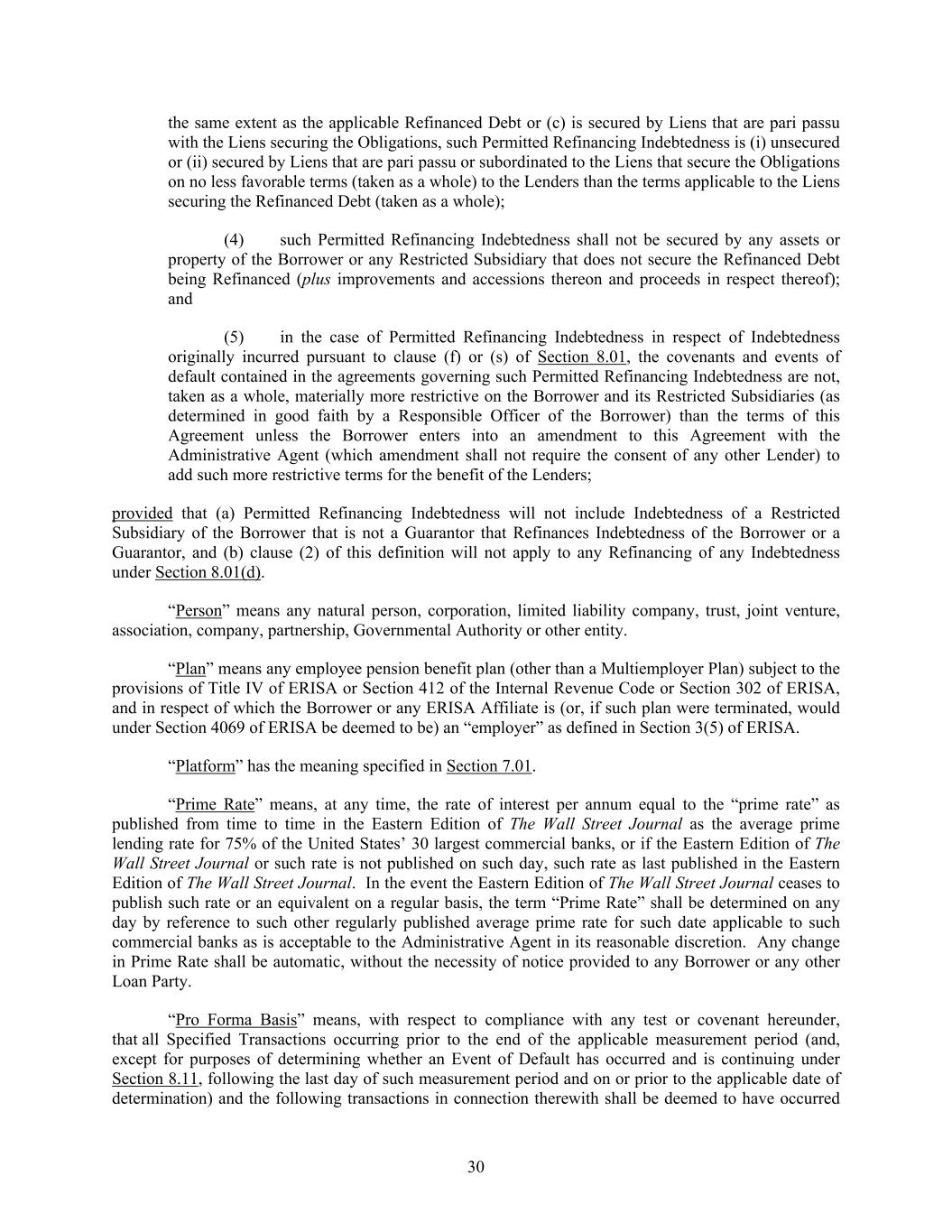 30 the same extent as the applicable Refinanced Debt or (c) is secured by Liens that are pari passu with the Liens securing the Obligations, such Permitted Refinancing Indebtedness is (i) unsecured or (ii) secured by Liens that are pari passu or subordinated to the Liens that secure the Obligations on no less favorable terms (taken as a whole) to the Lenders than the terms applicable to the Liens securing the Refinanced Debt (taken as a whole); (4) such Permitted Refinancing Indebtedness shall not be secured by any assets or property of the Borrower or any Restricted Subsidiary that does not secure the Refinanced Debt being Refinanced (plus improvements and accessions thereon and proceeds in respect thereof); and (5) in the case of Permitted Refinancing Indebtedness in respect of Indebtedness originally incurred pursuant to clause (f) or (s) of Section 8.01, the covenants and events of default contained in the agreements governing such Permitted Refinancing Indebtedness are not, taken as a whole, materially more restrictive on the Borrower and its Restricted Subsidiaries (as determined in good faith by a Responsible Officer of the Borrower) than the terms of this Agreement unless the Borrower enters into an amendment to this Agreement with the Administrative Agent (which amendment shall not require the consent of any other Lender) to add such more restrictive terms for the benefit of the Lenders; provided that (a) Permitted Refinancing Indebtedness will not include Indebtedness of a Restricted Subsidiary of the Borrower that is not a Guarantor that Refinances Indebtedness of the Borrower or a Guarantor, and (b) clause (2) of this definition will not apply to any Refinancing of any Indebtedness under Section 8.01(d). “Person” means any natural person, corporation, limited liability company, trust, joint venture, association, company, partnership, Governmental Authority or other entity. “Plan” means any employee pension benefit plan (other than a Multiemployer Plan) subject to the provisions of Title IV of ERISA or Section 412 of the Internal Revenue Code or Section 302 of ERISA, and in respect of which the Borrower or any ERISA Affiliate is (or, if such plan were terminated, would under Section 4069 of ERISA be deemed to be) an “employer” as defined in Section 3(5) of ERISA. “Platform” has the meaning specified in Section 7.01. “Prime Rate” means, at any time, the rate of interest per annum equal to the “prime rate” as published from time to time in the Eastern Edition of The Wall Street Journal as the average prime lending rate for 75% of the United States’ 30 largest commercial banks, or if the Eastern Edition of The Wall Street Journal or such rate is not published on such day, such rate as last published in the Eastern Edition of The Wall Street Journal. In the event the Eastern Edition of The Wall Street Journal ceases to publish such rate or an equivalent on a regular basis, the term “Prime Rate” shall be determined on any day by reference to such other regularly published average prime rate for such date applicable to such commercial banks as is acceptable to the Administrative Agent in its reasonable discretion. Any change in Prime Rate shall be automatic, without the necessity of notice provided to any Borrower or any other Loan Party. “Pro Forma Basis” means, with respect to compliance with any test or covenant hereunder, that all Specified Transactions occurring prior to the end of the applicable measurement period (and, except for purposes of determining whether an Event of Default has occurred and is continuing under Section 8.11, following the last day of such measurement period and on or prior to the applicable date of determination) and the following transactions in connection therewith shall be deemed to have occurred