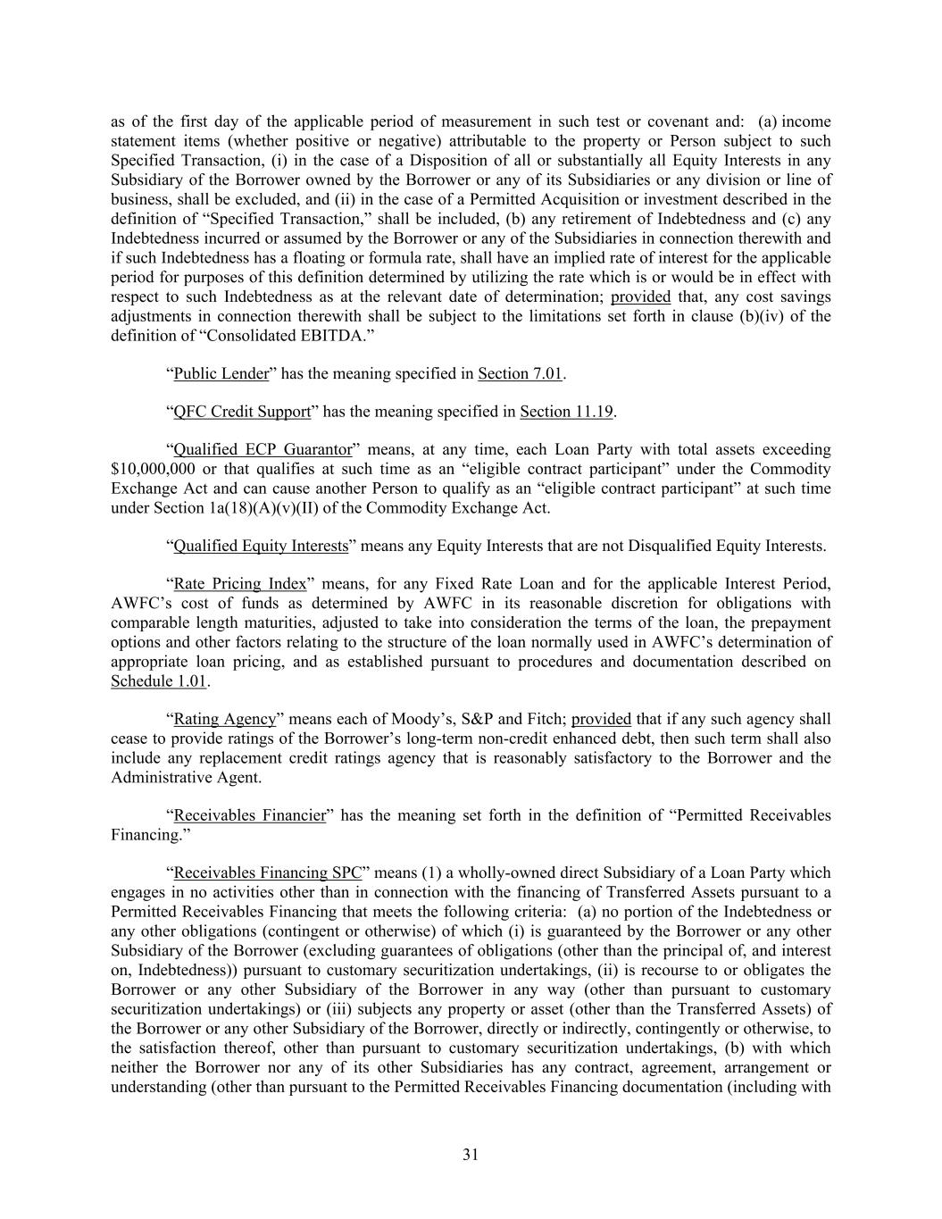 31 as of the first day of the applicable period of measurement in such test or covenant and: (a) income statement items (whether positive or negative) attributable to the property or Person subject to such Specified Transaction, (i) in the case of a Disposition of all or substantially all Equity Interests in any Subsidiary of the Borrower owned by the Borrower or any of its Subsidiaries or any division or line of business, shall be excluded, and (ii) in the case of a Permitted Acquisition or investment described in the definition of “Specified Transaction,” shall be included, (b) any retirement of Indebtedness and (c) any Indebtedness incurred or assumed by the Borrower or any of the Subsidiaries in connection therewith and if such Indebtedness has a floating or formula rate, shall have an implied rate of interest for the applicable period for purposes of this definition determined by utilizing the rate which is or would be in effect with respect to such Indebtedness as at the relevant date of determination; provided that, any cost savings adjustments in connection therewith shall be subject to the limitations set forth in clause (b)(iv) of the definition of “Consolidated EBITDA.” “Public Lender” has the meaning specified in Section 7.01. “QFC Credit Support” has the meaning specified in Section 11.19. “Qualified ECP Guarantor” means, at any time, each Loan Party with total assets exceeding $10,000,000 or that qualifies at such time as an “eligible contract participant” under the Commodity Exchange Act and can cause another Person to qualify as an “eligible contract participant” at such time under Section 1a(18)(A)(v)(II) of the Commodity Exchange Act. “Qualified Equity Interests” means any Equity Interests that are not Disqualified Equity Interests. “Rate Pricing Index” means, for any Fixed Rate Loan and for the applicable Interest Period, AWFC’s cost of funds as determined by AWFC in its reasonable discretion for obligations with comparable length maturities, adjusted to take into consideration the terms of the loan, the prepayment options and other factors relating to the structure of the loan normally used in AWFC’s determination of appropriate loan pricing, and as established pursuant to procedures and documentation described on Schedule 1.01. “Rating Agency” means each of Moody’s, S&P and Fitch; provided that if any such agency shall cease to provide ratings of the Borrower’s long-term non-credit enhanced debt, then such term shall also include any replacement credit ratings agency that is reasonably satisfactory to the Borrower and the Administrative Agent. “Receivables Financier” has the meaning set forth in the definition of “Permitted Receivables Financing.” “Receivables Financing SPC” means (1) a wholly-owned direct Subsidiary of a Loan Party which engages in no activities other than in connection with the financing of Transferred Assets pursuant to a Permitted Receivables Financing that meets the following criteria: (a) no portion of the Indebtedness or any other obligations (contingent or otherwise) of which (i) is guaranteed by the Borrower or any other Subsidiary of the Borrower (excluding guarantees of obligations (other than the principal of, and interest on, Indebtedness)) pursuant to customary securitization undertakings, (ii) is recourse to or obligates the Borrower or any other Subsidiary of the Borrower in any way (other than pursuant to customary securitization undertakings) or (iii) subjects any property or asset (other than the Transferred Assets) of the Borrower or any other Subsidiary of the Borrower, directly or indirectly, contingently or otherwise, to the satisfaction thereof, other than pursuant to customary securitization undertakings, (b) with which neither the Borrower nor any of its other Subsidiaries has any contract, agreement, arrangement or understanding (other than pursuant to the Permitted Receivables Financing documentation (including with