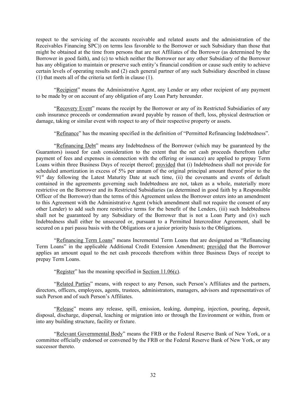 32 respect to the servicing of the accounts receivable and related assets and the administration of the Receivables Financing SPC)) on terms less favorable to the Borrower or such Subsidiary than those that might be obtained at the time from persons that are not Affiliates of the Borrower (as determined by the Borrower in good faith), and (c) to which neither the Borrower nor any other Subsidiary of the Borrower has any obligation to maintain or preserve such entity’s financial condition or cause such entity to achieve certain levels of operating results and (2) each general partner of any such Subsidiary described in clause (1) that meets all of the criteria set forth in clause (1). “Recipient” means the Administrative Agent, any Lender or any other recipient of any payment to be made by or on account of any obligation of any Loan Party hereunder. “Recovery Event” means the receipt by the Borrower or any of its Restricted Subsidiaries of any cash insurance proceeds or condemnation award payable by reason of theft, loss, physical destruction or damage, taking or similar event with respect to any of their respective property or assets. “Refinance” has the meaning specified in the definition of “Permitted Refinancing Indebtedness”. “Refinancing Debt” means any Indebtedness of the Borrower (which may be guaranteed by the Guarantors) issued for cash consideration to the extent that the net cash proceeds therefrom (after payment of fees and expenses in connection with the offering or issuance) are applied to prepay Term Loans within three Business Days of receipt thereof; provided that (i) Indebtedness shall not provide for scheduled amortization in excess of 5% per annum of the original principal amount thereof prior to the 91st day following the Latest Maturity Date at such time, (ii) the covenants and events of default contained in the agreements governing such Indebtedness are not, taken as a whole, materially more restrictive on the Borrower and its Restricted Subsidiaries (as determined in good faith by a Responsible Officer of the Borrower) than the terms of this Agreement unless the Borrower enters into an amendment to this Agreement with the Administrative Agent (which amendment shall not require the consent of any other Lender) to add such more restrictive terms for the benefit of the Lenders, (iii) such Indebtedness shall not be guaranteed by any Subsidiary of the Borrower that is not a Loan Party and (iv) such Indebtedness shall either be unsecured or, pursuant to a Permitted Intercreditor Agreement, shall be secured on a pari passu basis with the Obligations or a junior priority basis to the Obligations. “Refinancing Term Loans” means Incremental Term Loans that are designated as “Refinancing Term Loans” in the applicable Additional Credit Extension Amendment; provided that the Borrower applies an amount equal to the net cash proceeds therefrom within three Business Days of receipt to prepay Term Loans. “Register” has the meaning specified in Section 11.06(c). “Related Parties” means, with respect to any Person, such Person’s Affiliates and the partners, directors, officers, employees, agents, trustees, administrators, managers, advisors and representatives of such Person and of such Person’s Affiliates. “Release” means any release, spill, emission, leaking, dumping, injection, pouring, deposit, disposal, discharge, dispersal, leaching or migration into or through the Environment or within, from or into any building structure, facility or fixture. “Relevant Governmental Body” means the FRB or the Federal Reserve Bank of New York, or a committee officially endorsed or convened by the FRB or the Federal Reserve Bank of New York, or any successor thereto.