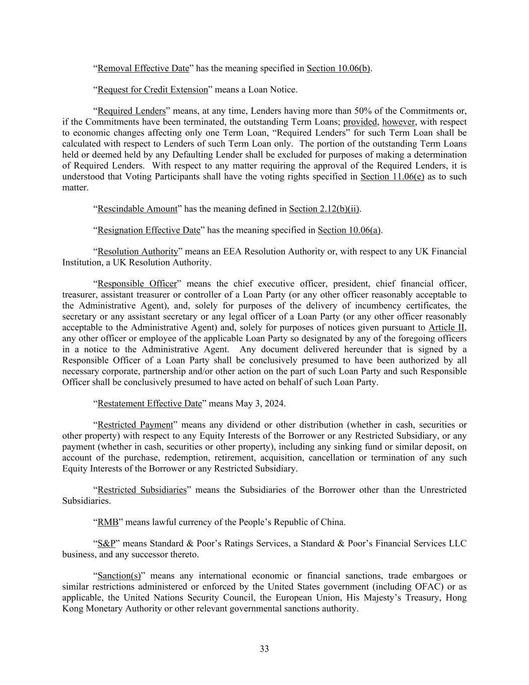33 “Removal Effective Date” has the meaning specified in Section 10.06(b). “Request for Credit Extension” means a Loan Notice. “Required Lenders” means, at any time, Lenders having more than 50% of the Commitments or, if the Commitments have been terminated, the outstanding Term Loans; provided, however, with respect to economic changes affecting only one Term Loan, “Required Lenders” for such Term Loan shall be calculated with respect to Lenders of such Term Loan only. The portion of the outstanding Term Loans held or deemed held by any Defaulting Lender shall be excluded for purposes of making a determination of Required Lenders. With respect to any matter requiring the approval of the Required Lenders, it is understood that Voting Participants shall have the voting rights specified in Section 11.06(e) as to such matter. “Rescindable Amount” has the meaning defined in Section 2.12(b)(ii). “Resignation Effective Date” has the meaning specified in Section 10.06(a). “Resolution Authority” means an EEA Resolution Authority or, with respect to any UK Financial Institution, a UK Resolution Authority. “Responsible Officer” means the chief executive officer, president, chief financial officer, treasurer, assistant treasurer or controller of a Loan Party (or any other officer reasonably acceptable to the Administrative Agent), and, solely for purposes of the delivery of incumbency certificates, the secretary or any assistant secretary or any legal officer of a Loan Party (or any other officer reasonably acceptable to the Administrative Agent) and, solely for purposes of notices given pursuant to Article II, any other officer or employee of the applicable Loan Party so designated by any of the foregoing officers in a notice to the Administrative Agent. Any document delivered hereunder that is signed by a Responsible Officer of a Loan Party shall be conclusively presumed to have been authorized by all necessary corporate, partnership and/or other action on the part of such Loan Party and such Responsible Officer shall be conclusively presumed to have acted on behalf of such Loan Party. “Restatement Effective Date” means May 3, 2024. “Restricted Payment” means any dividend or other distribution (whether in cash, securities or other property) with respect to any Equity Interests of the Borrower or any Restricted Subsidiary, or any payment (whether in cash, securities or other property), including any sinking fund or similar deposit, on account of the purchase, redemption, retirement, acquisition, cancellation or termination of any such Equity Interests of the Borrower or any Restricted Subsidiary. “Restricted Subsidiaries” means the Subsidiaries of the Borrower other than the Unrestricted Subsidiaries. “RMB” means lawful currency of the People’s Republic of China. “S&P” means Standard & Poor’s Ratings Services, a Standard & Poor’s Financial Services LLC business, and any successor thereto. “Sanction(s)” means any international economic or financial sanctions, trade embargoes or similar restrictions administered or enforced by the United States government (including OFAC) or as applicable, the United Nations Security Council, the European Union, His Majesty’s Treasury, Hong Kong Monetary Authority or other relevant governmental sanctions authority.