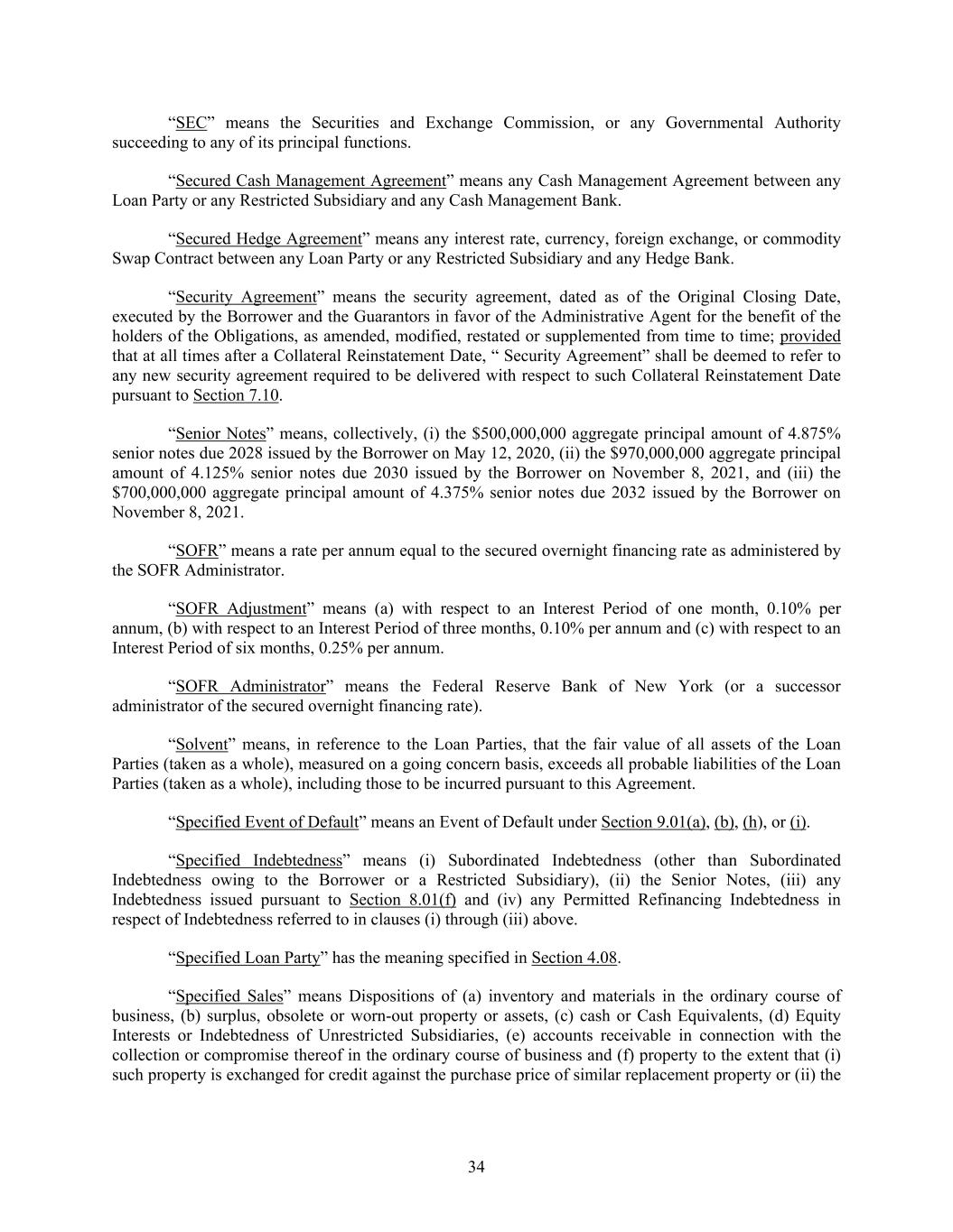 34 “SEC” means the Securities and Exchange Commission, or any Governmental Authority succeeding to any of its principal functions. “Secured Cash Management Agreement” means any Cash Management Agreement between any Loan Party or any Restricted Subsidiary and any Cash Management Bank. “Secured Hedge Agreement” means any interest rate, currency, foreign exchange, or commodity Swap Contract between any Loan Party or any Restricted Subsidiary and any Hedge Bank. “Security Agreement” means the security agreement, dated as of the Original Closing Date, executed by the Borrower and the Guarantors in favor of the Administrative Agent for the benefit of the holders of the Obligations, as amended, modified, restated or supplemented from time to time; provided that at all times after a Collateral Reinstatement Date, “ Security Agreement” shall be deemed to refer to any new security agreement required to be delivered with respect to such Collateral Reinstatement Date pursuant to Section 7.10. “Senior Notes” means, collectively, (i) the $500,000,000 aggregate principal amount of 4.875% senior notes due 2028 issued by the Borrower on May 12, 2020, (ii) the $970,000,000 aggregate principal amount of 4.125% senior notes due 2030 issued by the Borrower on November 8, 2021, and (iii) the $700,000,000 aggregate principal amount of 4.375% senior notes due 2032 issued by the Borrower on November 8, 2021. “SOFR” means a rate per annum equal to the secured overnight financing rate as administered by the SOFR Administrator. “SOFR Adjustment” means (a) with respect to an Interest Period of one month, 0.10% per annum, (b) with respect to an Interest Period of three months, 0.10% per annum and (c) with respect to an Interest Period of six months, 0.25% per annum. “SOFR Administrator” means the Federal Reserve Bank of New York (or a successor administrator of the secured overnight financing rate). “Solvent” means, in reference to the Loan Parties, that the fair value of all assets of the Loan Parties (taken as a whole), measured on a going concern basis, exceeds all probable liabilities of the Loan Parties (taken as a whole), including those to be incurred pursuant to this Agreement. “Specified Event of Default” means an Event of Default under Section 9.01(a), (b), (h), or (i). “Specified Indebtedness” means (i) Subordinated Indebtedness (other than Subordinated Indebtedness owing to the Borrower or a Restricted Subsidiary), (ii) the Senior Notes, (iii) any Indebtedness issued pursuant to Section 8.01(f) and (iv) any Permitted Refinancing Indebtedness in respect of Indebtedness referred to in clauses (i) through (iii) above. “Specified Loan Party” has the meaning specified in Section 4.08. “Specified Sales” means Dispositions of (a) inventory and materials in the ordinary course of business, (b) surplus, obsolete or worn-out property or assets, (c) cash or Cash Equivalents, (d) Equity Interests or Indebtedness of Unrestricted Subsidiaries, (e) accounts receivable in connection with the collection or compromise thereof in the ordinary course of business and (f) property to the extent that (i) such property is exchanged for credit against the purchase price of similar replacement property or (ii) the