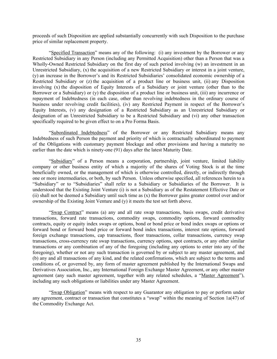 35 proceeds of such Disposition are applied substantially concurrently with such Disposition to the purchase price of similar replacement property. “Specified Transaction” means any of the following: (i) any investment by the Borrower or any Restricted Subsidiary in any Person (including any Permitted Acquisition) other than a Person that was a Wholly-Owned Restricted Subsidiary on the first day of such period involving (w) an investment in an Unrestricted Subsidiary, (x) the acquisition of a new Restricted Subsidiary or interest in a joint venture, (y) an increase in the Borrower’s and its Restricted Subsidiaries’ consolidated economic ownership of a Restricted Subsidiary or (z) the acquisition of a product line or business unit, (ii) any Disposition involving (x) the disposition of Equity Interests of a Subsidiary or joint venture (other than to the Borrower or a Subsidiary) or (y) the disposition of a product line or business unit, (iii) any incurrence or repayment of Indebtedness (in each case, other than revolving indebtedness in the ordinary course of business under revolving credit facilities), (iv) any Restricted Payment in respect of the Borrower’s Equity Interests, (v) any designation of a Restricted Subsidiary as an Unrestricted Subsidiary or designation of an Unrestricted Subsidiary to be a Restricted Subsidiary and (vi) any other transaction specifically required to be given effect to on a Pro Forma Basis. “Subordinated Indebtedness” of the Borrower or any Restricted Subsidiary means any Indebtedness of such Person the payment and priority of which is contractually subordinated to payment of the Obligations with customary payment blockage and other provisions and having a maturity no earlier than the date which is ninety-one (91) days after the latest Maturity Date. “Subsidiary” of a Person means a corporation, partnership, joint venture, limited liability company or other business entity of which a majority of the shares of Voting Stock is at the time beneficially owned, or the management of which is otherwise controlled, directly, or indirectly through one or more intermediaries, or both, by such Person. Unless otherwise specified, all references herein to a “Subsidiary” or to “Subsidiaries” shall refer to a Subsidiary or Subsidiaries of the Borrower. It is understood that the Existing Joint Venture (i) is not a Subsidiary as of the Restatement Effective Date or (ii) shall not be deemed a Subsidiary until such time as (x) the Borrower gains greater control over and/or ownership of the Existing Joint Venture and (y) it meets the test set forth above. “Swap Contract” means (a) any and all rate swap transactions, basis swaps, credit derivative transactions, forward rate transactions, commodity swaps, commodity options, forward commodity contracts, equity or equity index swaps or options, bond or bond price or bond index swaps or options or forward bond or forward bond price or forward bond index transactions, interest rate options, forward foreign exchange transactions, cap transactions, floor transactions, collar transactions, currency swap transactions, cross-currency rate swap transactions, currency options, spot contracts, or any other similar transactions or any combination of any of the foregoing (including any options to enter into any of the foregoing), whether or not any such transaction is governed by or subject to any master agreement, and (b) any and all transactions of any kind, and the related confirmations, which are subject to the terms and conditions of, or governed by, any form of master agreement published by the International Swaps and Derivatives Association, Inc., any International Foreign Exchange Master Agreement, or any other master agreement (any such master agreement, together with any related schedules, a “Master Agreement”), including any such obligations or liabilities under any Master Agreement. “Swap Obligation” means with respect to any Guarantor any obligation to pay or perform under any agreement, contract or transaction that constitutes a “swap” within the meaning of Section 1a(47) of the Commodity Exchange Act.