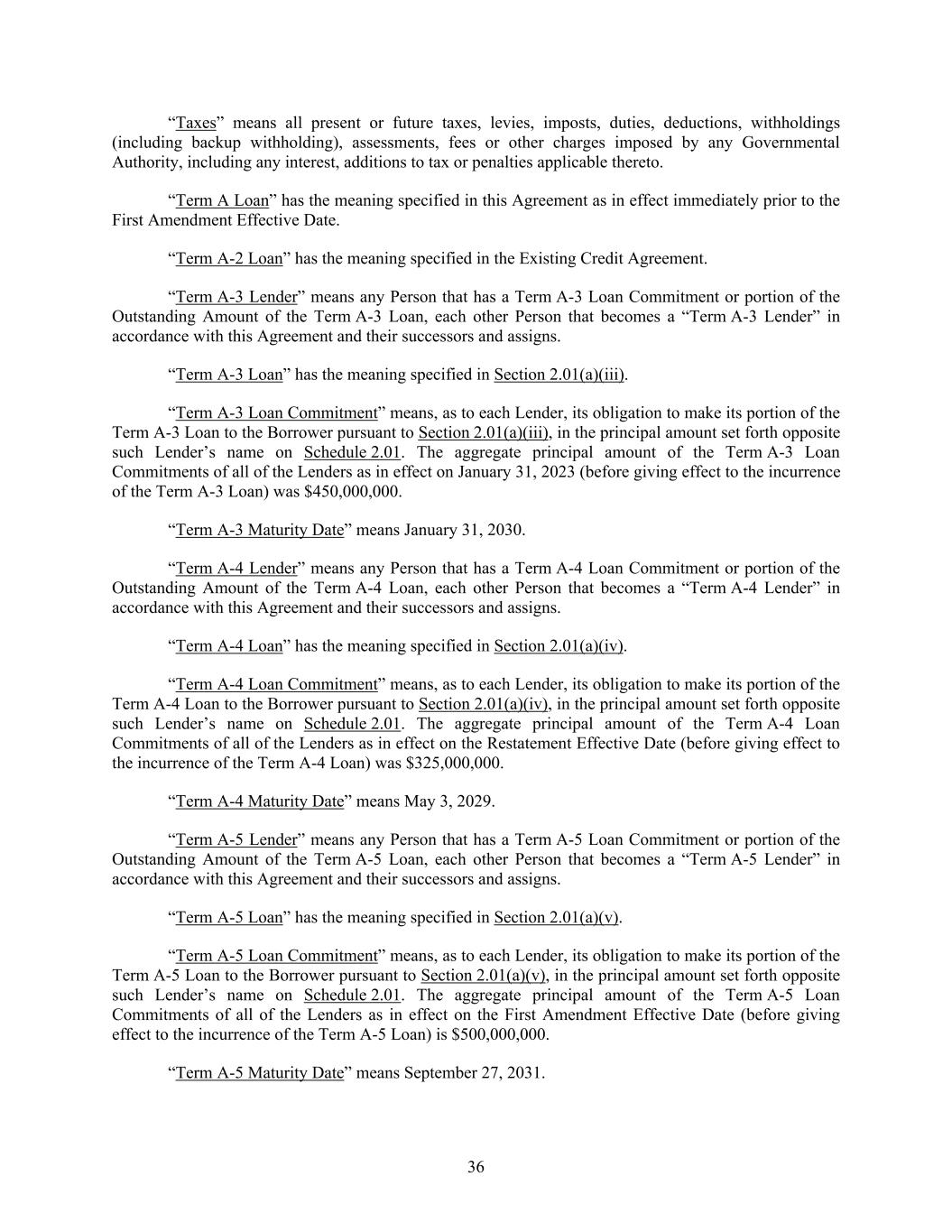 36 “Taxes” means all present or future taxes, levies, imposts, duties, deductions, withholdings (including backup withholding), assessments, fees or other charges imposed by any Governmental Authority, including any interest, additions to tax or penalties applicable thereto. “Term A Loan” has the meaning specified in this Agreement as in effect immediately prior to the First Amendment Effective Date. “Term A-2 Loan” has the meaning specified in the Existing Credit Agreement. “Term A-3 Lender” means any Person that has a Term A-3 Loan Commitment or portion of the Outstanding Amount of the Term A-3 Loan, each other Person that becomes a “Term A-3 Lender” in accordance with this Agreement and their successors and assigns. “Term A-3 Loan” has the meaning specified in Section 2.01(a)(iii). “Term A-3 Loan Commitment” means, as to each Lender, its obligation to make its portion of the Term A-3 Loan to the Borrower pursuant to Section 2.01(a)(iii), in the principal amount set forth opposite such Lender’s name on Schedule 2.01. The aggregate principal amount of the Term A-3 Loan Commitments of all of the Lenders as in effect on January 31, 2023 (before giving effect to the incurrence of the Term A-3 Loan) was $450,000,000. “Term A-3 Maturity Date” means January 31, 2030. “Term A-4 Lender” means any Person that has a Term A-4 Loan Commitment or portion of the Outstanding Amount of the Term A-4 Loan, each other Person that becomes a “Term A-4 Lender” in accordance with this Agreement and their successors and assigns. “Term A-4 Loan” has the meaning specified in Section 2.01(a)(iv). “Term A-4 Loan Commitment” means, as to each Lender, its obligation to make its portion of the Term A-4 Loan to the Borrower pursuant to Section 2.01(a)(iv), in the principal amount set forth opposite such Lender’s name on Schedule 2.01. The aggregate principal amount of the Term A-4 Loan Commitments of all of the Lenders as in effect on the Restatement Effective Date (before giving effect to the incurrence of the Term A-4 Loan) was $325,000,000. “Term A-4 Maturity Date” means May 3, 2029. “Term A-5 Lender” means any Person that has a Term A-5 Loan Commitment or portion of the Outstanding Amount of the Term A-5 Loan, each other Person that becomes a “Term A-5 Lender” in accordance with this Agreement and their successors and assigns. “Term A-5 Loan” has the meaning specified in Section 2.01(a)(v). “Term A-5 Loan Commitment” means, as to each Lender, its obligation to make its portion of the Term A-5 Loan to the Borrower pursuant to Section 2.01(a)(v), in the principal amount set forth opposite such Lender’s name on Schedule 2.01. The aggregate principal amount of the Term A-5 Loan Commitments of all of the Lenders as in effect on the First Amendment Effective Date (before giving effect to the incurrence of the Term A-5 Loan) is $500,000,000. “Term A-5 Maturity Date” means September 27, 2031.