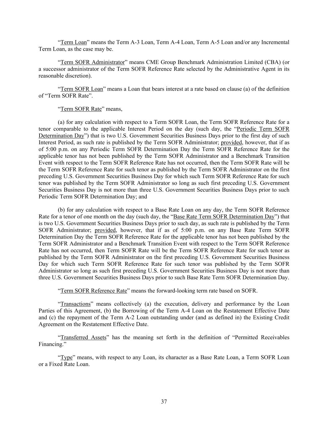 37 “Term Loan” means the Term A-3 Loan, Term A-4 Loan, Term A-5 Loan and/or any Incremental Term Loan, as the case may be. “Term SOFR Administrator” means CME Group Benchmark Administration Limited (CBA) (or a successor administrator of the Term SOFR Reference Rate selected by the Administrative Agent in its reasonable discretion). “Term SOFR Loan” means a Loan that bears interest at a rate based on clause (a) of the definition of “Term SOFR Rate”. “Term SOFR Rate” means, (a) for any calculation with respect to a Term SOFR Loan, the Term SOFR Reference Rate for a tenor comparable to the applicable Interest Period on the day (such day, the “Periodic Term SOFR Determination Day”) that is two U.S. Government Securities Business Days prior to the first day of such Interest Period, as such rate is published by the Term SOFR Administrator; provided, however, that if as of 5:00 p.m. on any Periodic Term SOFR Determination Day the Term SOFR Reference Rate for the applicable tenor has not been published by the Term SOFR Administrator and a Benchmark Transition Event with respect to the Term SOFR Reference Rate has not occurred, then the Term SOFR Rate will be the Term SOFR Reference Rate for such tenor as published by the Term SOFR Administrator on the first preceding U.S. Government Securities Business Day for which such Term SOFR Reference Rate for such tenor was published by the Term SOFR Administrator so long as such first preceding U.S. Government Securities Business Day is not more than three U.S. Government Securities Business Days prior to such Periodic Term SOFR Determination Day; and (b) for any calculation with respect to a Base Rate Loan on any day, the Term SOFR Reference Rate for a tenor of one month on the day (such day, the “Base Rate Term SOFR Determination Day”) that is two U.S. Government Securities Business Days prior to such day, as such rate is published by the Term SOFR Administrator; provided, however, that if as of 5:00 p.m. on any Base Rate Term SOFR Determination Day the Term SOFR Reference Rate for the applicable tenor has not been published by the Term SOFR Administrator and a Benchmark Transition Event with respect to the Term SOFR Reference Rate has not occurred, then Term SOFR Rate will be the Term SOFR Reference Rate for such tenor as published by the Term SOFR Administrator on the first preceding U.S. Government Securities Business Day for which such Term SOFR Reference Rate for such tenor was published by the Term SOFR Administrator so long as such first preceding U.S. Government Securities Business Day is not more than three U.S. Government Securities Business Days prior to such Base Rate Term SOFR Determination Day. “Term SOFR Reference Rate” means the forward-looking term rate based on SOFR. “Transactions” means collectively (a) the execution, delivery and performance by the Loan Parties of this Agreement, (b) the Borrowing of the Term A-4 Loan on the Restatement Effective Date and (c) the repayment of the Term A-2 Loan outstanding under (and as defined in) the Existing Credit Agreement on the Restatement Effective Date. “Transferred Assets” has the meaning set forth in the definition of “Permitted Receivables Financing.” “Type” means, with respect to any Loan, its character as a Base Rate Loan, a Term SOFR Loan or a Fixed Rate Loan.