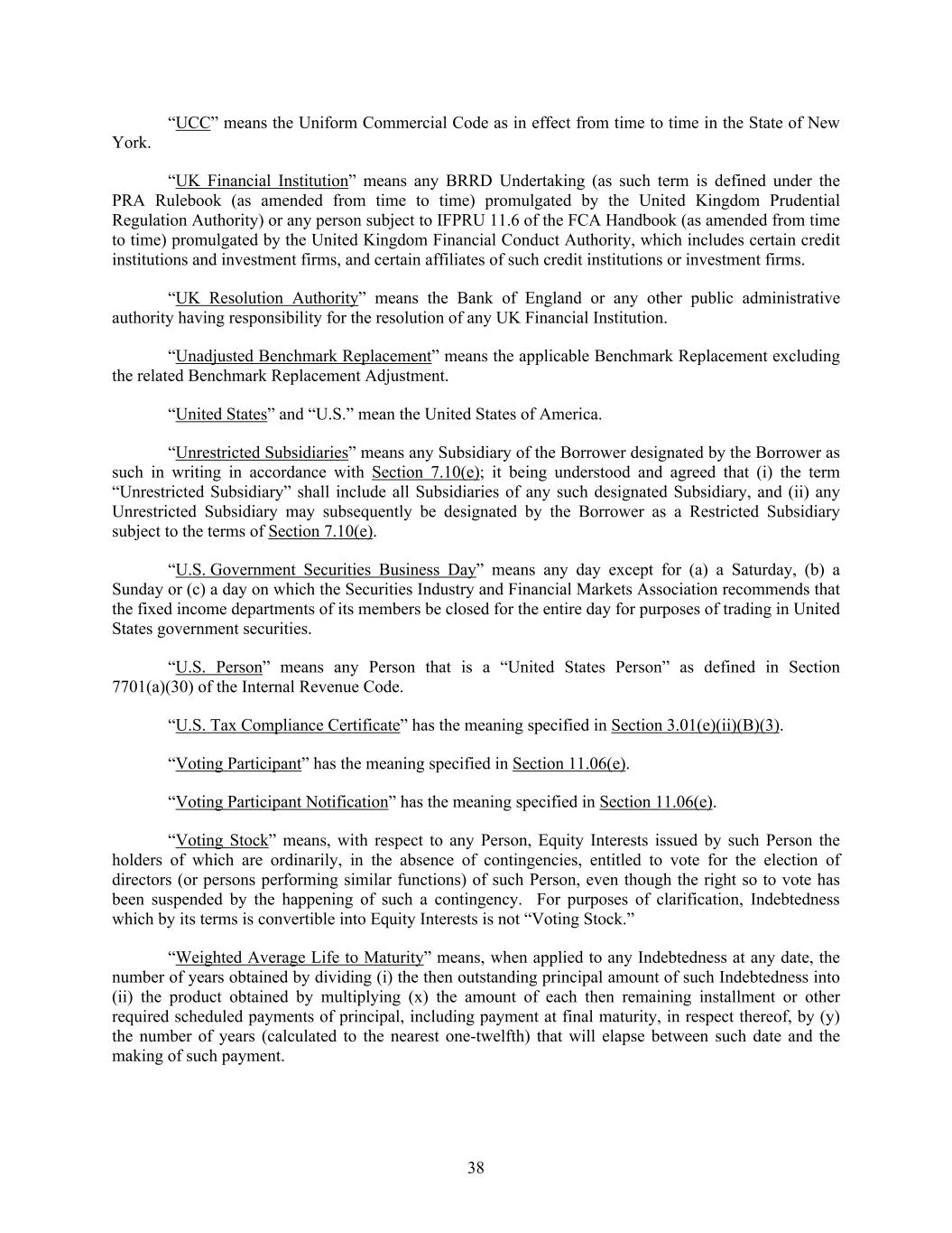 38 “UCC” means the Uniform Commercial Code as in effect from time to time in the State of New York. “UK Financial Institution” means any BRRD Undertaking (as such term is defined under the PRA Rulebook (as amended from time to time) promulgated by the United Kingdom Prudential Regulation Authority) or any person subject to IFPRU 11.6 of the FCA Handbook (as amended from time to time) promulgated by the United Kingdom Financial Conduct Authority, which includes certain credit institutions and investment firms, and certain affiliates of such credit institutions or investment firms. “UK Resolution Authority” means the Bank of England or any other public administrative authority having responsibility for the resolution of any UK Financial Institution. “Unadjusted Benchmark Replacement” means the applicable Benchmark Replacement excluding the related Benchmark Replacement Adjustment. “United States” and “U.S.” mean the United States of America. “Unrestricted Subsidiaries” means any Subsidiary of the Borrower designated by the Borrower as such in writing in accordance with Section 7.10(e); it being understood and agreed that (i) the term “Unrestricted Subsidiary” shall include all Subsidiaries of any such designated Subsidiary, and (ii) any Unrestricted Subsidiary may subsequently be designated by the Borrower as a Restricted Subsidiary subject to the terms of Section 7.10(e). “U.S. Government Securities Business Day” means any day except for (a) a Saturday, (b) a Sunday or (c) a day on which the Securities Industry and Financial Markets Association recommends that the fixed income departments of its members be closed for the entire day for purposes of trading in United States government securities. “U.S. Person” means any Person that is a “United States Person” as defined in Section 7701(a)(30) of the Internal Revenue Code. “U.S. Tax Compliance Certificate” has the meaning specified in Section 3.01(e)(ii)(B)(3). “Voting Participant” has the meaning specified in Section 11.06(e). “Voting Participant Notification” has the meaning specified in Section 11.06(e). “Voting Stock” means, with respect to any Person, Equity Interests issued by such Person the holders of which are ordinarily, in the absence of contingencies, entitled to vote for the election of directors (or persons performing similar functions) of such Person, even though the right so to vote has been suspended by the happening of such a contingency. For purposes of clarification, Indebtedness which by its terms is convertible into Equity Interests is not “Voting Stock.” “Weighted Average Life to Maturity” means, when applied to any Indebtedness at any date, the number of years obtained by dividing (i) the then outstanding principal amount of such Indebtedness into (ii) the product obtained by multiplying (x) the amount of each then remaining installment or other required scheduled payments of principal, including payment at final maturity, in respect thereof, by (y) the number of years (calculated to the nearest one-twelfth) that will elapse between such date and the making of such payment.