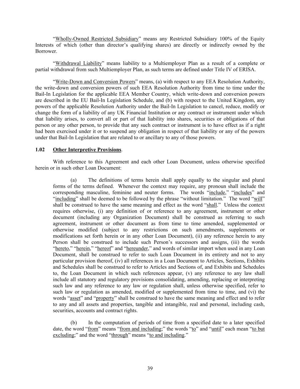 39 “Wholly-Owned Restricted Subsidiary” means any Restricted Subsidiary 100% of the Equity Interests of which (other than director’s qualifying shares) are directly or indirectly owned by the Borrower. “Withdrawal Liability” means liability to a Multiemployer Plan as a result of a complete or partial withdrawal from such Multiemployer Plan, as such terms are defined under Title IV of ERISA. “Write-Down and Conversion Powers” means, (a) with respect to any EEA Resolution Authority, the write-down and conversion powers of such EEA Resolution Authority from time to time under the Bail-In Legislation for the applicable EEA Member Country, which write-down and conversion powers are described in the EU Bail-In Legislation Schedule, and (b) with respect to the United Kingdom, any powers of the applicable Resolution Authority under the Bail-In Legislation to cancel, reduce, modify or change the form of a liability of any UK Financial Institution or any contract or instrument under which that liability arises, to convert all or part of that liability into shares, securities or obligations of that person or any other person, to provide that any such contract or instrument is to have effect as if a right had been exercised under it or to suspend any obligation in respect of that liability or any of the powers under that Bail-In Legislation that are related to or ancillary to any of those powers. 1.02 Other Interpretive Provisions. With reference to this Agreement and each other Loan Document, unless otherwise specified herein or in such other Loan Document: (a) The definitions of terms herein shall apply equally to the singular and plural forms of the terms defined. Whenever the context may require, any pronoun shall include the corresponding masculine, feminine and neuter forms. The words “include,” “includes” and “including” shall be deemed to be followed by the phrase “without limitation.” The word “will” shall be construed to have the same meaning and effect as the word “shall.” Unless the context requires otherwise, (i) any definition of or reference to any agreement, instrument or other document (including any Organization Document) shall be construed as referring to such agreement, instrument or other document as from time to time amended, supplemented or otherwise modified (subject to any restrictions on such amendments, supplements or modifications set forth herein or in any other Loan Document), (ii) any reference herein to any Person shall be construed to include such Person’s successors and assigns, (iii) the words “hereto,” “herein,” “hereof” and “hereunder,” and words of similar import when used in any Loan Document, shall be construed to refer to such Loan Document in its entirety and not to any particular provision thereof, (iv) all references in a Loan Document to Articles, Sections, Exhibits and Schedules shall be construed to refer to Articles and Sections of, and Exhibits and Schedules to, the Loan Document in which such references appear, (v) any reference to any law shall include all statutory and regulatory provisions consolidating, amending, replacing or interpreting such law and any reference to any law or regulation shall, unless otherwise specified, refer to such law or regulation as amended, modified or supplemented from time to time, and (vi) the words “asset” and “property” shall be construed to have the same meaning and effect and to refer to any and all assets and properties, tangible and intangible, real and personal, including cash, securities, accounts and contract rights. (b) In the computation of periods of time from a specified date to a later specified date, the word “from” means “from and including;” the words “to” and “until” each mean “to but excluding;” and the word “through” means “to and including.”