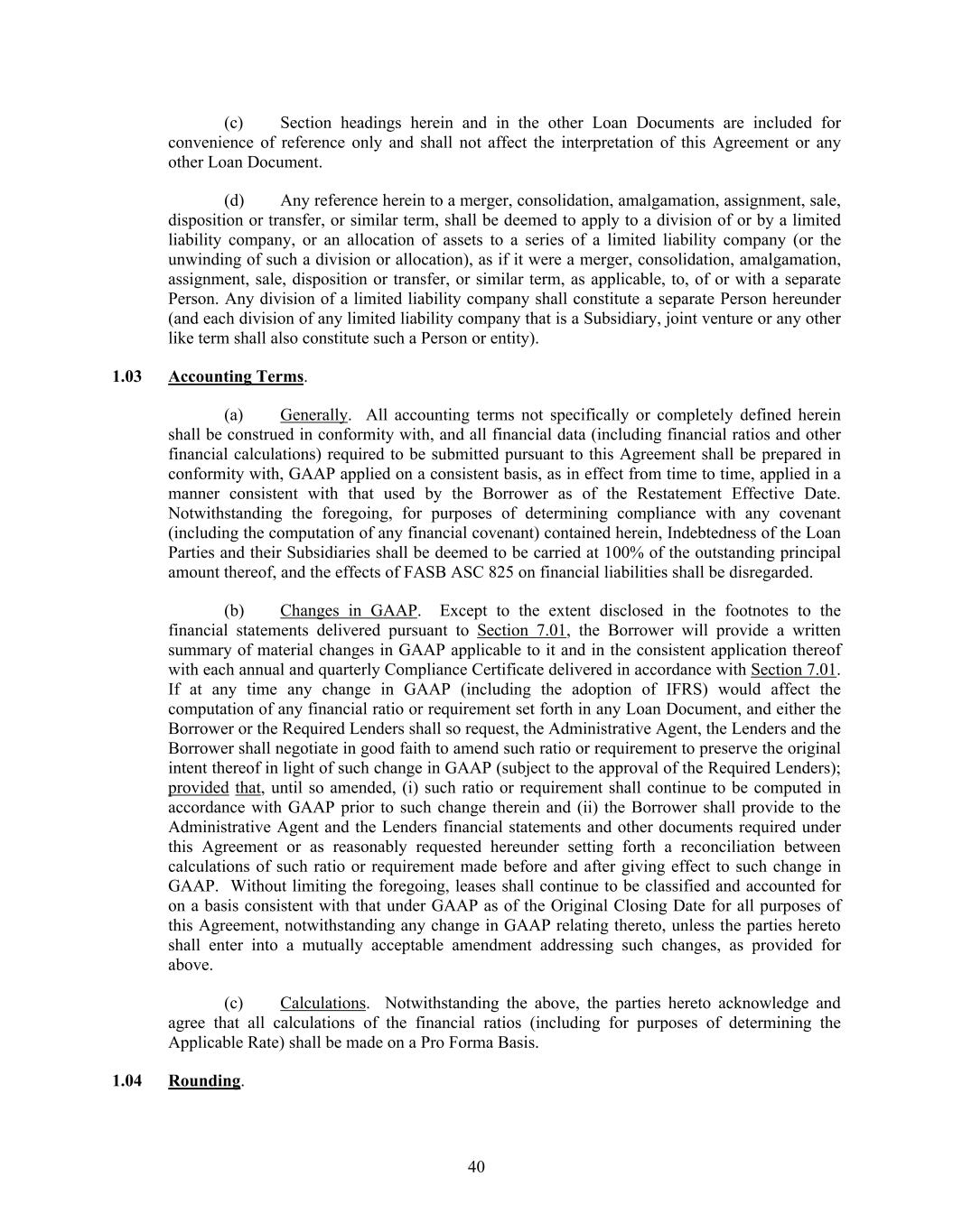 40 (c) Section headings herein and in the other Loan Documents are included for convenience of reference only and shall not affect the interpretation of this Agreement or any other Loan Document. (d) Any reference herein to a merger, consolidation, amalgamation, assignment, sale, disposition or transfer, or similar term, shall be deemed to apply to a division of or by a limited liability company, or an allocation of assets to a series of a limited liability company (or the unwinding of such a division or allocation), as if it were a merger, consolidation, amalgamation, assignment, sale, disposition or transfer, or similar term, as applicable, to, of or with a separate Person. Any division of a limited liability company shall constitute a separate Person hereunder (and each division of any limited liability company that is a Subsidiary, joint venture or any other like term shall also constitute such a Person or entity). 1.03 Accounting Terms. (a) Generally. All accounting terms not specifically or completely defined herein shall be construed in conformity with, and all financial data (including financial ratios and other financial calculations) required to be submitted pursuant to this Agreement shall be prepared in conformity with, GAAP applied on a consistent basis, as in effect from time to time, applied in a manner consistent with that used by the Borrower as of the Restatement Effective Date. Notwithstanding the foregoing, for purposes of determining compliance with any covenant (including the computation of any financial covenant) contained herein, Indebtedness of the Loan Parties and their Subsidiaries shall be deemed to be carried at 100% of the outstanding principal amount thereof, and the effects of FASB ASC 825 on financial liabilities shall be disregarded. (b) Changes in GAAP. Except to the extent disclosed in the footnotes to the financial statements delivered pursuant to Section 7.01, the Borrower will provide a written summary of material changes in GAAP applicable to it and in the consistent application thereof with each annual and quarterly Compliance Certificate delivered in accordance with Section 7.01. If at any time any change in GAAP (including the adoption of IFRS) would affect the computation of any financial ratio or requirement set forth in any Loan Document, and either the Borrower or the Required Lenders shall so request, the Administrative Agent, the Lenders and the Borrower shall negotiate in good faith to amend such ratio or requirement to preserve the original intent thereof in light of such change in GAAP (subject to the approval of the Required Lenders); provided that, until so amended, (i) such ratio or requirement shall continue to be computed in accordance with GAAP prior to such change therein and (ii) the Borrower shall provide to the Administrative Agent and the Lenders financial statements and other documents required under this Agreement or as reasonably requested hereunder setting forth a reconciliation between calculations of such ratio or requirement made before and after giving effect to such change in GAAP. Without limiting the foregoing, leases shall continue to be classified and accounted for on a basis consistent with that under GAAP as of the Original Closing Date for all purposes of this Agreement, notwithstanding any change in GAAP relating thereto, unless the parties hereto shall enter into a mutually acceptable amendment addressing such changes, as provided for above. (c) Calculations. Notwithstanding the above, the parties hereto acknowledge and agree that all calculations of the financial ratios (including for purposes of determining the Applicable Rate) shall be made on a Pro Forma Basis. 1.04 Rounding.