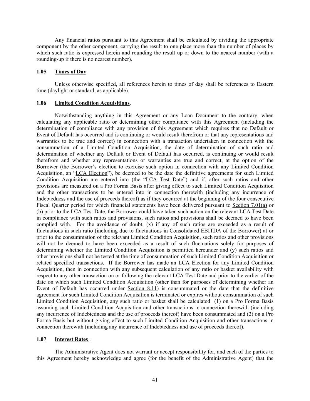 41 Any financial ratios pursuant to this Agreement shall be calculated by dividing the appropriate component by the other component, carrying the result to one place more than the number of places by which such ratio is expressed herein and rounding the result up or down to the nearest number (with a rounding-up if there is no nearest number). 1.05 Times of Day. Unless otherwise specified, all references herein to times of day shall be references to Eastern time (daylight or standard, as applicable). 1.06 Limited Condition Acquisitions. Notwithstanding anything in this Agreement or any Loan Document to the contrary, when calculating any applicable ratio or determining other compliance with this Agreement (including the determination of compliance with any provision of this Agreement which requires that no Default or Event of Default has occurred and is continuing or would result therefrom or that any representations and warranties to be true and correct) in connection with a transaction undertaken in connection with the consummation of a Limited Condition Acquisition, the date of determination of such ratio and determination of whether any Default or Event of Default has occurred, is continuing or would result therefrom and whether any representations or warranties are true and correct, at the option of the Borrower (the Borrower’s election to exercise such option in connection with any Limited Condition Acquisition, an “LCA Election”), be deemed to be the date the definitive agreements for such Limited Condition Acquisition are entered into (the “LCA Test Date”) and if, after such ratios and other provisions are measured on a Pro Forma Basis after giving effect to such Limited Condition Acquisition and the other transactions to be entered into in connection therewith (including any incurrence of Indebtedness and the use of proceeds thereof) as if they occurred at the beginning of the four consecutive Fiscal Quarter period for which financial statements have been delivered pursuant to Section 7.01(a) or (b) prior to the LCA Test Date, the Borrower could have taken such action on the relevant LCA Test Date in compliance with such ratios and provisions, such ratios and provisions shall be deemed to have been complied with. For the avoidance of doubt, (x) if any of such ratios are exceeded as a result of fluctuations in such ratio (including due to fluctuations in Consolidated EBITDA of the Borrower) at or prior to the consummation of the relevant Limited Condition Acquisition, such ratios and other provisions will not be deemed to have been exceeded as a result of such fluctuations solely for purposes of determining whether the Limited Condition Acquisition is permitted hereunder and (y) such ratios and other provisions shall not be tested at the time of consummation of such Limited Condition Acquisition or related specified transactions. If the Borrower has made an LCA Election for any Limited Condition Acquisition, then in connection with any subsequent calculation of any ratio or basket availability with respect to any other transaction on or following the relevant LCA Test Date and prior to the earlier of the date on which such Limited Condition Acquisition (other than for purposes of determining whether an Event of Default has occurred under Section 8.11) is consummated or the date that the definitive agreement for such Limited Condition Acquisition is terminated or expires without consummation of such Limited Condition Acquisition, any such ratio or basket shall be calculated (1) on a Pro Forma Basis assuming such Limited Condition Acquisition and other transactions in connection therewith (including any incurrence of Indebtedness and the use of proceeds thereof) have been consummated and (2) on a Pro Forma Basis but without giving effect to such Limited Condition Acquisition and other transactions in connection therewith (including any incurrence of Indebtedness and use of proceeds thereof). 1.07 Interest Rates . The Administrative Agent does not warrant or accept responsibility for, and each of the parties to this Agreement hereby acknowledge and agree (for the benefit of the Administrative Agent) that the