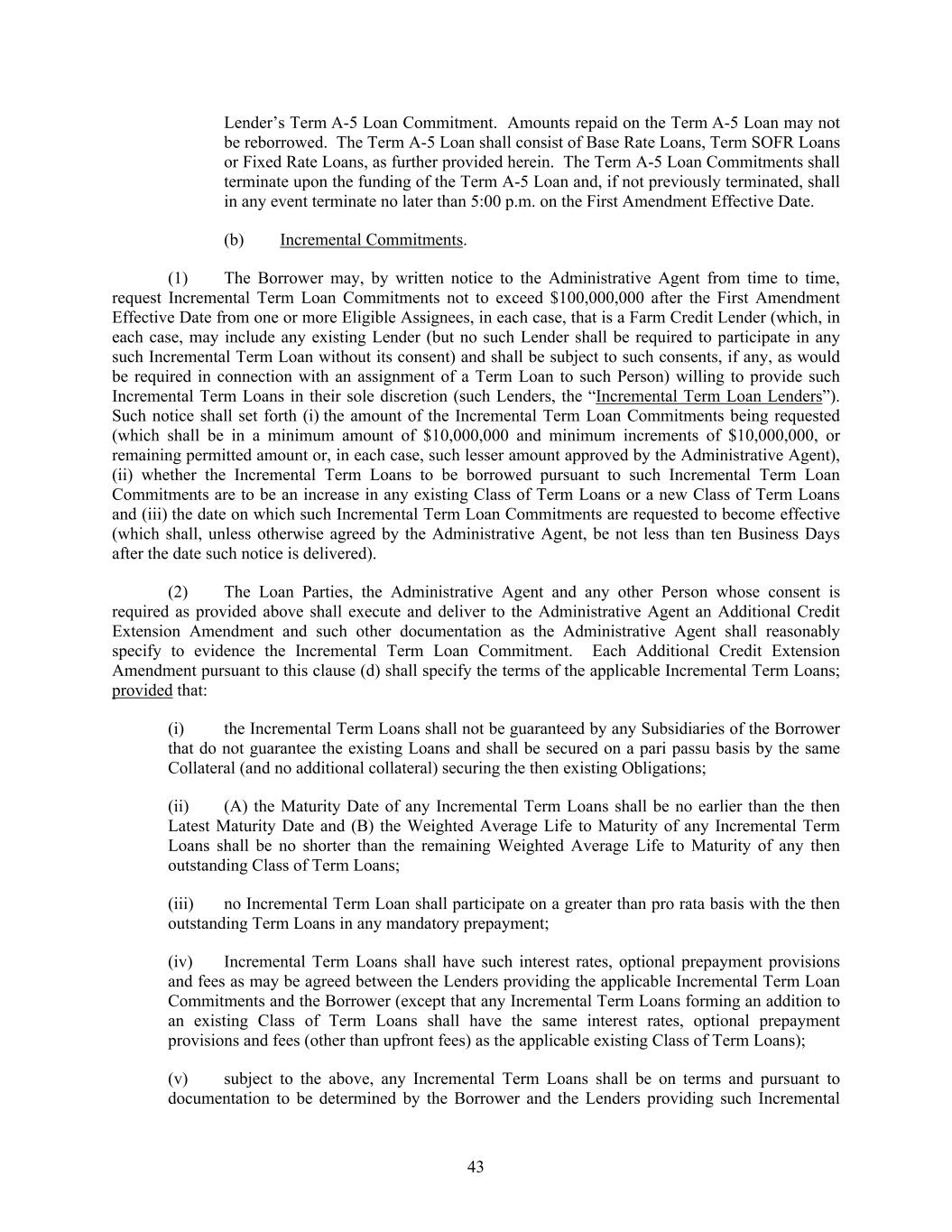 43 Lender’s Term A-5 Loan Commitment. Amounts repaid on the Term A-5 Loan may not be reborrowed. The Term A-5 Loan shall consist of Base Rate Loans, Term SOFR Loans or Fixed Rate Loans, as further provided herein. The Term A-5 Loan Commitments shall terminate upon the funding of the Term A-5 Loan and, if not previously terminated, shall in any event terminate no later than 5:00 p.m. on the First Amendment Effective Date. (b) Incremental Commitments. (1) The Borrower may, by written notice to the Administrative Agent from time to time, request Incremental Term Loan Commitments not to exceed $100,000,000 after the First Amendment Effective Date from one or more Eligible Assignees, in each case, that is a Farm Credit Lender (which, in each case, may include any existing Lender (but no such Lender shall be required to participate in any such Incremental Term Loan without its consent) and shall be subject to such consents, if any, as would be required in connection with an assignment of a Term Loan to such Person) willing to provide such Incremental Term Loans in their sole discretion (such Lenders, the “Incremental Term Loan Lenders”). Such notice shall set forth (i) the amount of the Incremental Term Loan Commitments being requested (which shall be in a minimum amount of $10,000,000 and minimum increments of $10,000,000, or remaining permitted amount or, in each case, such lesser amount approved by the Administrative Agent), (ii) whether the Incremental Term Loans to be borrowed pursuant to such Incremental Term Loan Commitments are to be an increase in any existing Class of Term Loans or a new Class of Term Loans and (iii) the date on which such Incremental Term Loan Commitments are requested to become effective (which shall, unless otherwise agreed by the Administrative Agent, be not less than ten Business Days after the date such notice is delivered). (2) The Loan Parties, the Administrative Agent and any other Person whose consent is required as provided above shall execute and deliver to the Administrative Agent an Additional Credit Extension Amendment and such other documentation as the Administrative Agent shall reasonably specify to evidence the Incremental Term Loan Commitment. Each Additional Credit Extension Amendment pursuant to this clause (d) shall specify the terms of the applicable Incremental Term Loans; provided that: (i) the Incremental Term Loans shall not be guaranteed by any Subsidiaries of the Borrower that do not guarantee the existing Loans and shall be secured on a pari passu basis by the same Collateral (and no additional collateral) securing the then existing Obligations; (ii) (A) the Maturity Date of any Incremental Term Loans shall be no earlier than the then Latest Maturity Date and (B) the Weighted Average Life to Maturity of any Incremental Term Loans shall be no shorter than the remaining Weighted Average Life to Maturity of any then outstanding Class of Term Loans; (iii) no Incremental Term Loan shall participate on a greater than pro rata basis with the then outstanding Term Loans in any mandatory prepayment; (iv) Incremental Term Loans shall have such interest rates, optional prepayment provisions and fees as may be agreed between the Lenders providing the applicable Incremental Term Loan Commitments and the Borrower (except that any Incremental Term Loans forming an addition to an existing Class of Term Loans shall have the same interest rates, optional prepayment provisions and fees (other than upfront fees) as the applicable existing Class of Term Loans); (v) subject to the above, any Incremental Term Loans shall be on terms and pursuant to documentation to be determined by the Borrower and the Lenders providing such Incremental