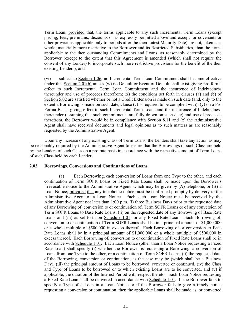 44 Term Loan; provided that, the terms applicable to any such Incremental Term Loans (except pricing, fees, premiums, discounts or as expressly permitted above and except for covenants or other provisions applicable only to periods after the then Latest Maturity Date) are not, taken as a whole, materially more restrictive to the Borrower and its Restricted Subsidiaries, than the terms applicable to the then outstanding Commitments and Loans, as reasonably determined by the Borrower (except to the extent that this Agreement is amended (which shall not require the consent of any Lender) to incorporate such more restrictive provisions for the benefit of the then existing Lenders); and (vi) subject to Section 1.06, no Incremental Term Loan Commitment shall become effective under this Section 2.01(b) unless (w) no Default or Event of Default shall exist giving pro forma effect to such Incremental Term Loan Commitment and the incurrence of Indebtedness thereunder and use of proceeds therefrom; (x) the conditions set forth in clauses (a) and (b) of Section 5.02 are satisfied whether or not a Credit Extension is made on such date (and, only to the extent a Borrowing is made on such date, clause (c) is required to be complied with); (y) on a Pro Forma Basis, giving effect to such Incremental Term Loans and the incurrence of Indebtedness thereunder (assuming that such commitments are fully drawn on such date) and use of proceeds therefrom, the Borrower would be in compliance with Section 8.11 and (z) the Administrative Agent shall have received documents and legal opinions as to such matters as are reasonably requested by the Administrative Agent. Upon any increase of any existing Class of Term Loans, the Lenders shall take any action as may be reasonably required by the Administrative Agent to ensure that the Borrowings of such Class are held by the Lenders of such Class on a pro rata basis in accordance with the respective amount of Term Loans of such Class held by each Lender. 2.02 Borrowings, Conversions and Continuations of Loans. (a) Each Borrowing, each conversion of Loans from one Type to the other, and each continuation of Term SOFR Loans or Fixed Rate Loans shall be made upon the Borrower’s irrevocable notice to the Administrative Agent, which may be given by (A) telephone, or (B) a Loan Notice; provided that any telephonic notice must be confirmed promptly by delivery to the Administrative Agent of a Loan Notice. Each such Loan Notice must be received by the Administrative Agent not later than 1:00 p.m. (i) three Business Days prior to the requested date of any Borrowing of, conversion to or continuation of, Term SOFR Loans or of any conversion of Term SOFR Loans to Base Rate Loans, (ii) on the requested date of any Borrowing of Base Rate Loans and (iii) as set forth on Schedule 1.01 for any Fixed Rate Loan. Each Borrowing of, conversion to or continuation of Term SOFR Loans shall be in a principal amount of $1,000,000 or a whole multiple of $500,000 in excess thereof. Each Borrowing of or conversion to Base Rate Loans shall be in a principal amount of $1,000,000 or a whole multiple of $500,000 in excess thereof. Each Borrowing of, conversion to or continuation of Fixed Rate Loans shall be in accordance with Schedule 1.01. Each Loan Notice (other than a Loan Notice requesting a Fixed Rate Loan) shall specify (i) whether the Borrower is requesting a Borrowing, a conversion of Loans from one Type to the other, or a continuation of Term SOFR Loans, (ii) the requested date of the Borrowing, conversion or continuation, as the case may be (which shall be a Business Day), (iii) the principal amount of Loans to be borrowed, converted or continued, (iv) the Class and Type of Loans to be borrowed or to which existing Loans are to be converted, and (v) if applicable, the duration of the Interest Period with respect thereto. Each Loan Notice requesting a Fixed Rate Loan shall be delivered in accordance with Schedule 1.01. If the Borrower fails to specify a Type of a Loan in a Loan Notice or if the Borrower fails to give a timely notice requesting a conversion or continuation, then the applicable Loans shall be made as, or converted