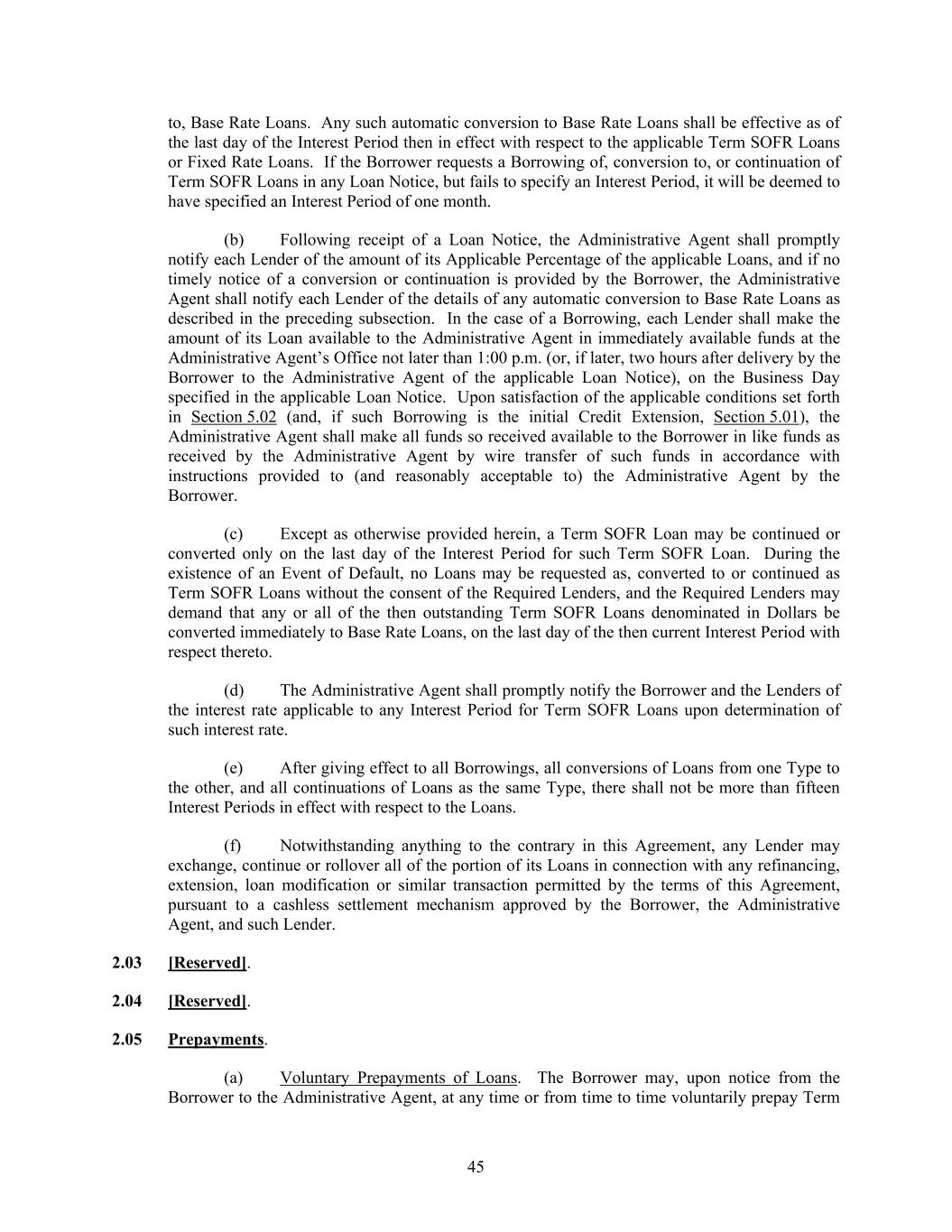45 to, Base Rate Loans. Any such automatic conversion to Base Rate Loans shall be effective as of the last day of the Interest Period then in effect with respect to the applicable Term SOFR Loans or Fixed Rate Loans. If the Borrower requests a Borrowing of, conversion to, or continuation of Term SOFR Loans in any Loan Notice, but fails to specify an Interest Period, it will be deemed to have specified an Interest Period of one month. (b) Following receipt of a Loan Notice, the Administrative Agent shall promptly notify each Lender of the amount of its Applicable Percentage of the applicable Loans, and if no timely notice of a conversion or continuation is provided by the Borrower, the Administrative Agent shall notify each Lender of the details of any automatic conversion to Base Rate Loans as described in the preceding subsection. In the case of a Borrowing, each Lender shall make the amount of its Loan available to the Administrative Agent in immediately available funds at the Administrative Agent’s Office not later than 1:00 p.m. (or, if later, two hours after delivery by the Borrower to the Administrative Agent of the applicable Loan Notice), on the Business Day specified in the applicable Loan Notice. Upon satisfaction of the applicable conditions set forth in Section 5.02 (and, if such Borrowing is the initial Credit Extension, Section 5.01), the Administrative Agent shall make all funds so received available to the Borrower in like funds as received by the Administrative Agent by wire transfer of such funds in accordance with instructions provided to (and reasonably acceptable to) the Administrative Agent by the Borrower. (c) Except as otherwise provided herein, a Term SOFR Loan may be continued or converted only on the last day of the Interest Period for such Term SOFR Loan. During the existence of an Event of Default, no Loans may be requested as, converted to or continued as Term SOFR Loans without the consent of the Required Lenders, and the Required Lenders may demand that any or all of the then outstanding Term SOFR Loans denominated in Dollars be converted immediately to Base Rate Loans, on the last day of the then current Interest Period with respect thereto. (d) The Administrative Agent shall promptly notify the Borrower and the Lenders of the interest rate applicable to any Interest Period for Term SOFR Loans upon determination of such interest rate. (e) After giving effect to all Borrowings, all conversions of Loans from one Type to the other, and all continuations of Loans as the same Type, there shall not be more than fifteen Interest Periods in effect with respect to the Loans. (f) Notwithstanding anything to the contrary in this Agreement, any Lender may exchange, continue or rollover all of the portion of its Loans in connection with any refinancing, extension, loan modification or similar transaction permitted by the terms of this Agreement, pursuant to a cashless settlement mechanism approved by the Borrower, the Administrative Agent, and such Lender. 2.03 [Reserved]. 2.04 [Reserved]. 2.05 Prepayments. (a) Voluntary Prepayments of Loans. The Borrower may, upon notice from the Borrower to the Administrative Agent, at any time or from time to time voluntarily prepay Term