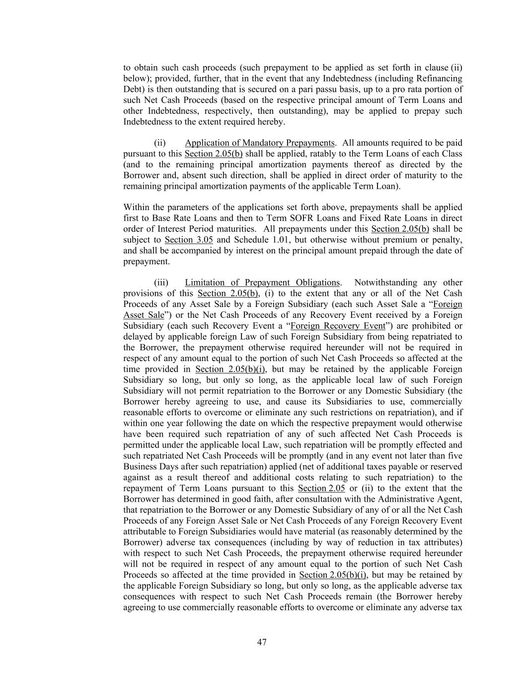 47 to obtain such cash proceeds (such prepayment to be applied as set forth in clause (ii) below); provided, further, that in the event that any Indebtedness (including Refinancing Debt) is then outstanding that is secured on a pari passu basis, up to a pro rata portion of such Net Cash Proceeds (based on the respective principal amount of Term Loans and other Indebtedness, respectively, then outstanding), may be applied to prepay such Indebtedness to the extent required hereby. (ii) Application of Mandatory Prepayments. All amounts required to be paid pursuant to this Section 2.05(b) shall be applied, ratably to the Term Loans of each Class (and to the remaining principal amortization payments thereof as directed by the Borrower and, absent such direction, shall be applied in direct order of maturity to the remaining principal amortization payments of the applicable Term Loan). Within the parameters of the applications set forth above, prepayments shall be applied first to Base Rate Loans and then to Term SOFR Loans and Fixed Rate Loans in direct order of Interest Period maturities. All prepayments under this Section 2.05(b) shall be subject to Section 3.05 and Schedule 1.01, but otherwise without premium or penalty, and shall be accompanied by interest on the principal amount prepaid through the date of prepayment. (iii) Limitation of Prepayment Obligations. Notwithstanding any other provisions of this Section 2.05(b), (i) to the extent that any or all of the Net Cash Proceeds of any Asset Sale by a Foreign Subsidiary (each such Asset Sale a “Foreign Asset Sale”) or the Net Cash Proceeds of any Recovery Event received by a Foreign Subsidiary (each such Recovery Event a “Foreign Recovery Event”) are prohibited or delayed by applicable foreign Law of such Foreign Subsidiary from being repatriated to the Borrower, the prepayment otherwise required hereunder will not be required in respect of any amount equal to the portion of such Net Cash Proceeds so affected at the time provided in Section 2.05(b)(i), but may be retained by the applicable Foreign Subsidiary so long, but only so long, as the applicable local law of such Foreign Subsidiary will not permit repatriation to the Borrower or any Domestic Subsidiary (the Borrower hereby agreeing to use, and cause its Subsidiaries to use, commercially reasonable efforts to overcome or eliminate any such restrictions on repatriation), and if within one year following the date on which the respective prepayment would otherwise have been required such repatriation of any of such affected Net Cash Proceeds is permitted under the applicable local Law, such repatriation will be promptly effected and such repatriated Net Cash Proceeds will be promptly (and in any event not later than five Business Days after such repatriation) applied (net of additional taxes payable or reserved against as a result thereof and additional costs relating to such repatriation) to the repayment of Term Loans pursuant to this Section 2.05 or (ii) to the extent that the Borrower has determined in good faith, after consultation with the Administrative Agent, that repatriation to the Borrower or any Domestic Subsidiary of any of or all the Net Cash Proceeds of any Foreign Asset Sale or Net Cash Proceeds of any Foreign Recovery Event attributable to Foreign Subsidiaries would have material (as reasonably determined by the Borrower) adverse tax consequences (including by way of reduction in tax attributes) with respect to such Net Cash Proceeds, the prepayment otherwise required hereunder will not be required in respect of any amount equal to the portion of such Net Cash Proceeds so affected at the time provided in Section 2.05(b)(i), but may be retained by the applicable Foreign Subsidiary so long, but only so long, as the applicable adverse tax consequences with respect to such Net Cash Proceeds remain (the Borrower hereby agreeing to use commercially reasonable efforts to overcome or eliminate any adverse tax