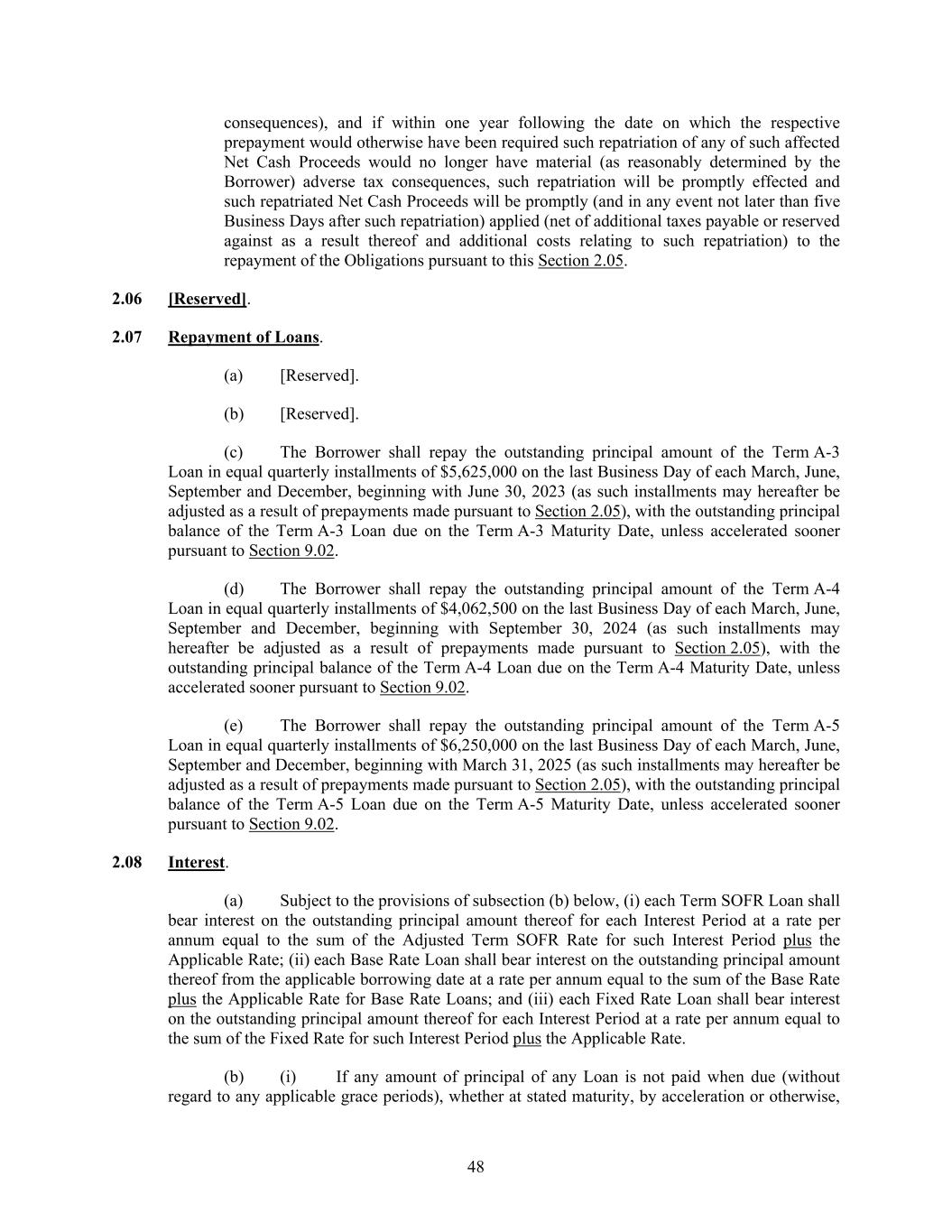 48 consequences), and if within one year following the date on which the respective prepayment would otherwise have been required such repatriation of any of such affected Net Cash Proceeds would no longer have material (as reasonably determined by the Borrower) adverse tax consequences, such repatriation will be promptly effected and such repatriated Net Cash Proceeds will be promptly (and in any event not later than five Business Days after such repatriation) applied (net of additional taxes payable or reserved against as a result thereof and additional costs relating to such repatriation) to the repayment of the Obligations pursuant to this Section 2.05. 2.06 [Reserved]. 2.07 Repayment of Loans. (a) [Reserved]. (b) [Reserved]. (c) The Borrower shall repay the outstanding principal amount of the Term A-3 Loan in equal quarterly installments of $5,625,000 on the last Business Day of each March, June, September and December, beginning with June 30, 2023 (as such installments may hereafter be adjusted as a result of prepayments made pursuant to Section 2.05), with the outstanding principal balance of the Term A-3 Loan due on the Term A-3 Maturity Date, unless accelerated sooner pursuant to Section 9.02. (d) The Borrower shall repay the outstanding principal amount of the Term A-4 Loan in equal quarterly installments of $4,062,500 on the last Business Day of each March, June, September and December, beginning with September 30, 2024 (as such installments may hereafter be adjusted as a result of prepayments made pursuant to Section 2.05), with the outstanding principal balance of the Term A-4 Loan due on the Term A-4 Maturity Date, unless accelerated sooner pursuant to Section 9.02. (e) The Borrower shall repay the outstanding principal amount of the Term A-5 Loan in equal quarterly installments of $6,250,000 on the last Business Day of each March, June, September and December, beginning with March 31, 2025 (as such installments may hereafter be adjusted as a result of prepayments made pursuant to Section 2.05), with the outstanding principal balance of the Term A-5 Loan due on the Term A-5 Maturity Date, unless accelerated sooner pursuant to Section 9.02. 2.08 Interest. (a) Subject to the provisions of subsection (b) below, (i) each Term SOFR Loan shall bear interest on the outstanding principal amount thereof for each Interest Period at a rate per annum equal to the sum of the Adjusted Term SOFR Rate for such Interest Period plus the Applicable Rate; (ii) each Base Rate Loan shall bear interest on the outstanding principal amount thereof from the applicable borrowing date at a rate per annum equal to the sum of the Base Rate plus the Applicable Rate for Base Rate Loans; and (iii) each Fixed Rate Loan shall bear interest on the outstanding principal amount thereof for each Interest Period at a rate per annum equal to the sum of the Fixed Rate for such Interest Period plus the Applicable Rate. (b) (i) If any amount of principal of any Loan is not paid when due (without regard to any applicable grace periods), whether at stated maturity, by acceleration or otherwise,