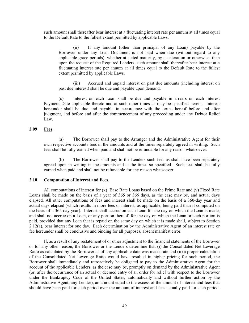 49 such amount shall thereafter bear interest at a fluctuating interest rate per annum at all times equal to the Default Rate to the fullest extent permitted by applicable Laws. (ii) If any amount (other than principal of any Loan) payable by the Borrower under any Loan Document is not paid when due (without regard to any applicable grace periods), whether at stated maturity, by acceleration or otherwise, then upon the request of the Required Lenders, such amount shall thereafter bear interest at a fluctuating interest rate per annum at all times equal to the Default Rate to the fullest extent permitted by applicable Laws. (iii) Accrued and unpaid interest on past due amounts (including interest on past due interest) shall be due and payable upon demand. (c) Interest on each Loan shall be due and payable in arrears on each Interest Payment Date applicable thereto and at such other times as may be specified herein. Interest hereunder shall be due and payable in accordance with the terms hereof before and after judgment, and before and after the commencement of any proceeding under any Debtor Relief Law. 2.09 Fees. (a) The Borrower shall pay to the Arranger and the Administrative Agent for their own respective accounts fees in the amounts and at the times separately agreed in writing. Such fees shall be fully earned when paid and shall not be refundable for any reason whatsoever. (b) The Borrower shall pay to the Lenders such fees as shall have been separately agreed upon in writing in the amounts and at the times so specified. Such fees shall be fully earned when paid and shall not be refundable for any reason whatsoever. 2.10 Computation of Interest and Fees. All computations of interest for (x) Base Rate Loans based on the Prime Rate and (y) Fixed Rate Loans shall be made on the basis of a year of 365 or 366 days, as the case may be, and actual days elapsed. All other computations of fees and interest shall be made on the basis of a 360-day year and actual days elapsed (which results in more fees or interest, as applicable, being paid than if computed on the basis of a 365-day year). Interest shall accrue on each Loan for the day on which the Loan is made, and shall not accrue on a Loan, or any portion thereof, for the day on which the Loan or such portion is paid, provided that any Loan that is repaid on the same day on which it is made shall, subject to Section 2.12(a), bear interest for one day. Each determination by the Administrative Agent of an interest rate or fee hereunder shall be conclusive and binding for all purposes, absent manifest error. If, as a result of any restatement of or other adjustment to the financial statements of the Borrower or for any other reason, the Borrower or the Lenders determine that (i) the Consolidated Net Leverage Ratio as calculated by the Borrower as of any applicable date was inaccurate and (ii) a proper calculation of the Consolidated Net Leverage Ratio would have resulted in higher pricing for such period, the Borrower shall immediately and retroactively be obligated to pay to the Administrative Agent for the account of the applicable Lenders, as the case may be, promptly on demand by the Administrative Agent (or, after the occurrence of an actual or deemed entry of an order for relief with respect to the Borrower under the Bankruptcy Code of the United States, automatically and without further action by the Administrative Agent, any Lender), an amount equal to the excess of the amount of interest and fees that should have been paid for such period over the amount of interest and fees actually paid for such period.