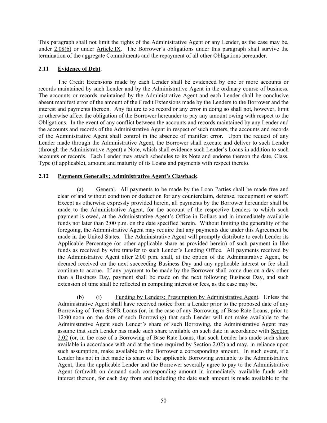 50 This paragraph shall not limit the rights of the Administrative Agent or any Lender, as the case may be, under 2.08(b) or under Article IX. The Borrower’s obligations under this paragraph shall survive the termination of the aggregate Commitments and the repayment of all other Obligations hereunder. 2.11 Evidence of Debt. The Credit Extensions made by each Lender shall be evidenced by one or more accounts or records maintained by such Lender and by the Administrative Agent in the ordinary course of business. The accounts or records maintained by the Administrative Agent and each Lender shall be conclusive absent manifest error of the amount of the Credit Extensions made by the Lenders to the Borrower and the interest and payments thereon. Any failure to so record or any error in doing so shall not, however, limit or otherwise affect the obligation of the Borrower hereunder to pay any amount owing with respect to the Obligations. In the event of any conflict between the accounts and records maintained by any Lender and the accounts and records of the Administrative Agent in respect of such matters, the accounts and records of the Administrative Agent shall control in the absence of manifest error. Upon the request of any Lender made through the Administrative Agent, the Borrower shall execute and deliver to such Lender (through the Administrative Agent) a Note, which shall evidence such Lender’s Loans in addition to such accounts or records. Each Lender may attach schedules to its Note and endorse thereon the date, Class, Type (if applicable), amount and maturity of its Loans and payments with respect thereto. 2.12 Payments Generally; Administrative Agent’s Clawback. (a) General. All payments to be made by the Loan Parties shall be made free and clear of and without condition or deduction for any counterclaim, defense, recoupment or setoff. Except as otherwise expressly provided herein, all payments by the Borrower hereunder shall be made to the Administrative Agent, for the account of the respective Lenders to which such payment is owed, at the Administrative Agent’s Office in Dollars and in immediately available funds not later than 2:00 p.m. on the date specified herein. Without limiting the generality of the foregoing, the Administrative Agent may require that any payments due under this Agreement be made in the United States. The Administrative Agent will promptly distribute to each Lender its Applicable Percentage (or other applicable share as provided herein) of such payment in like funds as received by wire transfer to such Lender’s Lending Office. All payments received by the Administrative Agent after 2:00 p.m. shall, at the option of the Administrative Agent, be deemed received on the next succeeding Business Day and any applicable interest or fee shall continue to accrue. If any payment to be made by the Borrower shall come due on a day other than a Business Day, payment shall be made on the next following Business Day, and such extension of time shall be reflected in computing interest or fees, as the case may be. (b) (i) Funding by Lenders; Presumption by Administrative Agent. Unless the Administrative Agent shall have received notice from a Lender prior to the proposed date of any Borrowing of Term SOFR Loans (or, in the case of any Borrowing of Base Rate Loans, prior to 12:00 noon on the date of such Borrowing) that such Lender will not make available to the Administrative Agent such Lender’s share of such Borrowing, the Administrative Agent may assume that such Lender has made such share available on such date in accordance with Section 2.02 (or, in the case of a Borrowing of Base Rate Loans, that such Lender has made such share available in accordance with and at the time required by Section 2.02) and may, in reliance upon such assumption, make available to the Borrower a corresponding amount. In such event, if a Lender has not in fact made its share of the applicable Borrowing available to the Administrative Agent, then the applicable Lender and the Borrower severally agree to pay to the Administrative Agent forthwith on demand such corresponding amount in immediately available funds with interest thereon, for each day from and including the date such amount is made available to the