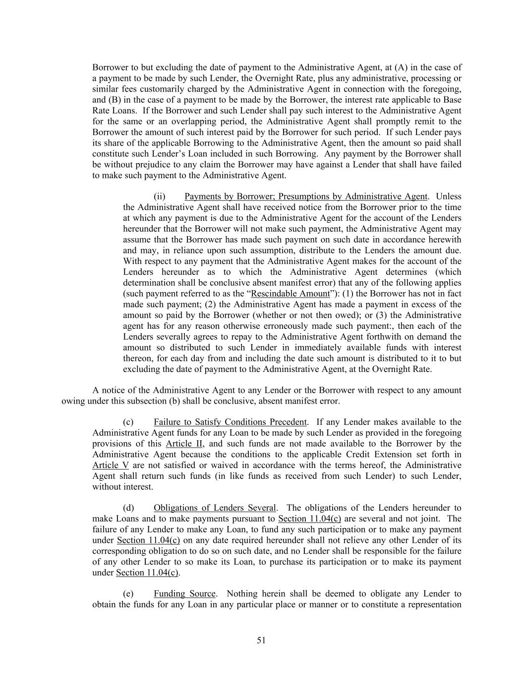 51 Borrower to but excluding the date of payment to the Administrative Agent, at (A) in the case of a payment to be made by such Lender, the Overnight Rate, plus any administrative, processing or similar fees customarily charged by the Administrative Agent in connection with the foregoing, and (B) in the case of a payment to be made by the Borrower, the interest rate applicable to Base Rate Loans. If the Borrower and such Lender shall pay such interest to the Administrative Agent for the same or an overlapping period, the Administrative Agent shall promptly remit to the Borrower the amount of such interest paid by the Borrower for such period. If such Lender pays its share of the applicable Borrowing to the Administrative Agent, then the amount so paid shall constitute such Lender’s Loan included in such Borrowing. Any payment by the Borrower shall be without prejudice to any claim the Borrower may have against a Lender that shall have failed to make such payment to the Administrative Agent. (ii) Payments by Borrower; Presumptions by Administrative Agent. Unless the Administrative Agent shall have received notice from the Borrower prior to the time at which any payment is due to the Administrative Agent for the account of the Lenders hereunder that the Borrower will not make such payment, the Administrative Agent may assume that the Borrower has made such payment on such date in accordance herewith and may, in reliance upon such assumption, distribute to the Lenders the amount due. With respect to any payment that the Administrative Agent makes for the account of the Lenders hereunder as to which the Administrative Agent determines (which determination shall be conclusive absent manifest error) that any of the following applies (such payment referred to as the “Rescindable Amount”): (1) the Borrower has not in fact made such payment; (2) the Administrative Agent has made a payment in excess of the amount so paid by the Borrower (whether or not then owed); or (3) the Administrative agent has for any reason otherwise erroneously made such payment:, then each of the Lenders severally agrees to repay to the Administrative Agent forthwith on demand the amount so distributed to such Lender in immediately available funds with interest thereon, for each day from and including the date such amount is distributed to it to but excluding the date of payment to the Administrative Agent, at the Overnight Rate. A notice of the Administrative Agent to any Lender or the Borrower with respect to any amount owing under this subsection (b) shall be conclusive, absent manifest error. (c) Failure to Satisfy Conditions Precedent. If any Lender makes available to the Administrative Agent funds for any Loan to be made by such Lender as provided in the foregoing provisions of this Article II, and such funds are not made available to the Borrower by the Administrative Agent because the conditions to the applicable Credit Extension set forth in Article V are not satisfied or waived in accordance with the terms hereof, the Administrative Agent shall return such funds (in like funds as received from such Lender) to such Lender, without interest. (d) Obligations of Lenders Several. The obligations of the Lenders hereunder to make Loans and to make payments pursuant to Section 11.04(c) are several and not joint. The failure of any Lender to make any Loan, to fund any such participation or to make any payment under Section 11.04(c) on any date required hereunder shall not relieve any other Lender of its corresponding obligation to do so on such date, and no Lender shall be responsible for the failure of any other Lender to so make its Loan, to purchase its participation or to make its payment under Section 11.04(c). (e) Funding Source. Nothing herein shall be deemed to obligate any Lender to obtain the funds for any Loan in any particular place or manner or to constitute a representation